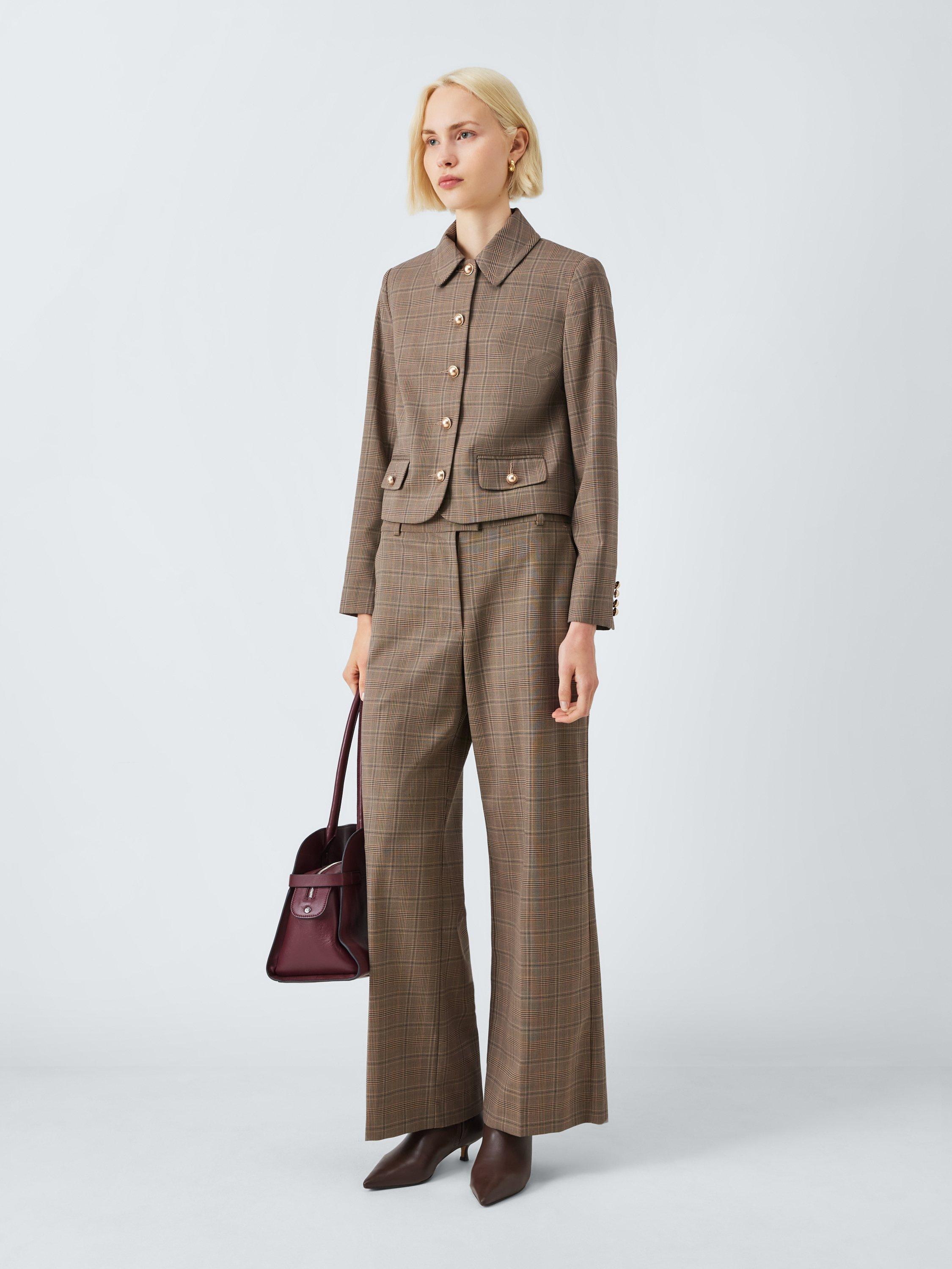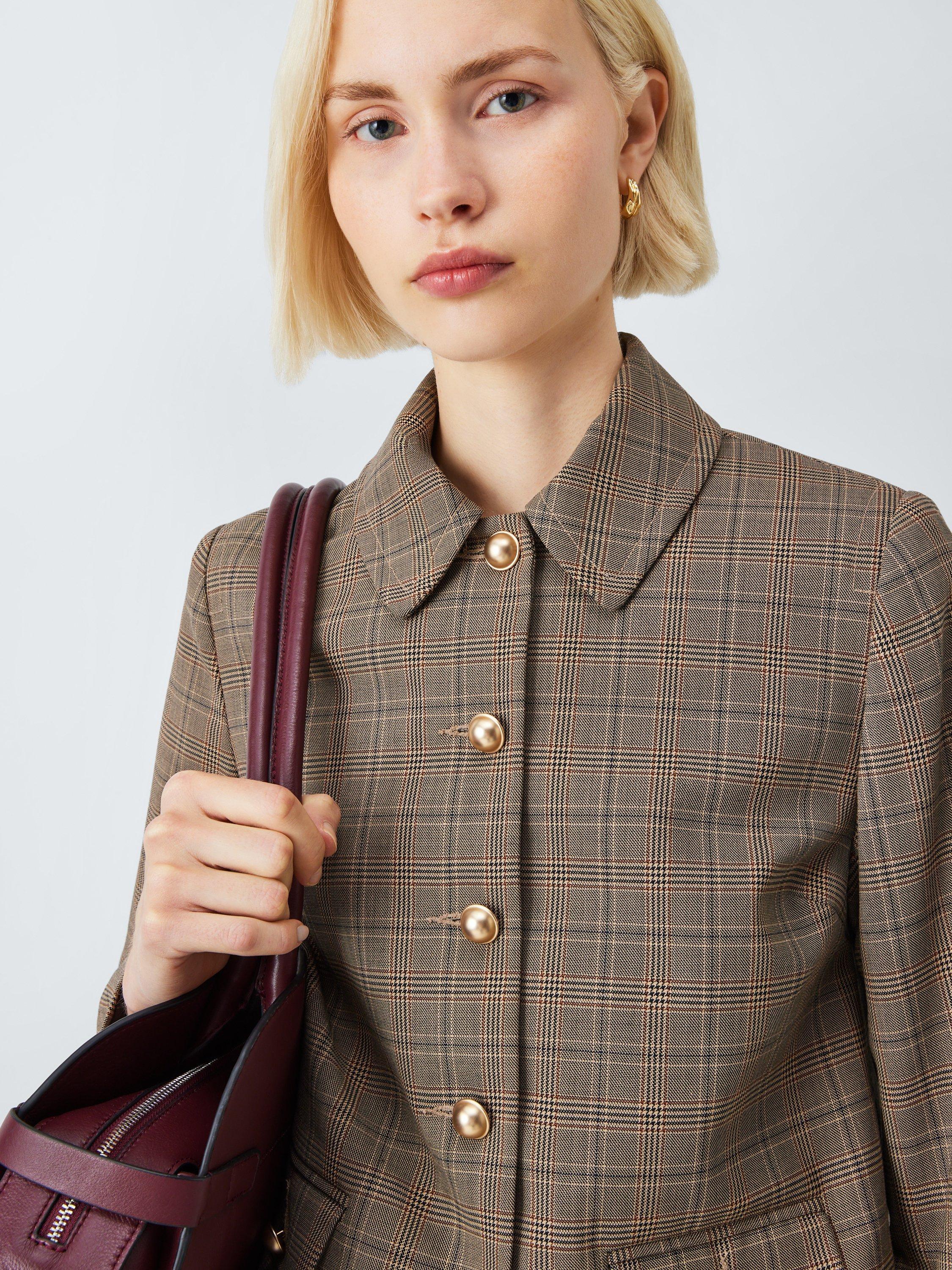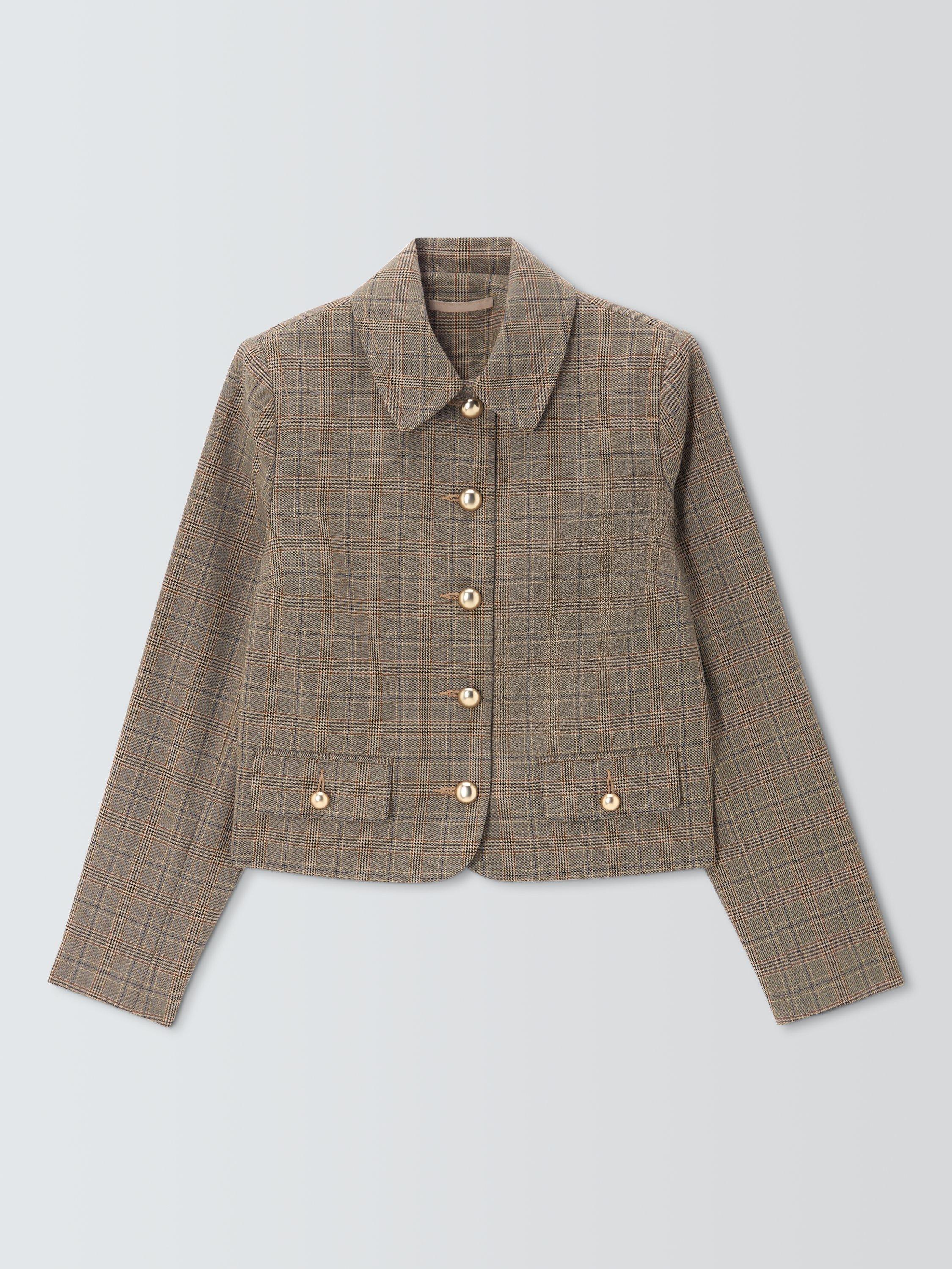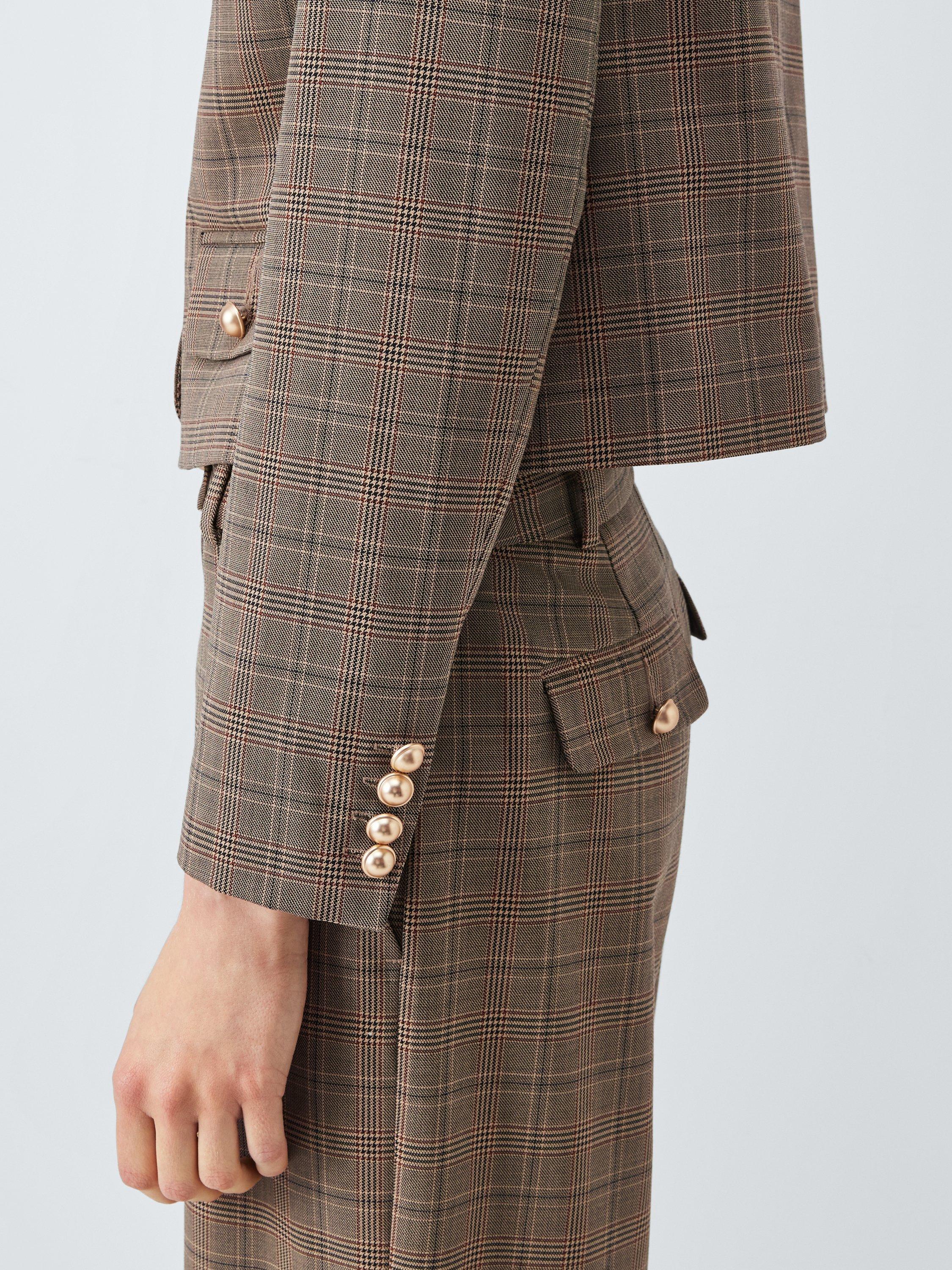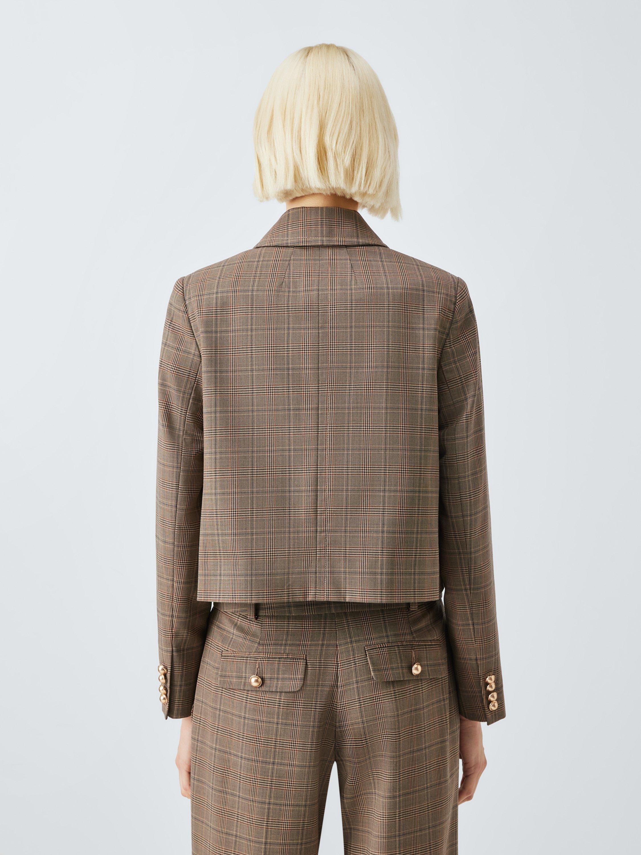 Cropped-length, single-breasted, check-patterned jacket with a collar and curved hem. The button-down front, front welt pockets and cuffs feature polished domed buttons. An updated take on a heritage look, team it with the matching trousers.