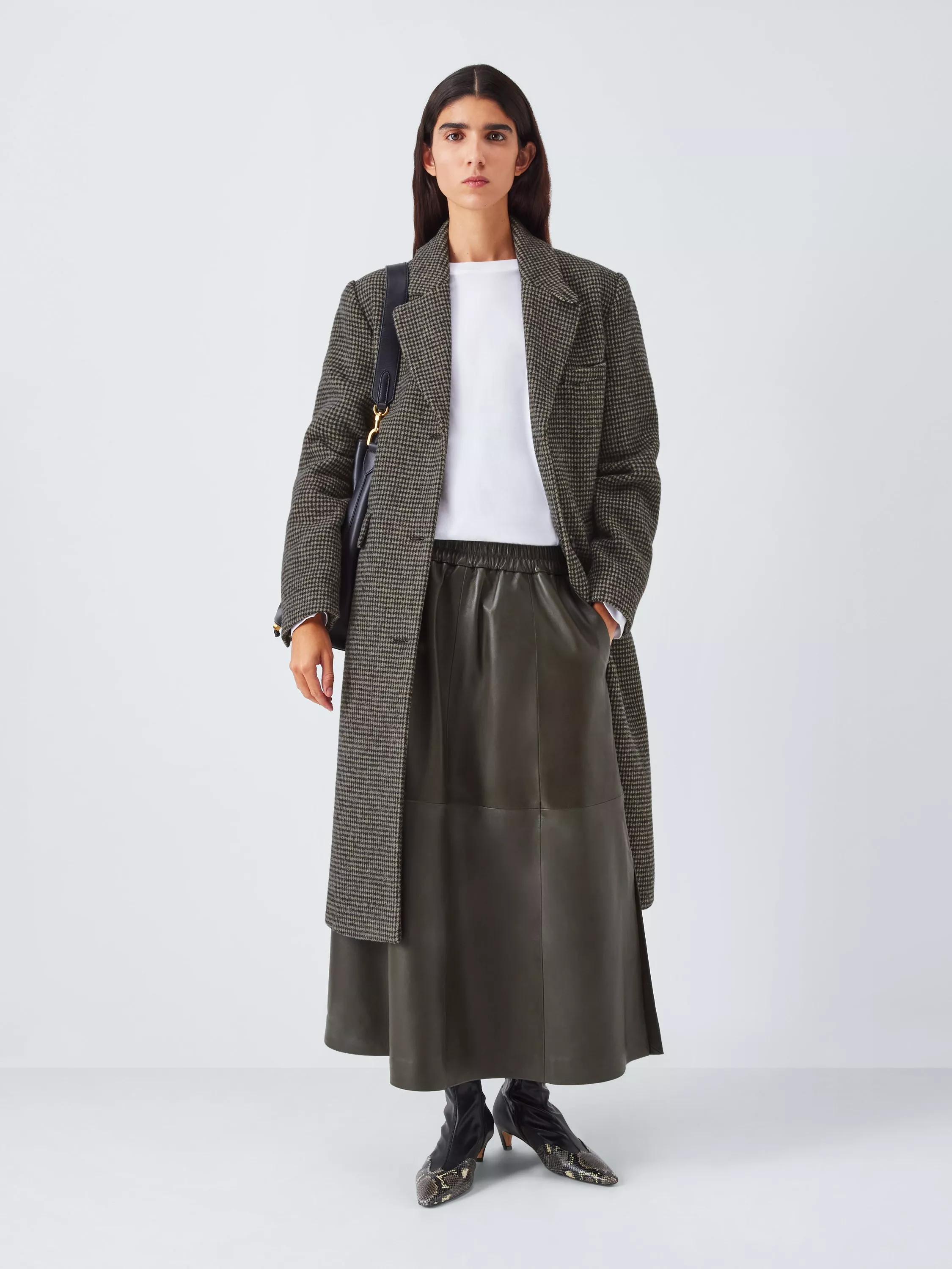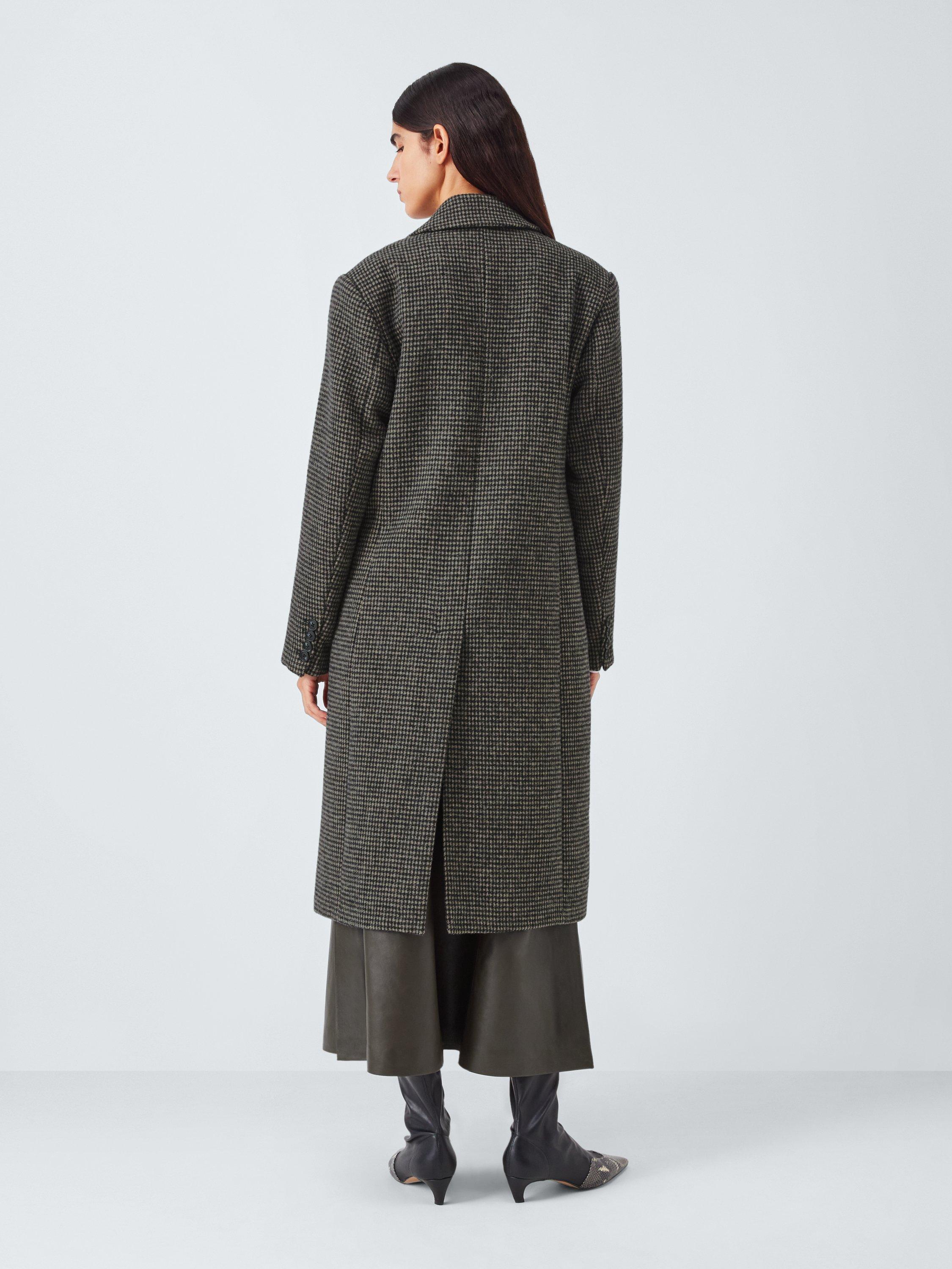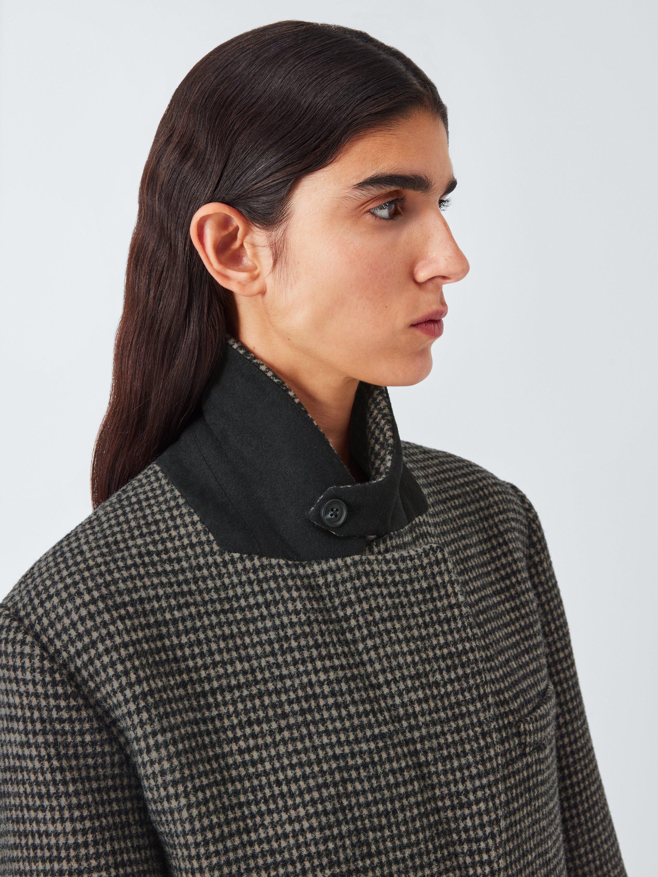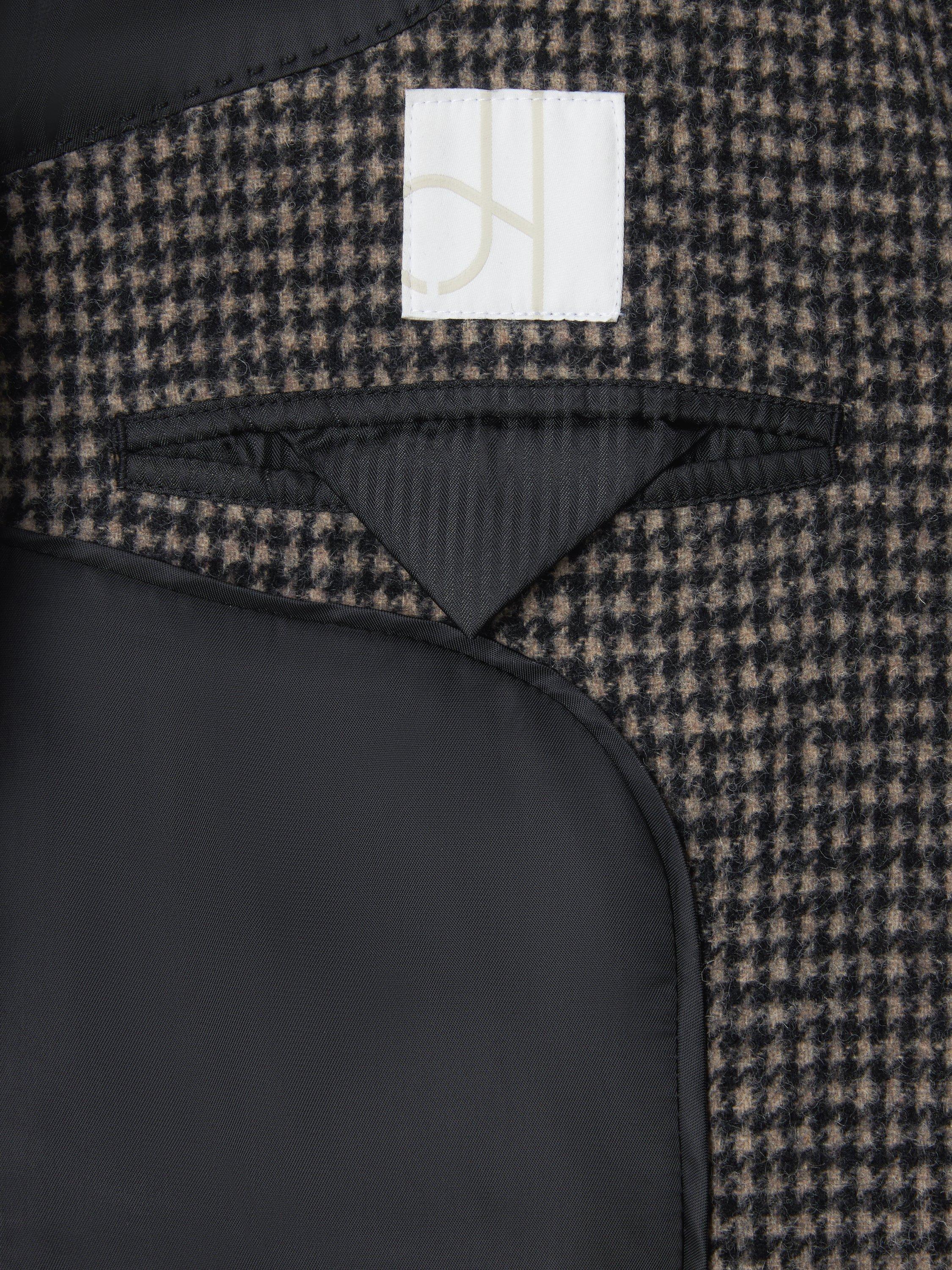 A simple, single-breasted coat rendered from a soft wool-blend fabric and finished with a subtle check pattern.