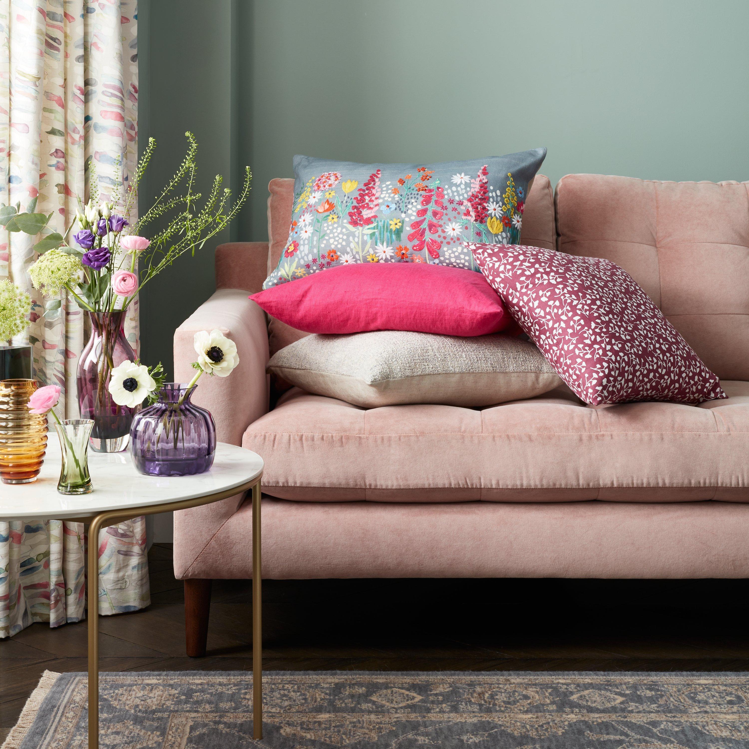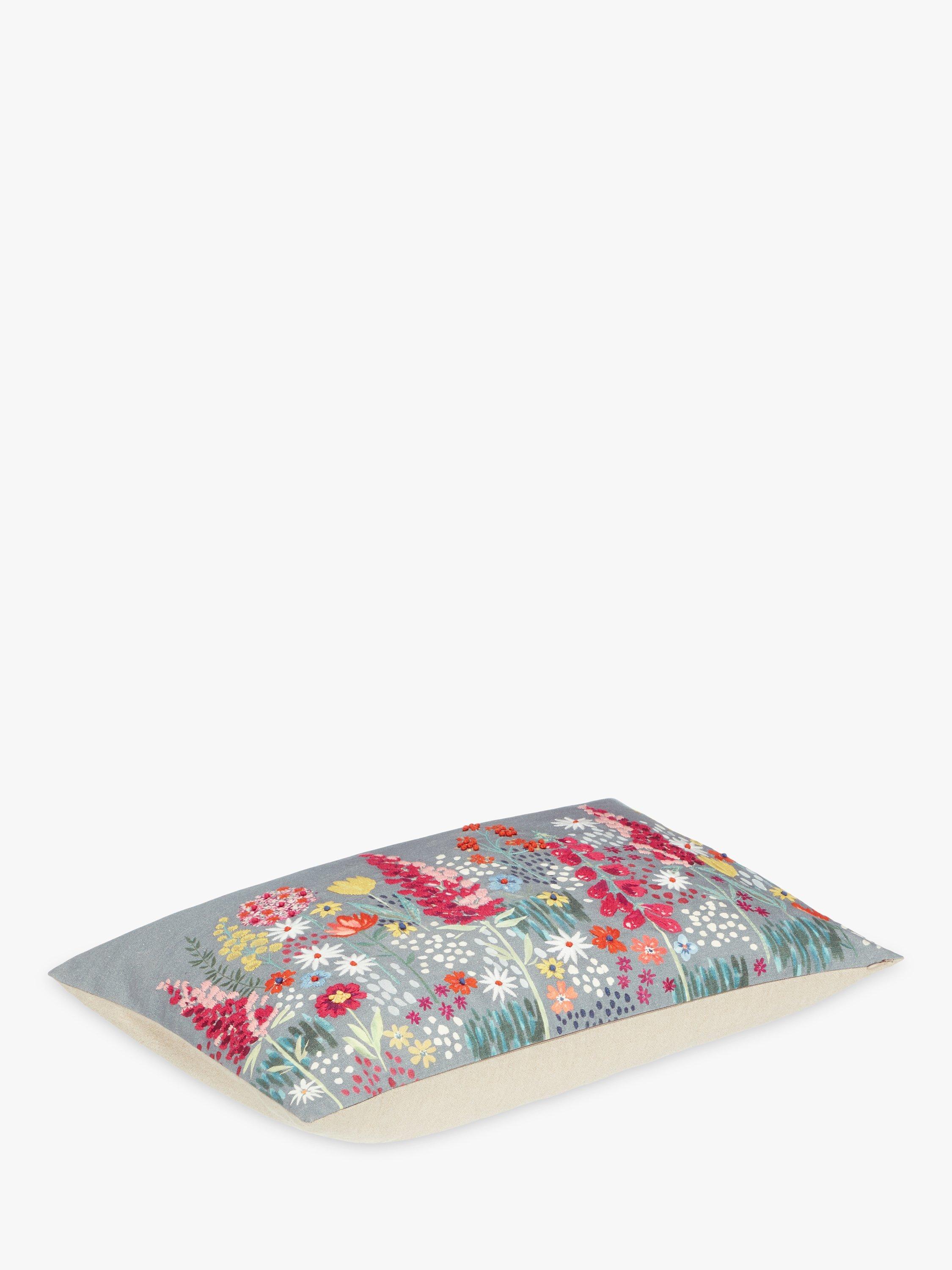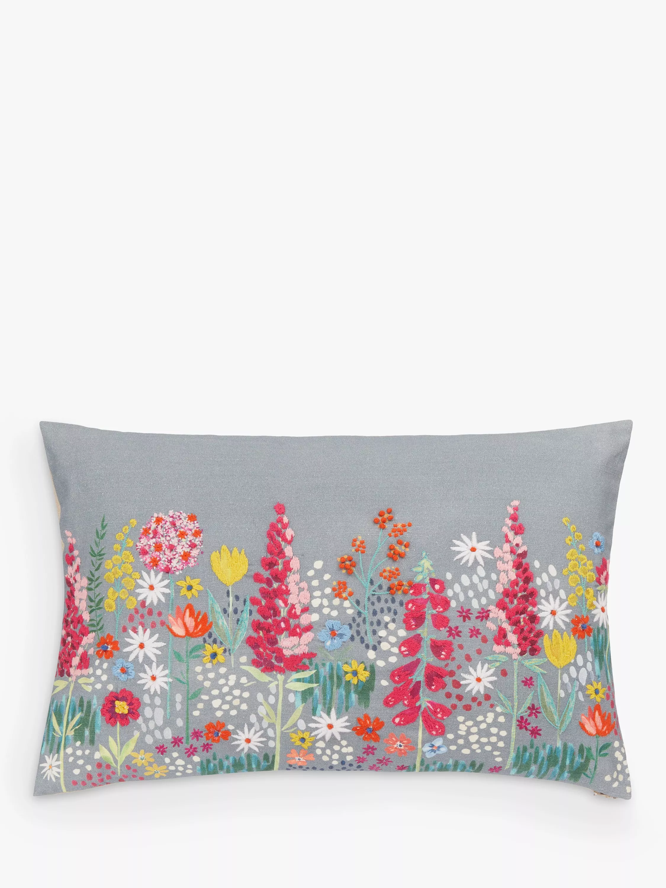 This pretty, embroidered cushion depicts a garden border filled with hollyhocks, Marguerites and other flowers.