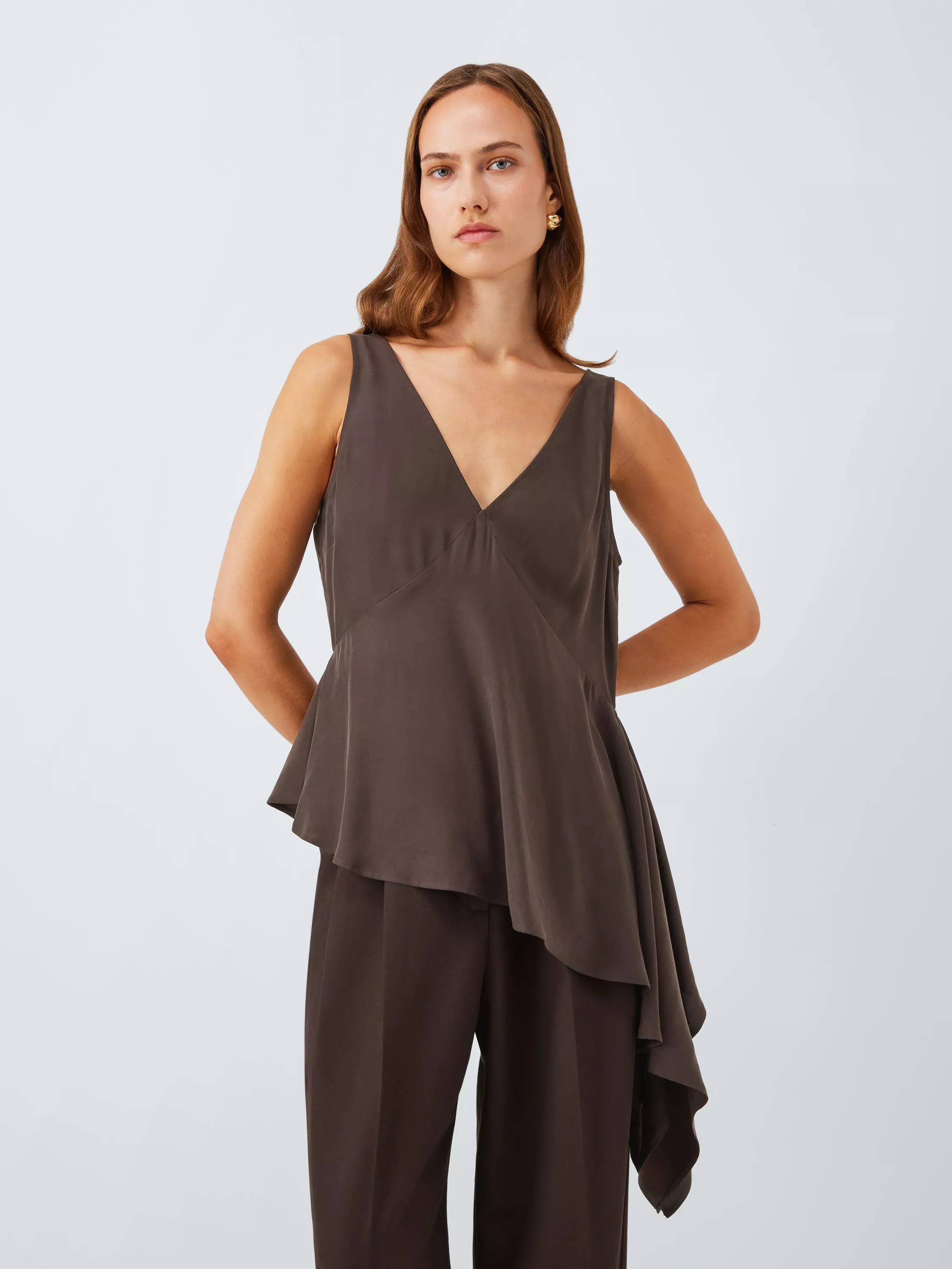 Sleeveless V-neck top with a modern asymmetric ruffle detail. The fabric drapes beautifully to make the most of this design.