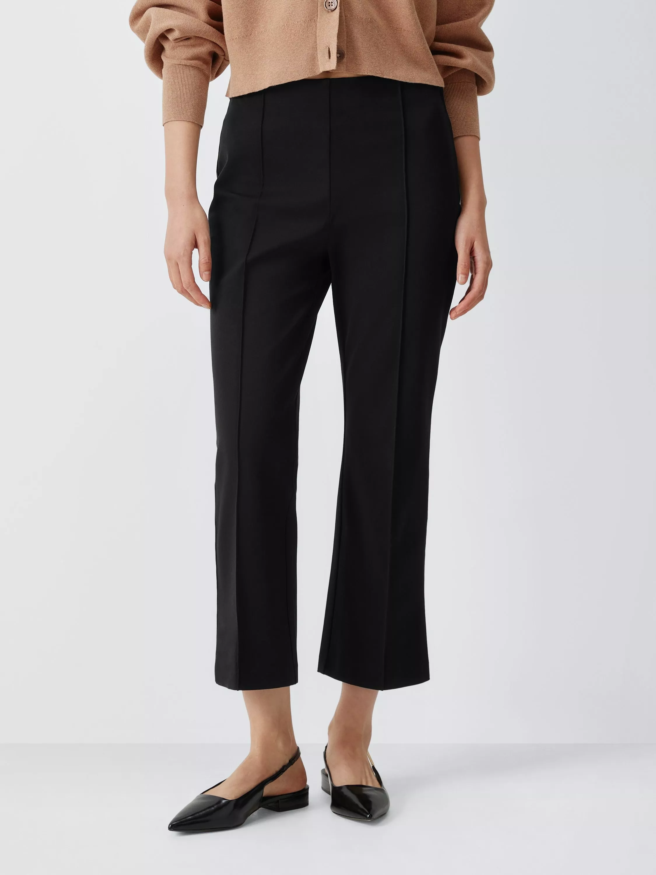 Bootcut cropped trousers with a pleat detail. Made from a soft cotton and viscose blend with stretch for comfortable wear. The bootcut fit runs close to the body from the waist to the knee, and then gradually widens from the knee down to the ankle to accommodate ankle boots or shoes.