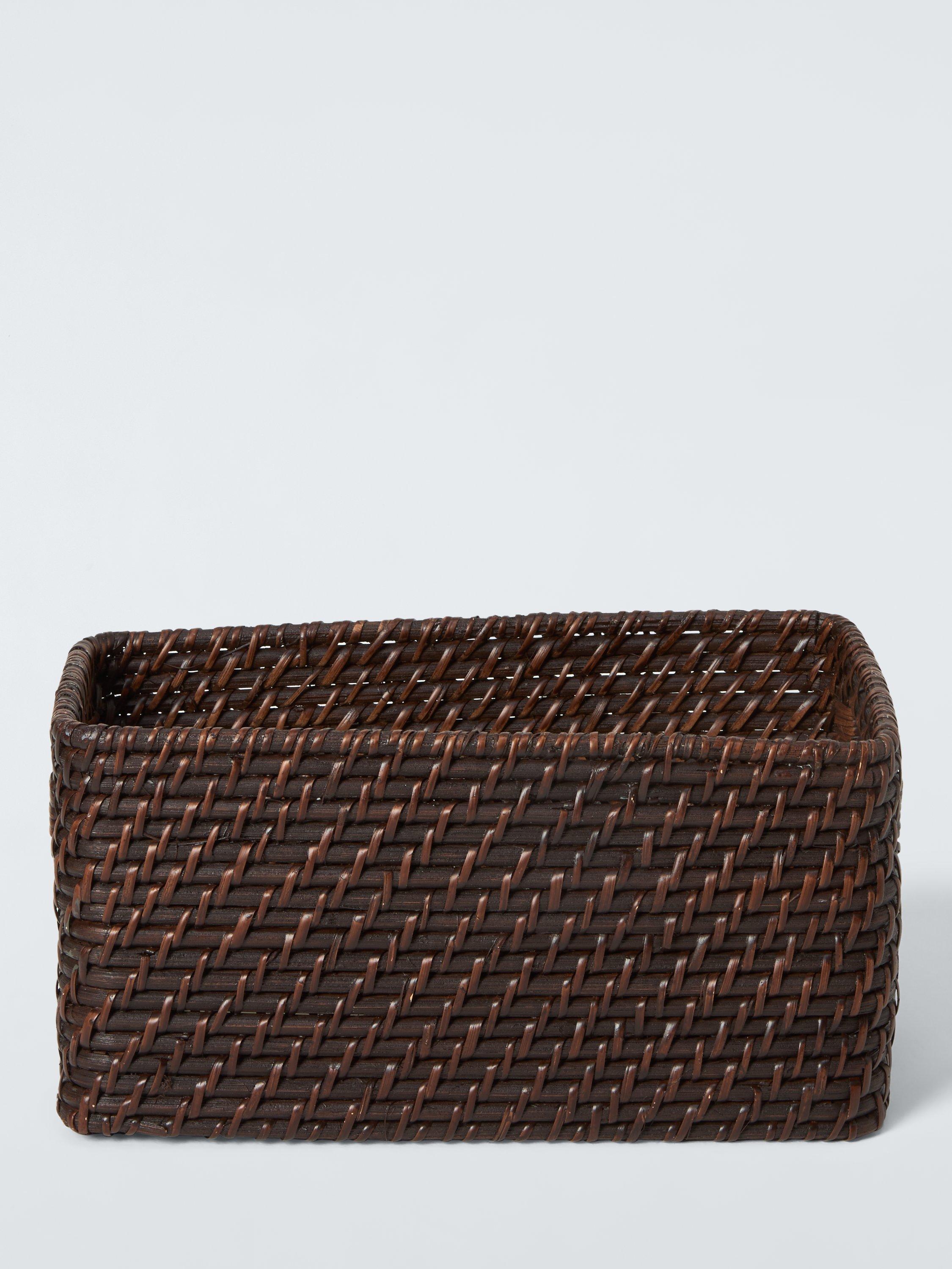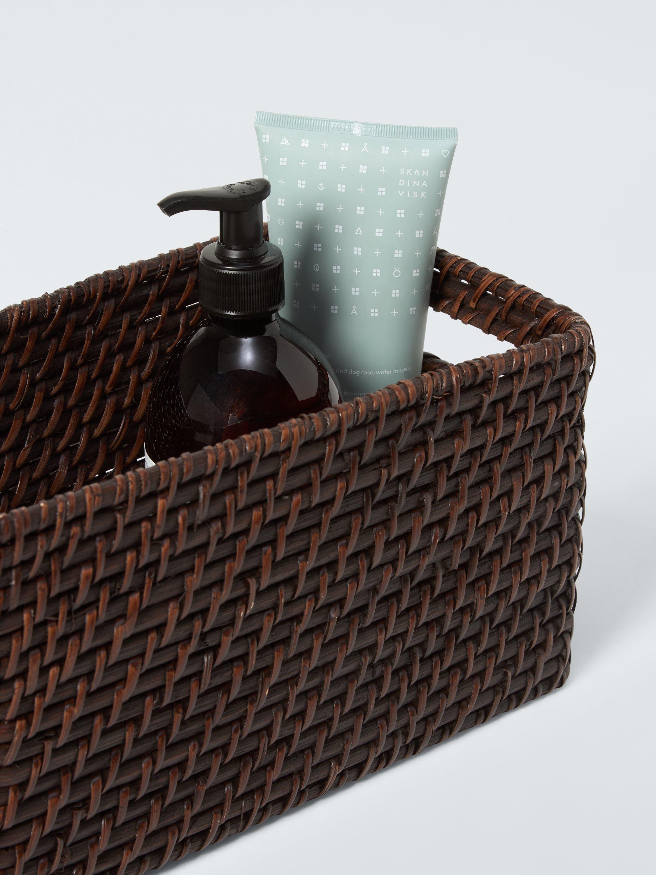 This rattan basket is perfect for neatly storing accessories in your bedroom or bathroom and comes with handles for convenience.