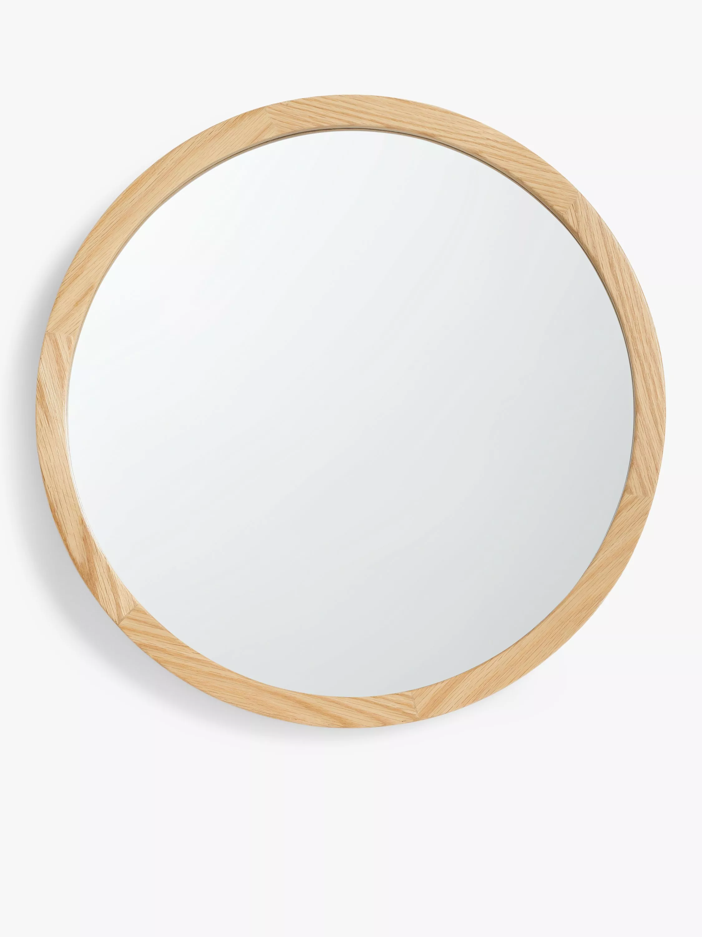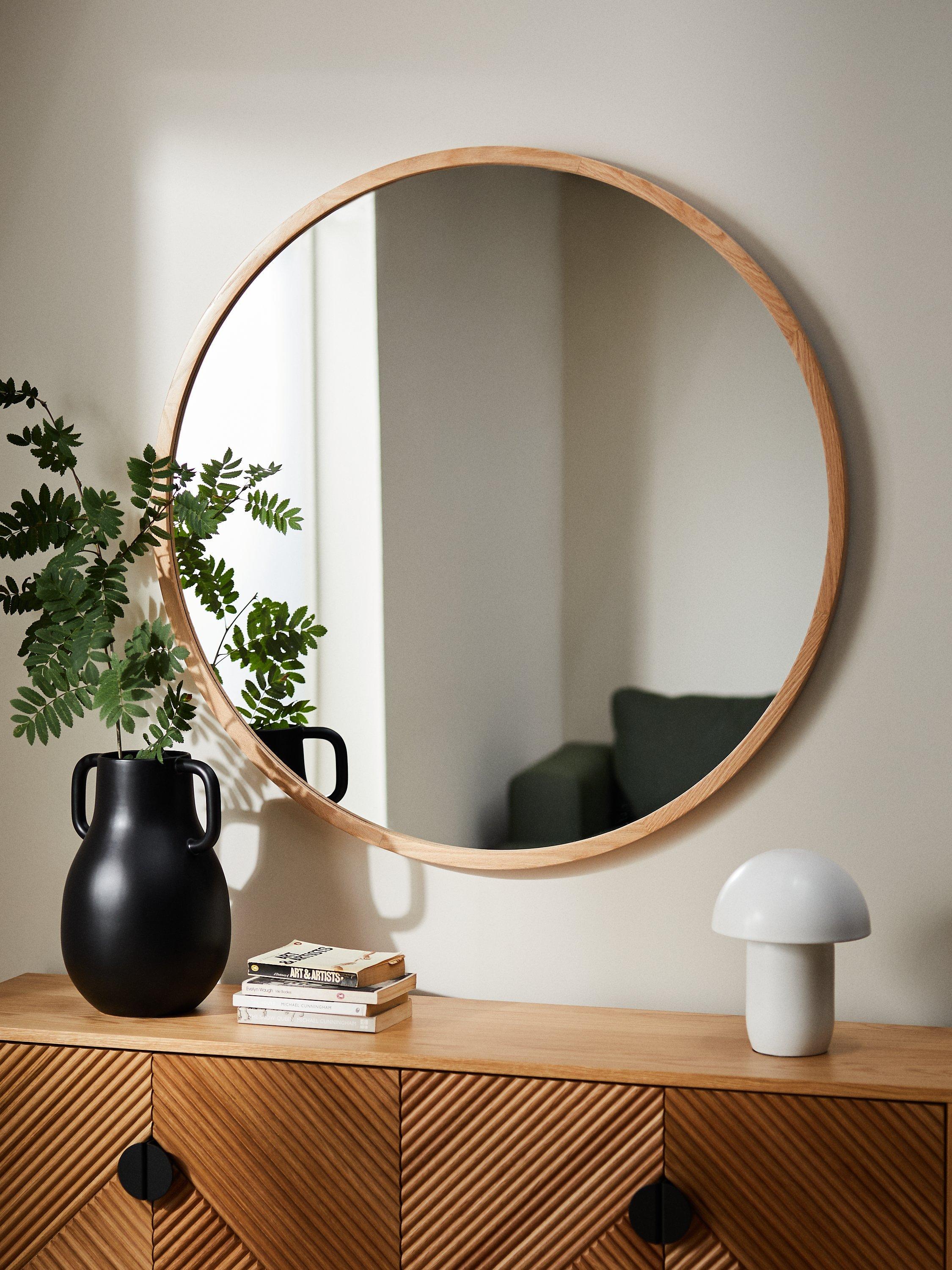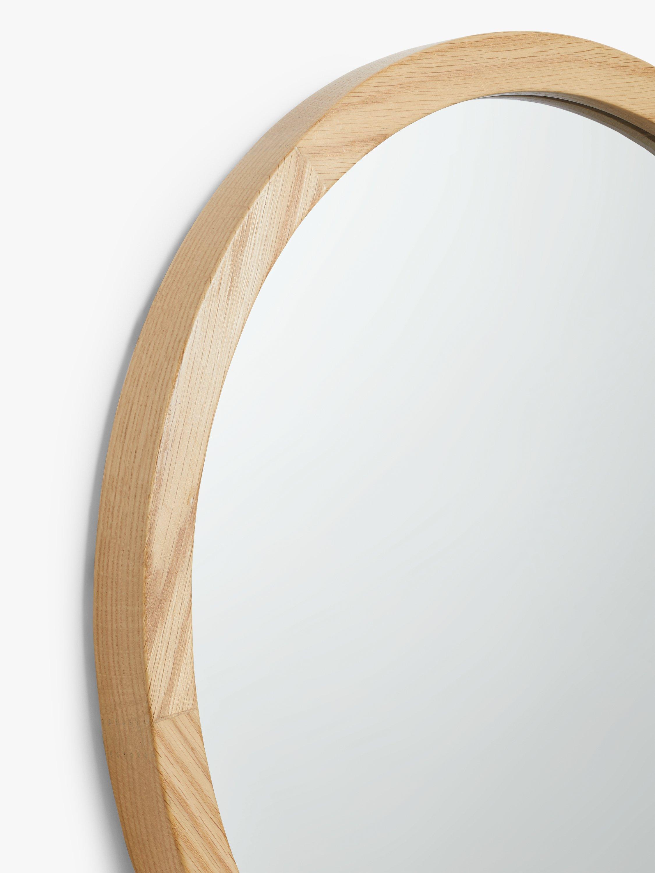 Solid oak wood round mirror, ready to hang on your wall using the D-ring fittings on the back. Available in light natural oak wood, a darker walnut stained finish or a black stained finish.