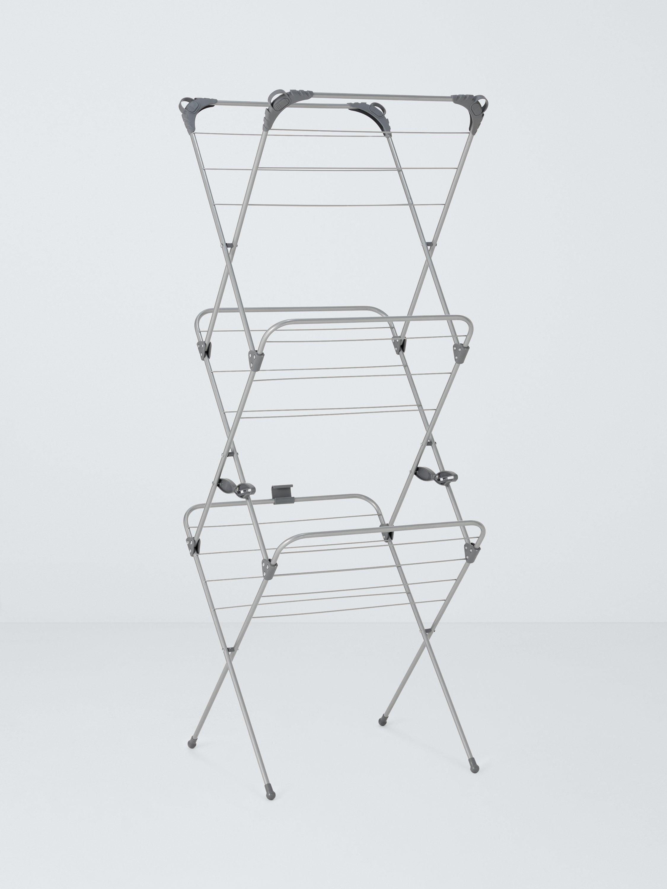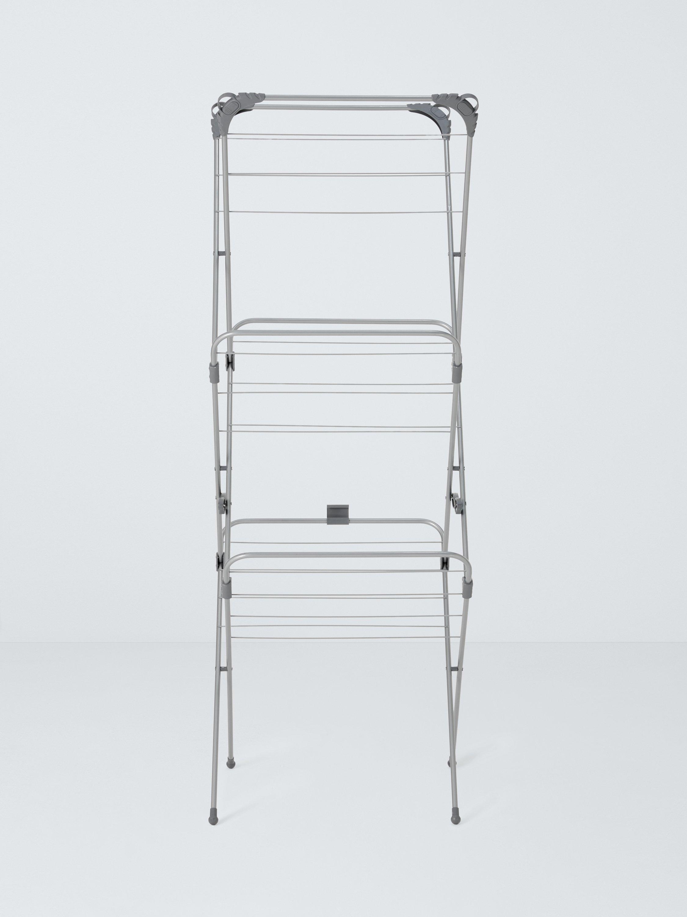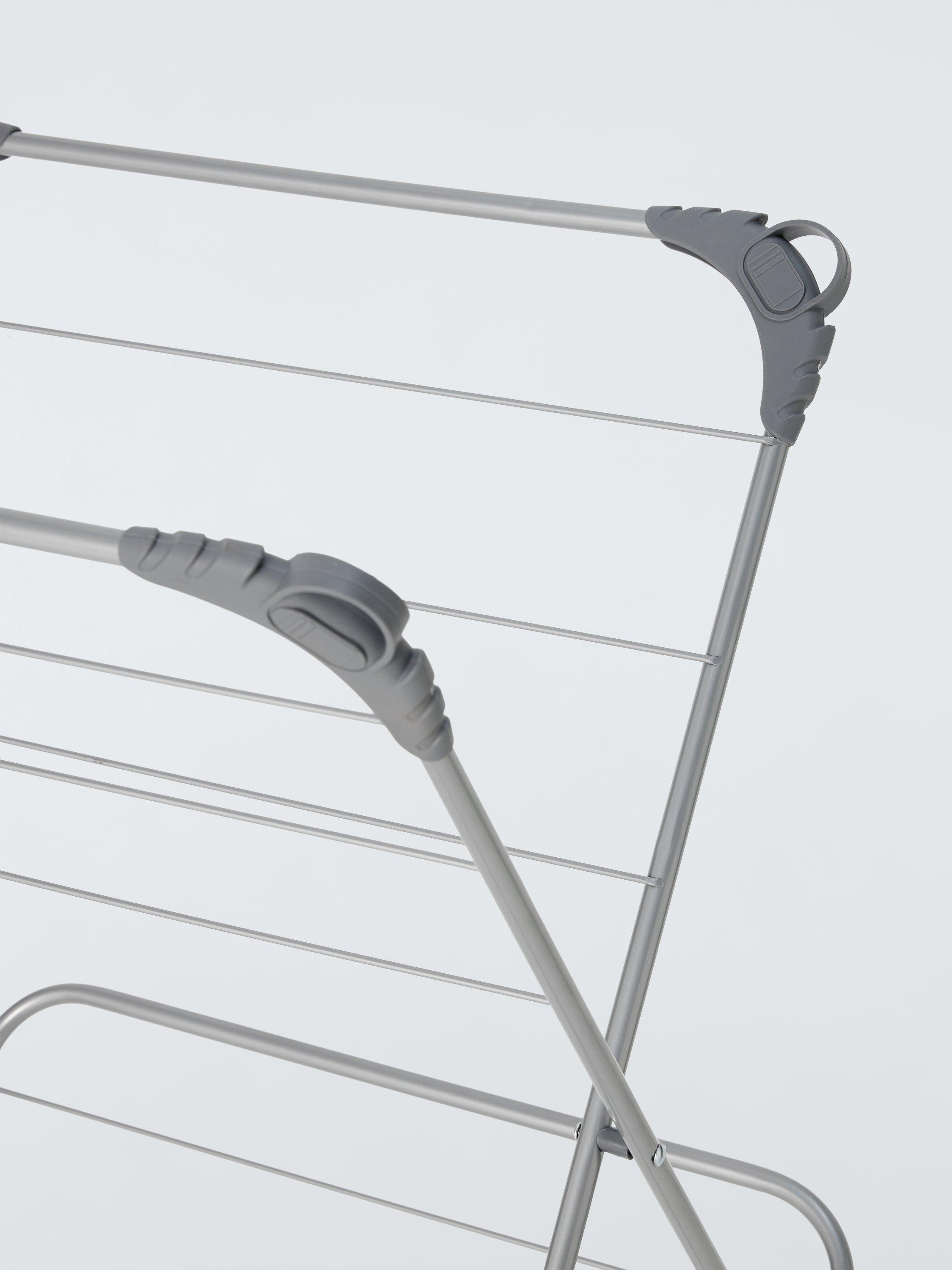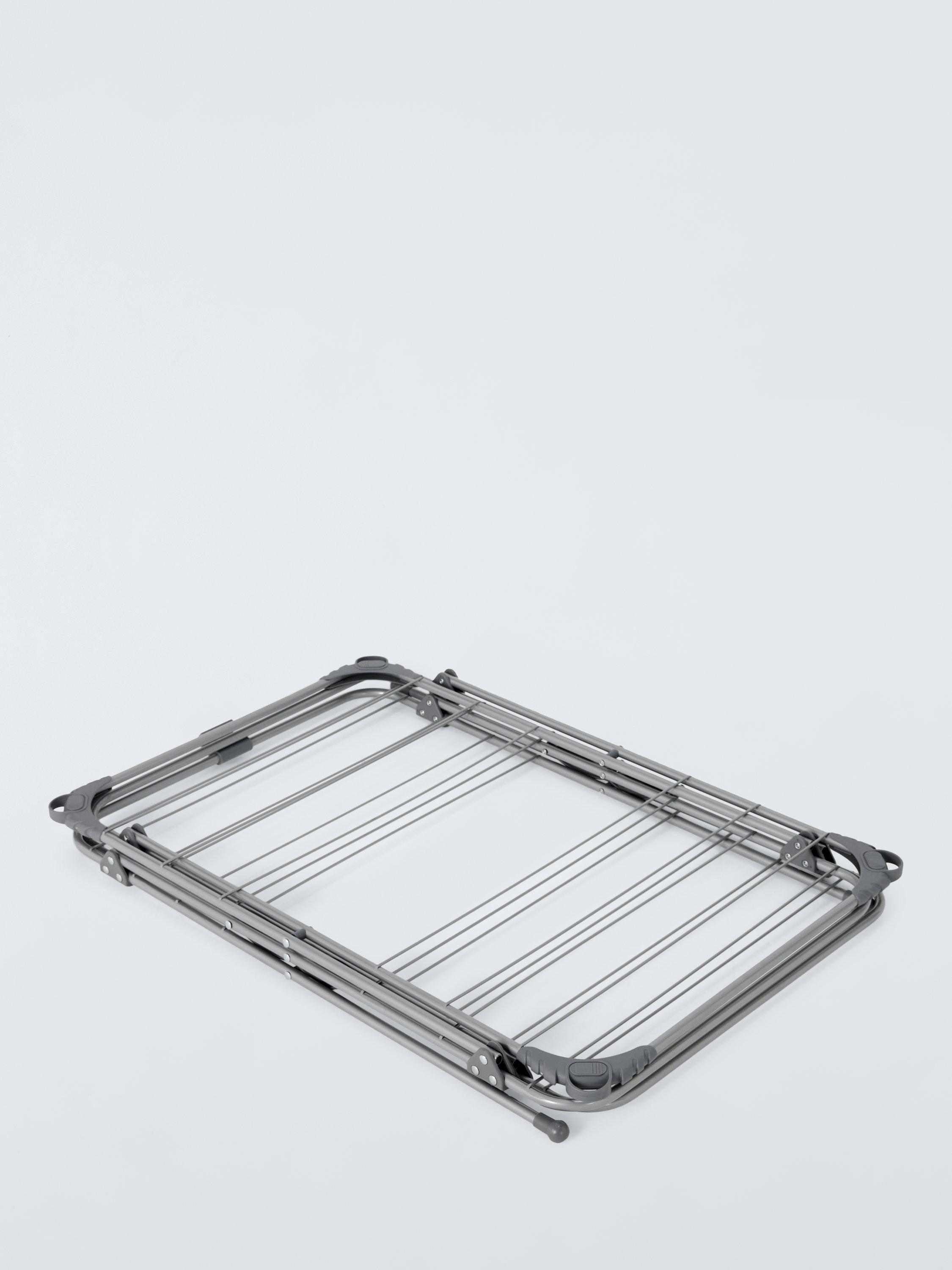 This slimline airer is perfect for smaller spaces and features 4 corner hooks for hangers, a holding clip and easy-glide feet.