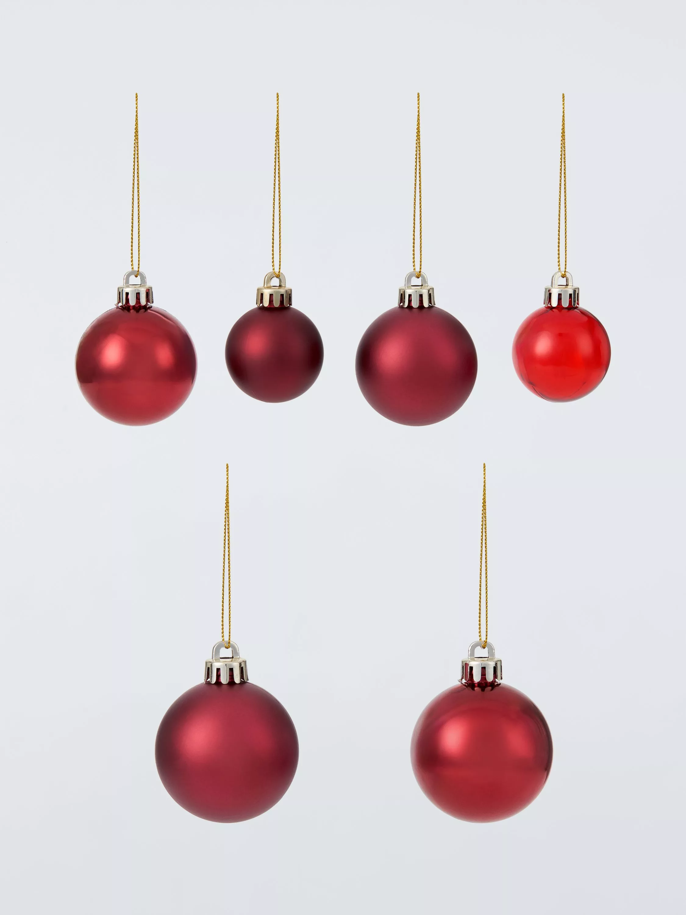 100 shatterproof Christmas baubles in a range of red tones in shiny and matte finishes.