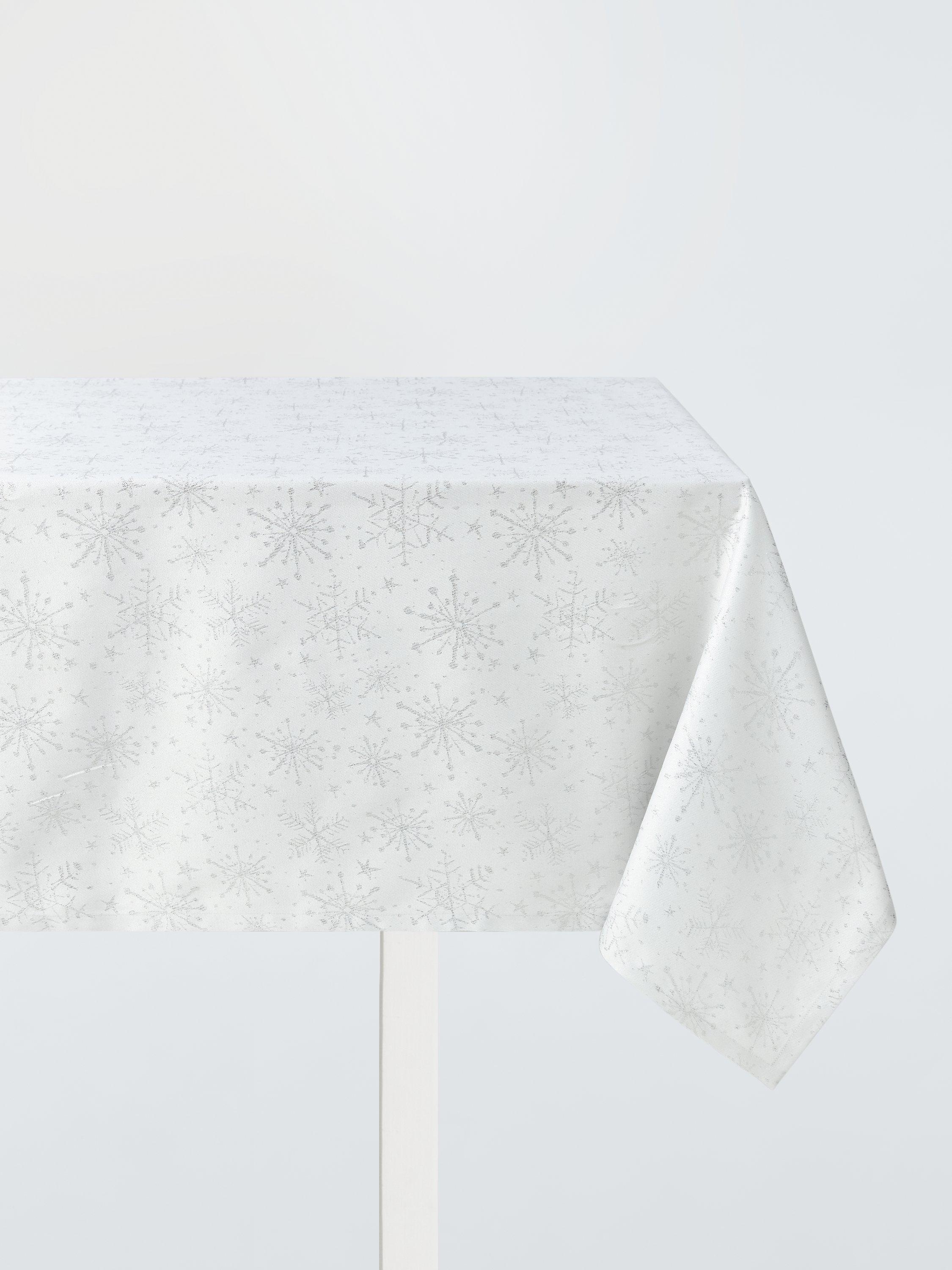Festive rectangular tablecloth with a subtly textured snowflake jacquard pattern. Made from a blended fabric that includes cotton and metallic sparkle, it's machine washable for easy cleaning. Team it with the matching napkins to complete the look.