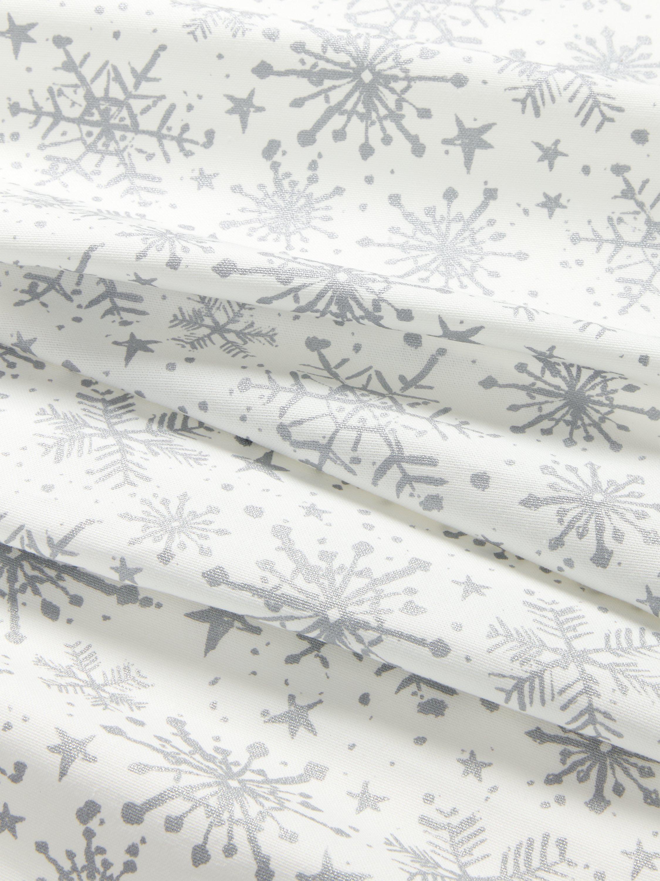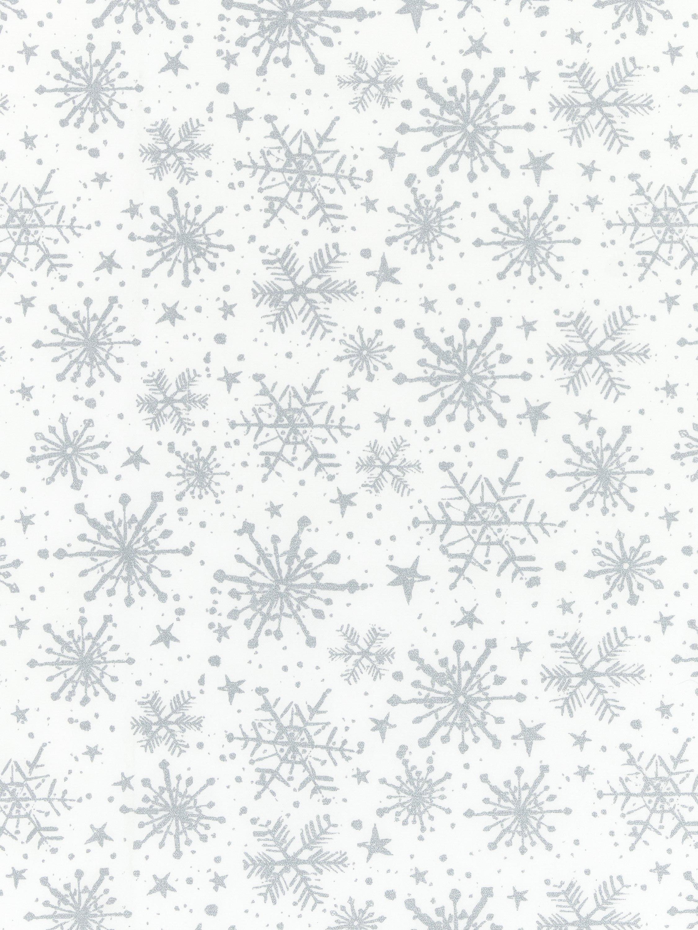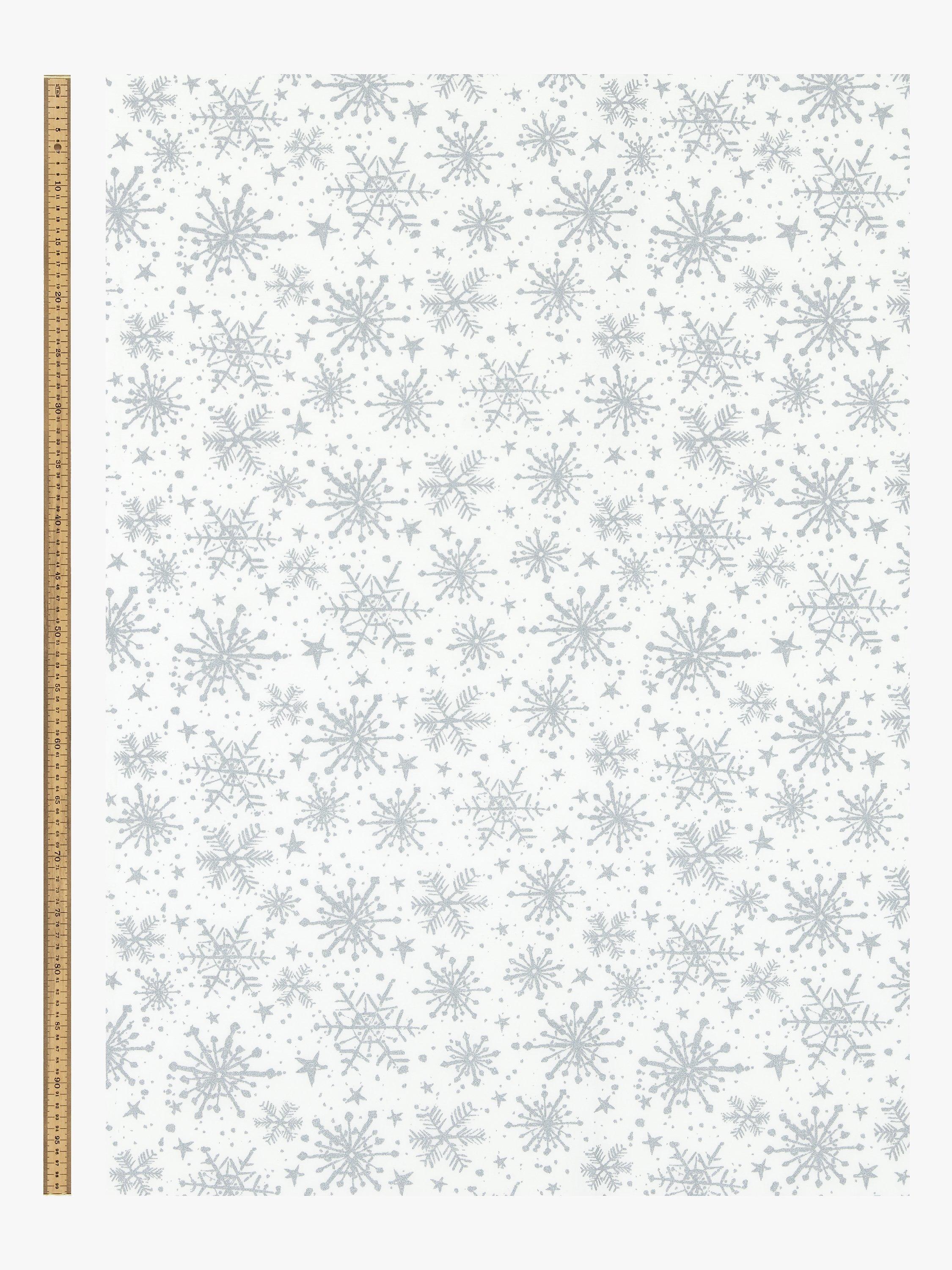 A motif of silvery snowflakes and stars decorate this Christmas-themed PVC tablecloth fabric. It has a gloss finish.
