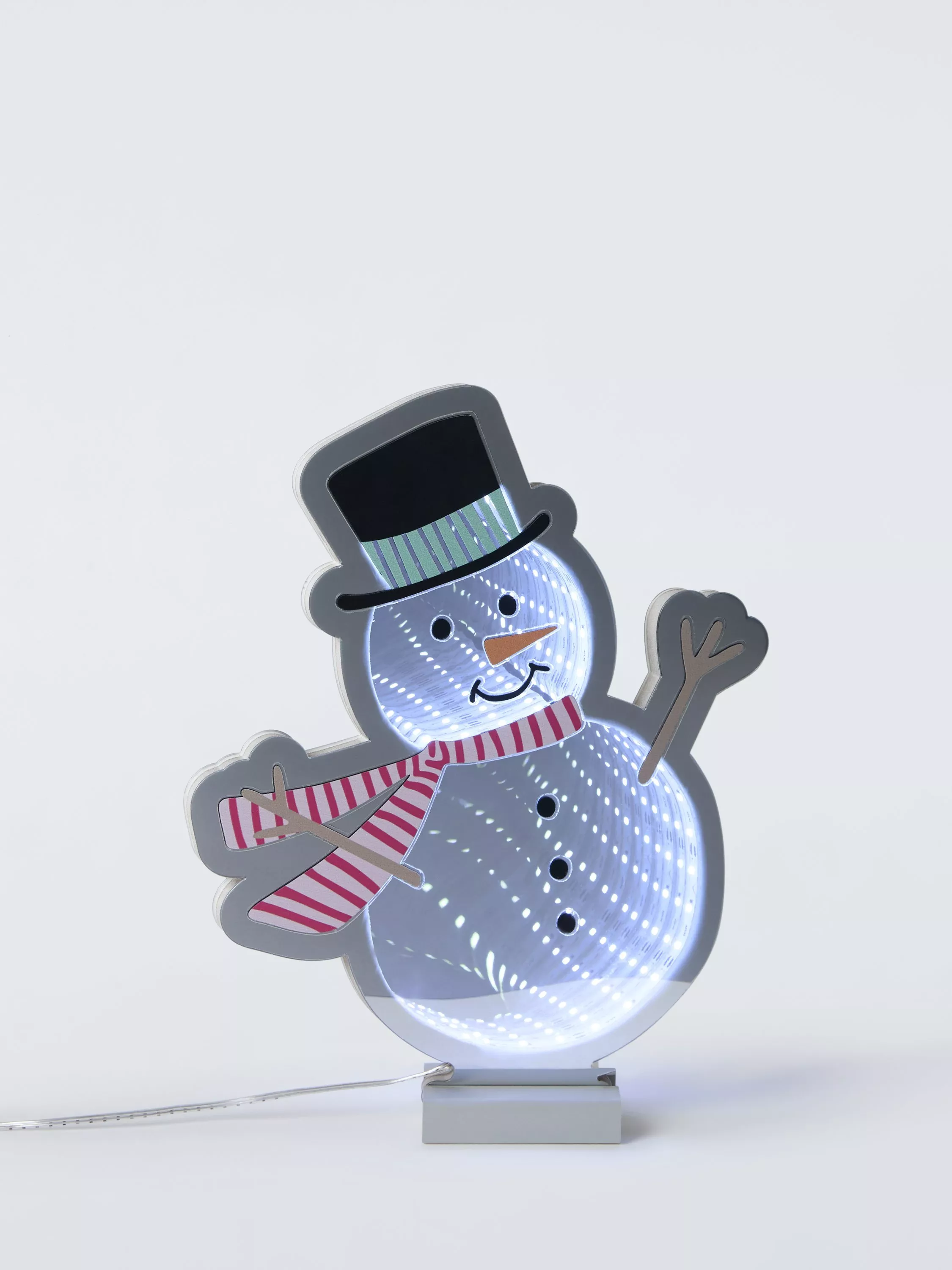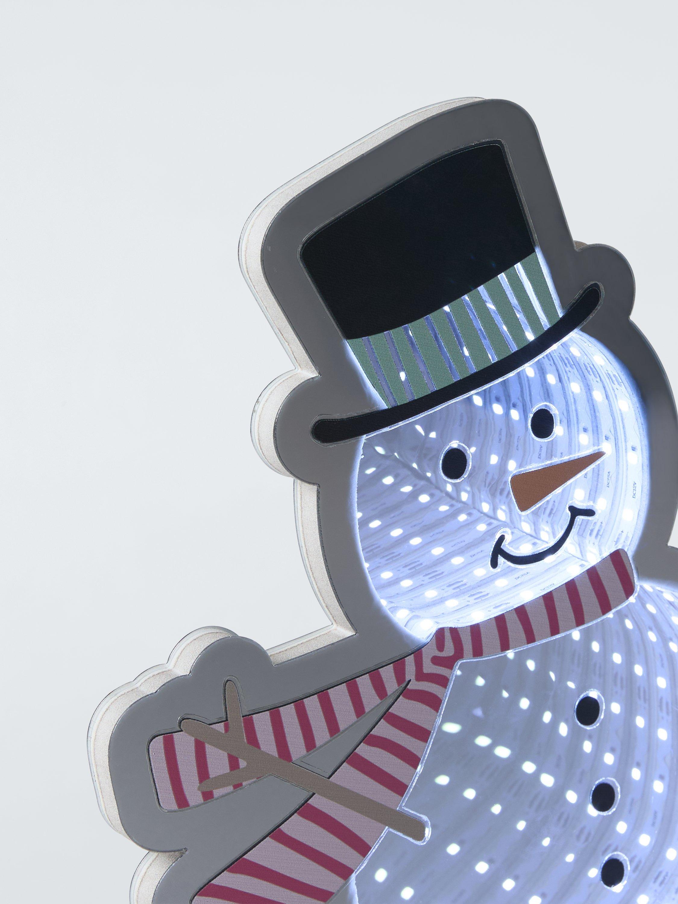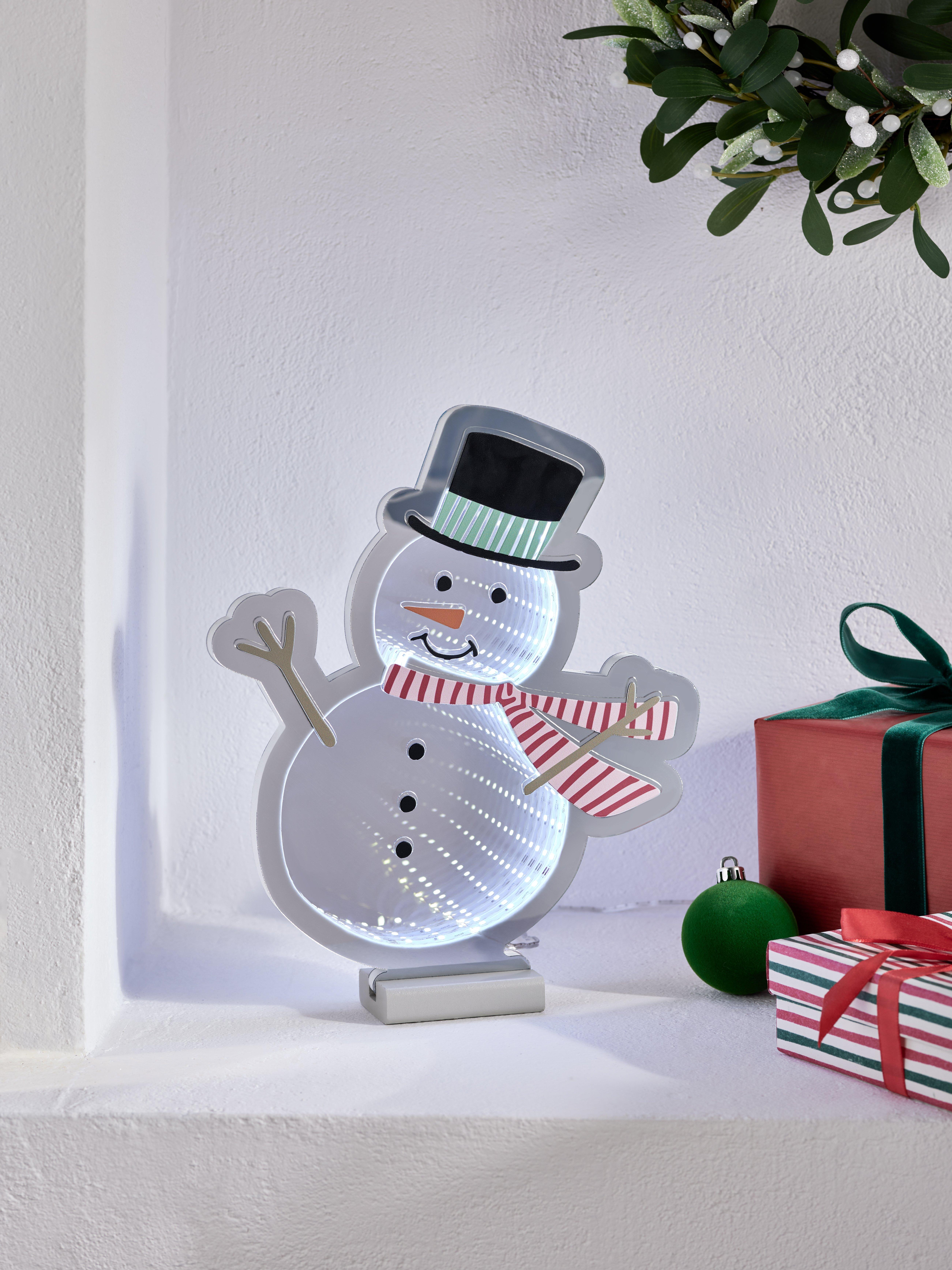A cute and colourful decoration by day, a wonderful, way out infinity light by night, this smiley snowman features a steady multi-coloured LED glow that brings warmth and cheer to any room.