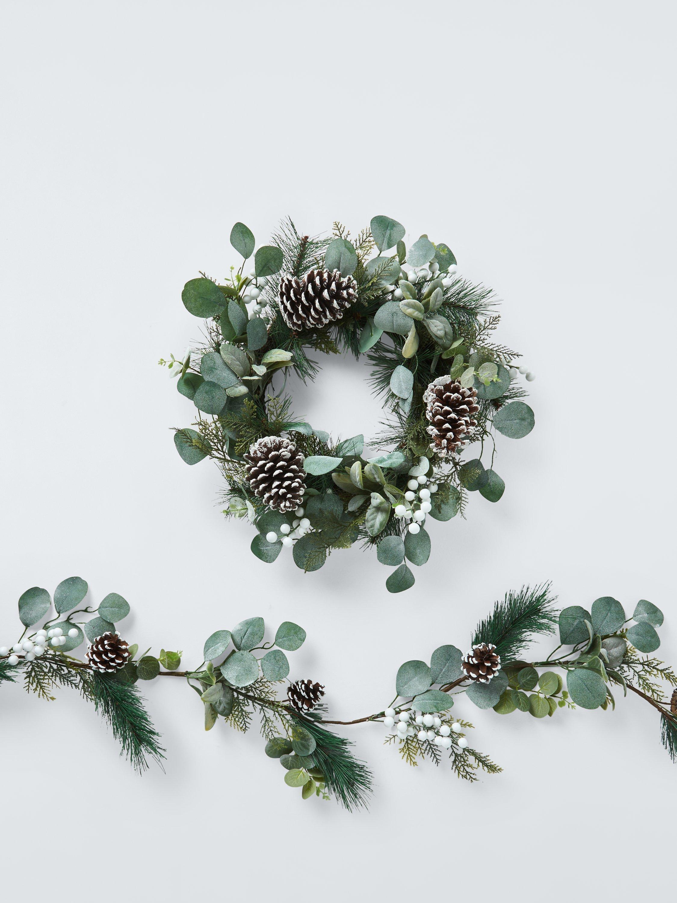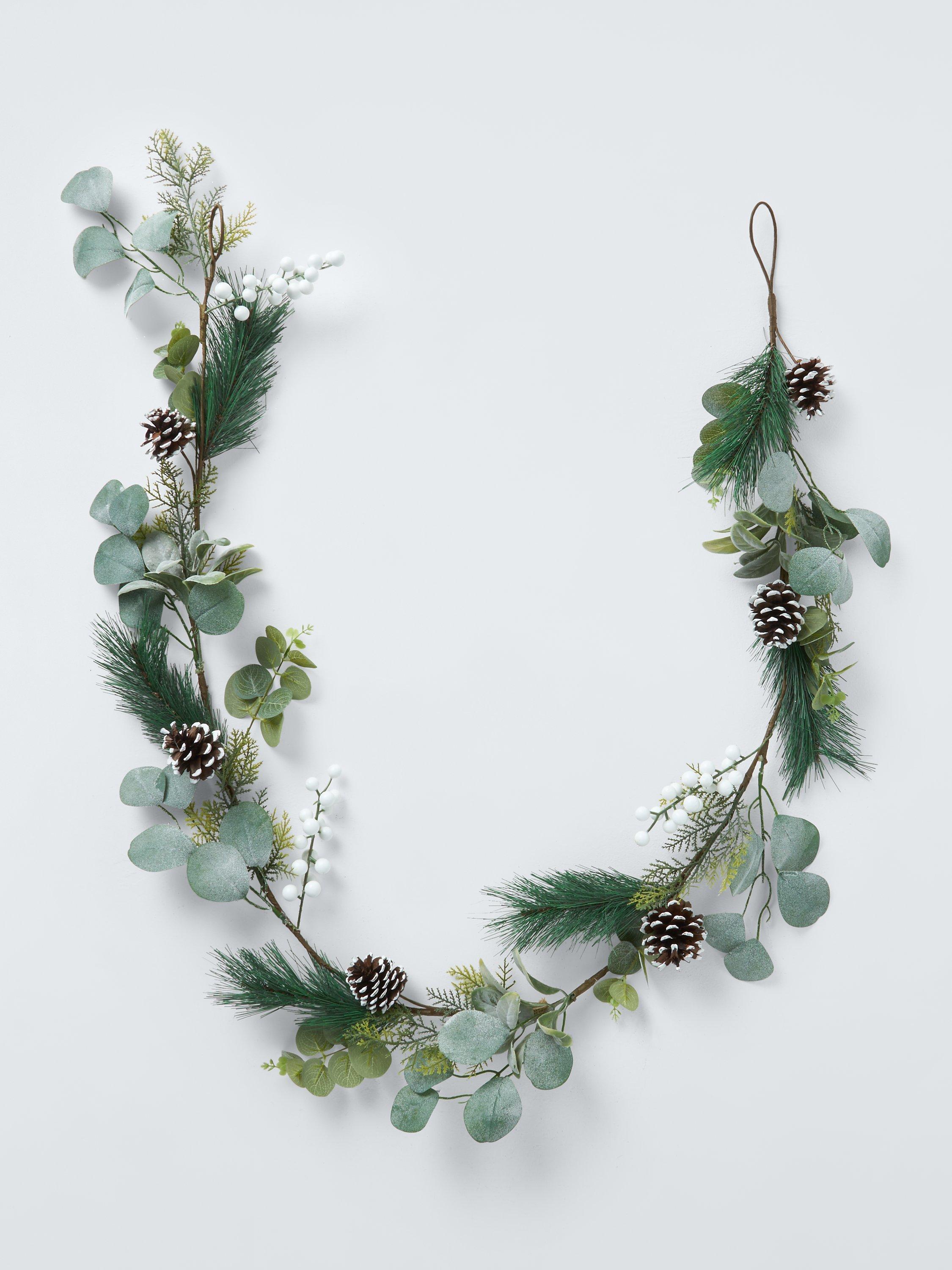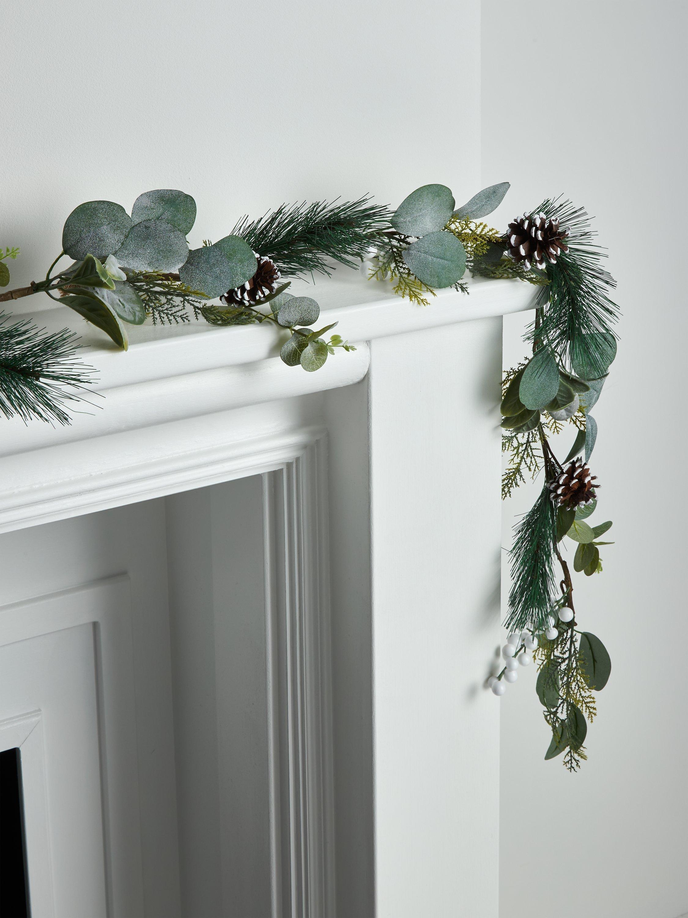 Realistic eucalyptus leaves are entwined with pine sprigs, ferny fronds and white berry clusters. There's also a scattering of real pine cones with snowy white tips.