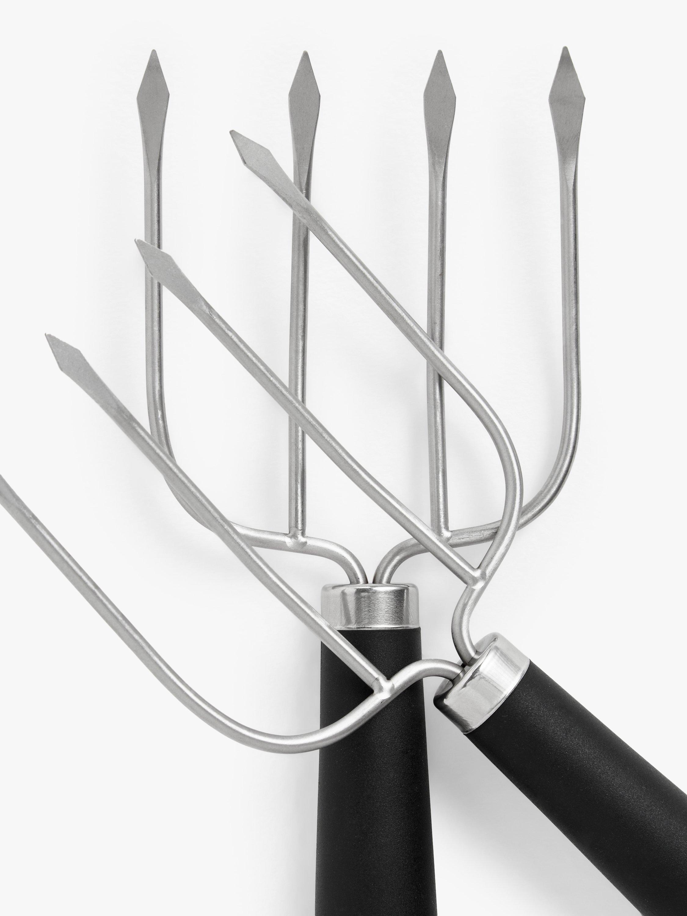 Sunday roast essentials. Pair of pronged meat lifting forks made of stainless steel. Dishwasher safe, they're easy to clean and have hanging holes for storing. The soft-grip silicone handles makes them comfortable to hold and use.