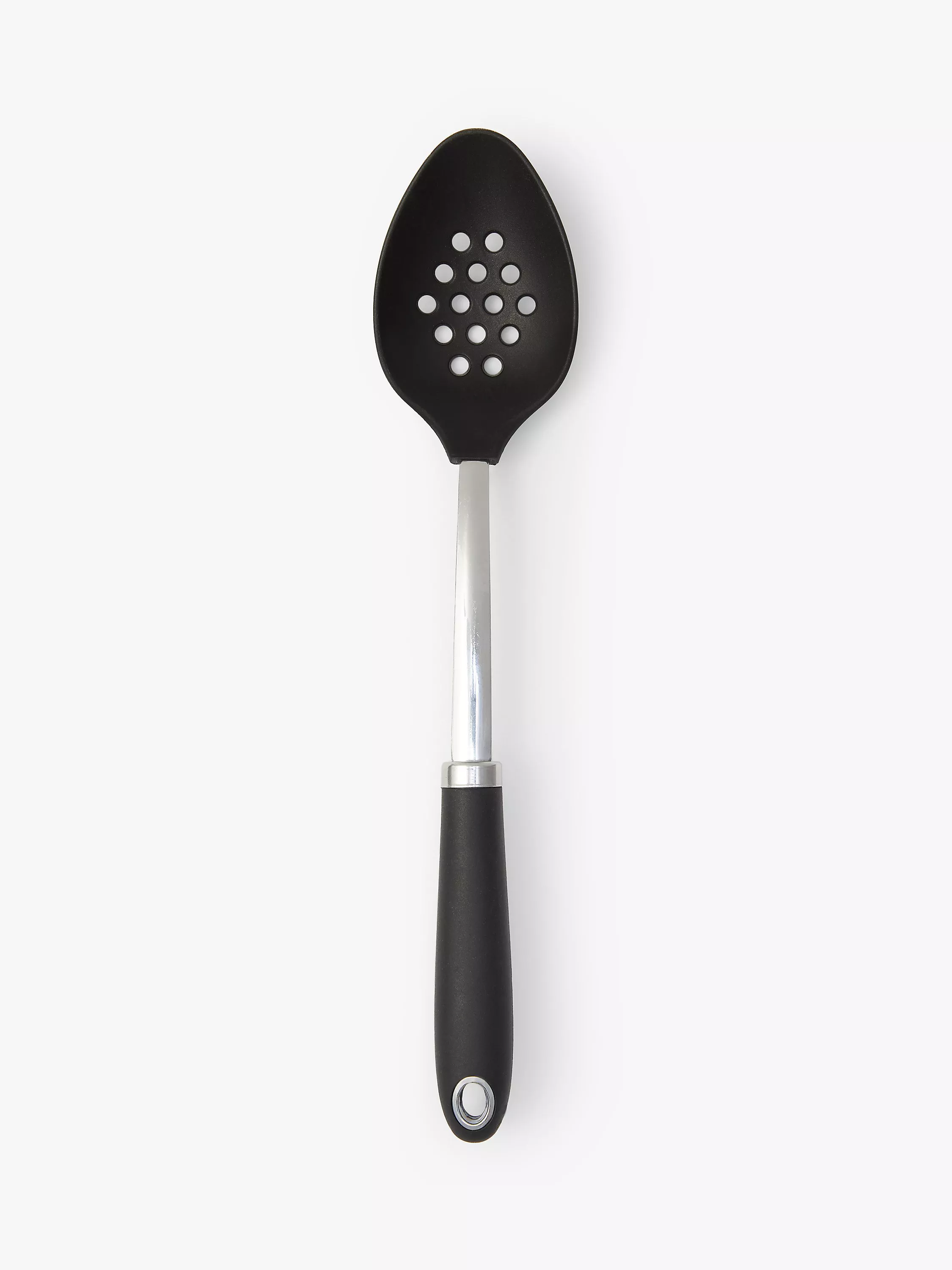 Slotted spoon with a heat-resistant nylon head, making it suitable for use with all cookware surfaces, including non-stick.