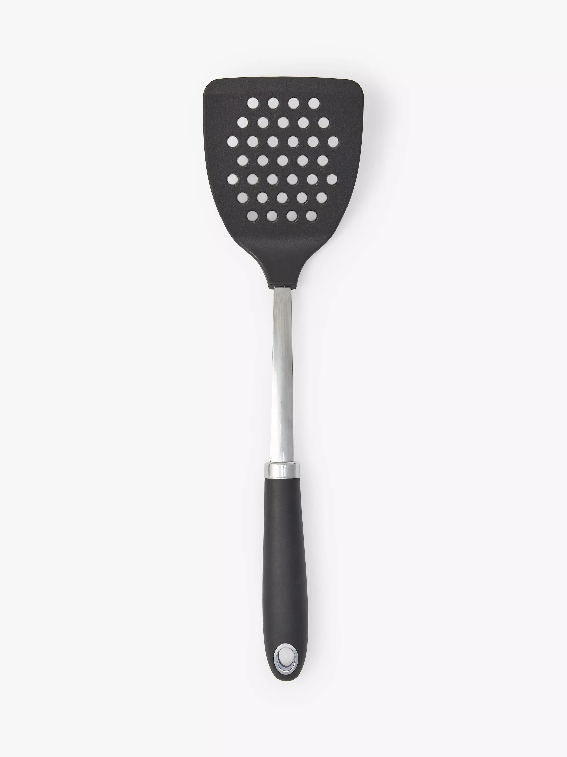 Slotted turner with a heat-resistant nylon head, making it suitable for use with all cookware surfaces, including non-stick.