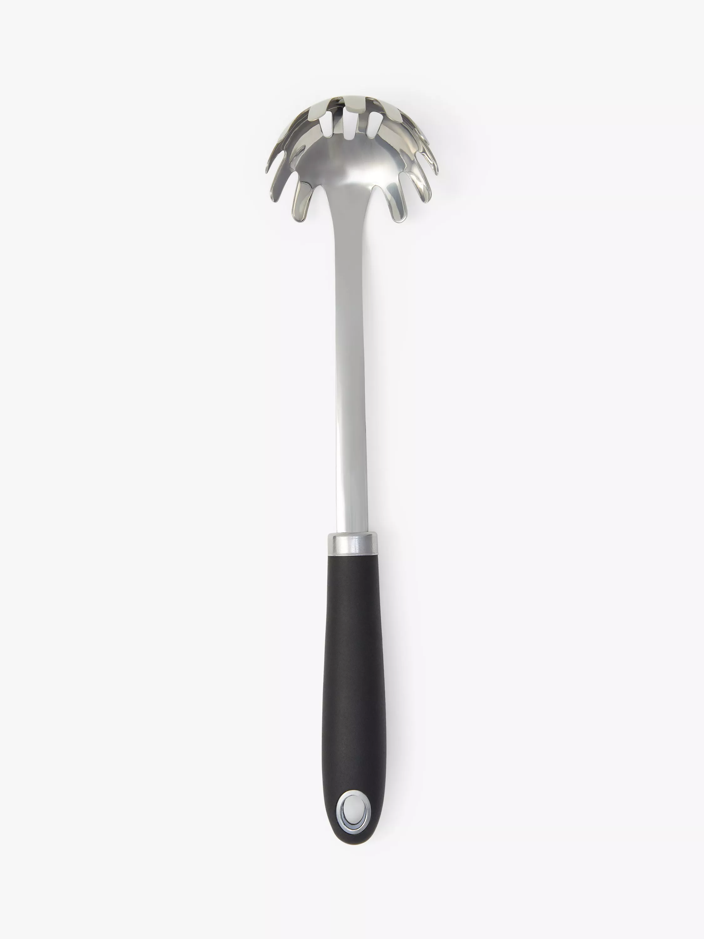 Spaghetti spoon made of durable stainless steel. Dishwasher safe, it's easy to clean and has a hanging hole for storing. The soft-grip silicone handle makes it comfortable to hold and use.