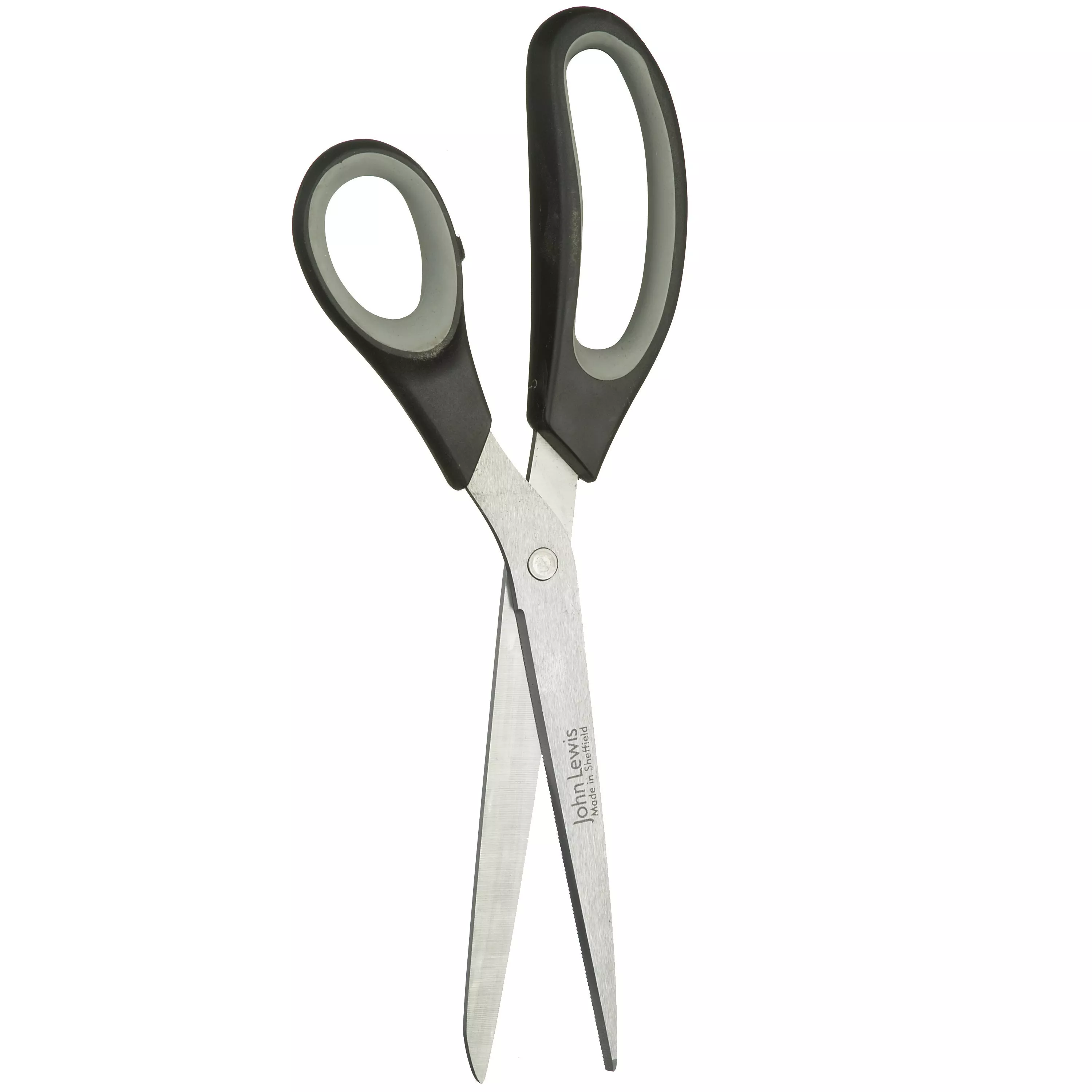 Serrated stainless steel dressmaking scissors which give a fine cut quality. With soft grip handles. Made in Sheffield.