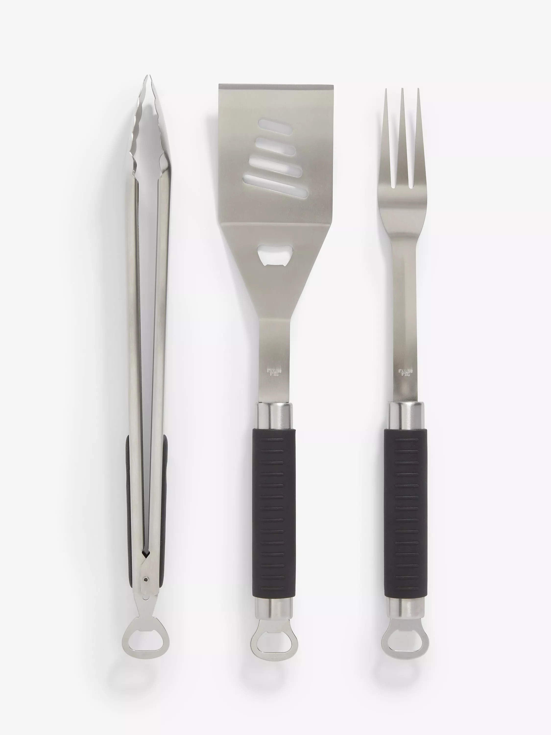 All you need for your barbecue. This utensil trio includes a slotted spatula, tongs and fork. Made of durable stainless steel with soft-touch handles for easy holding and use. Dishwasher safe.