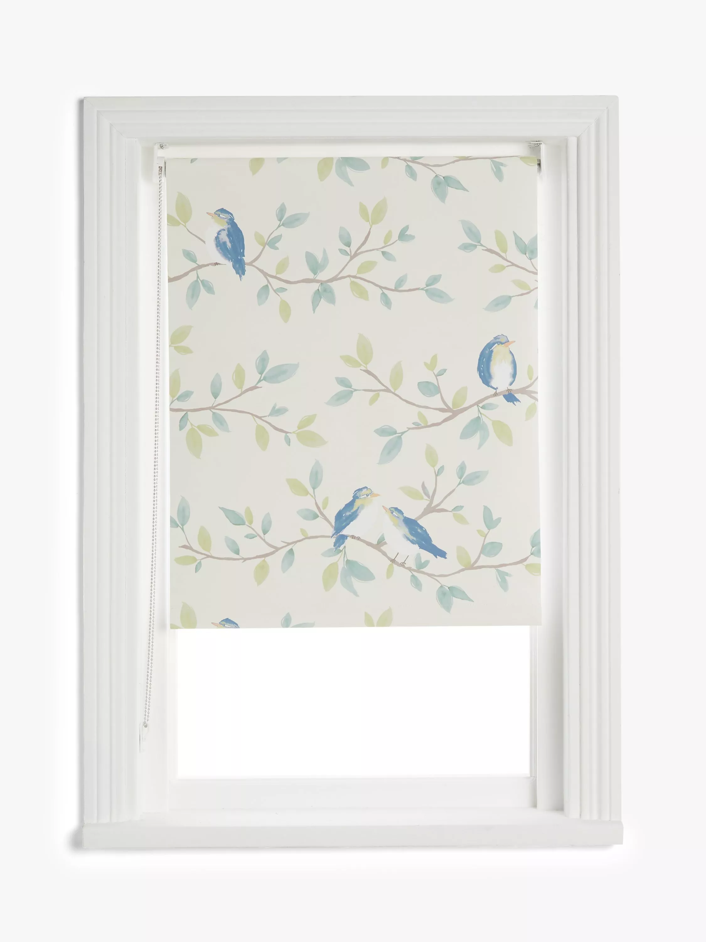 Small songbirds perch in the trees on this charming ready-made roller blind. It's a blackout blind which means it eliminates light and gives complete privacy. You can get a sound night’s sleep and not be disturbed by the early rising sun in the summer months.