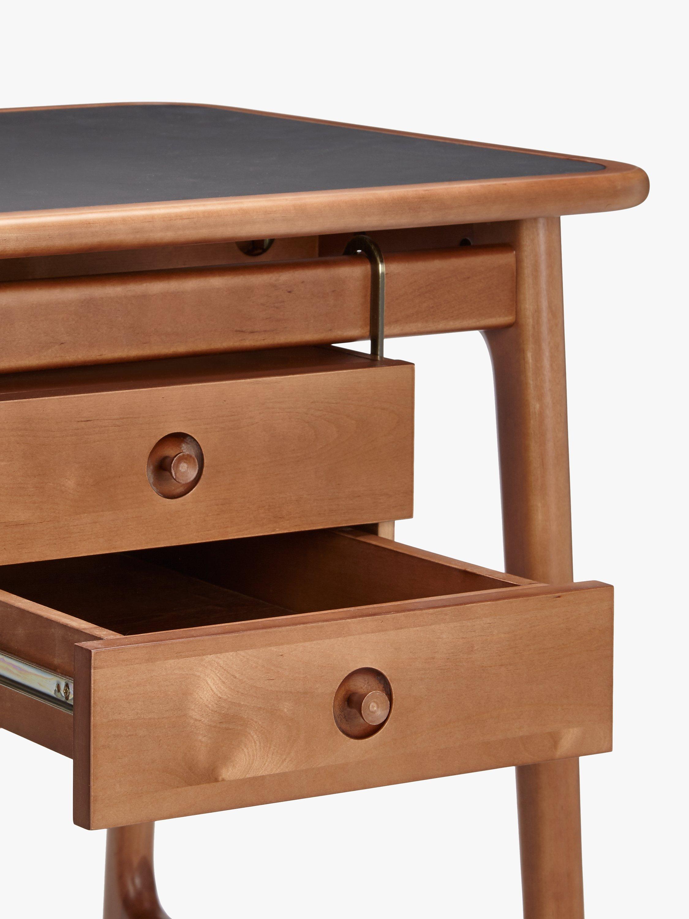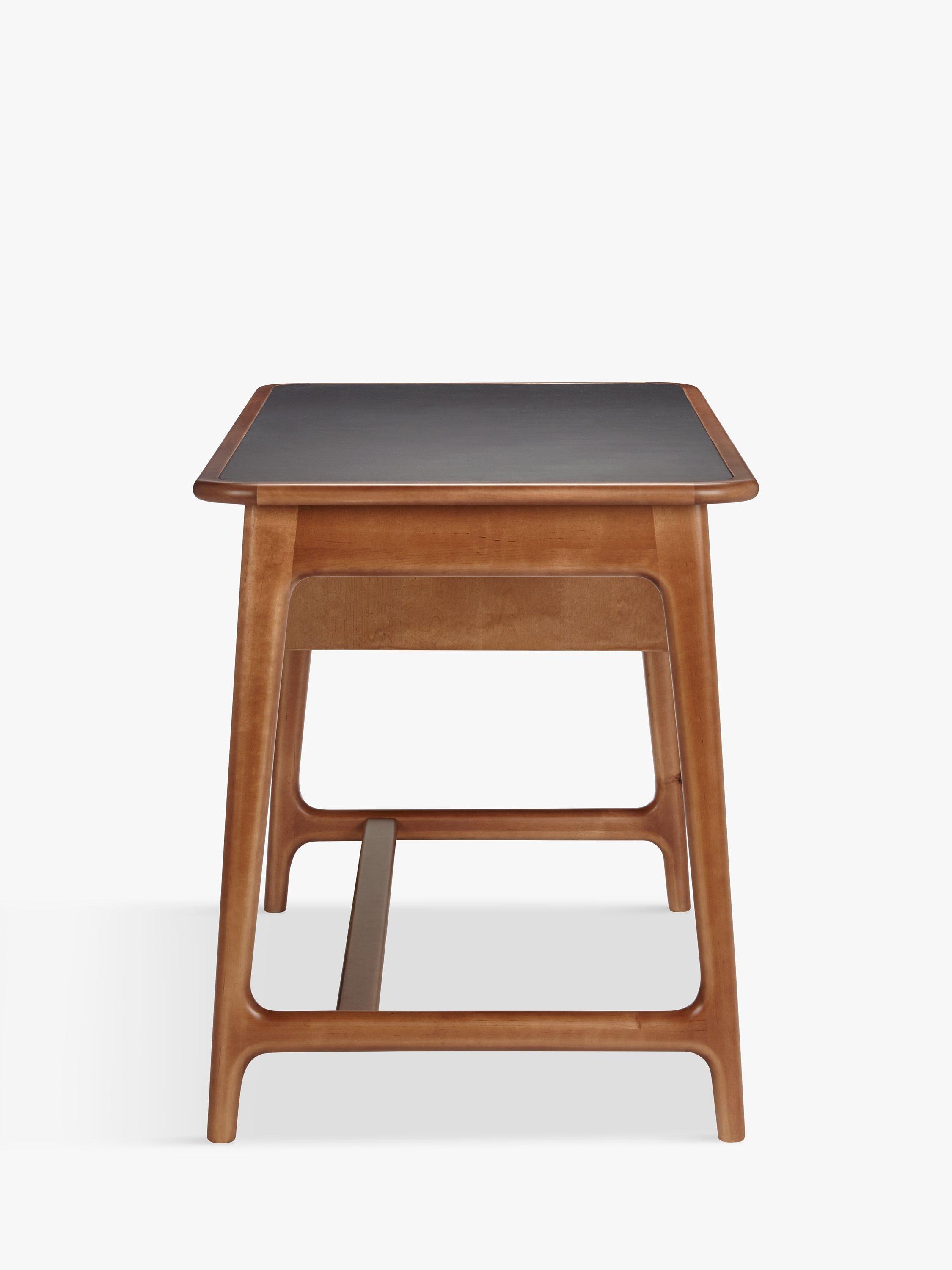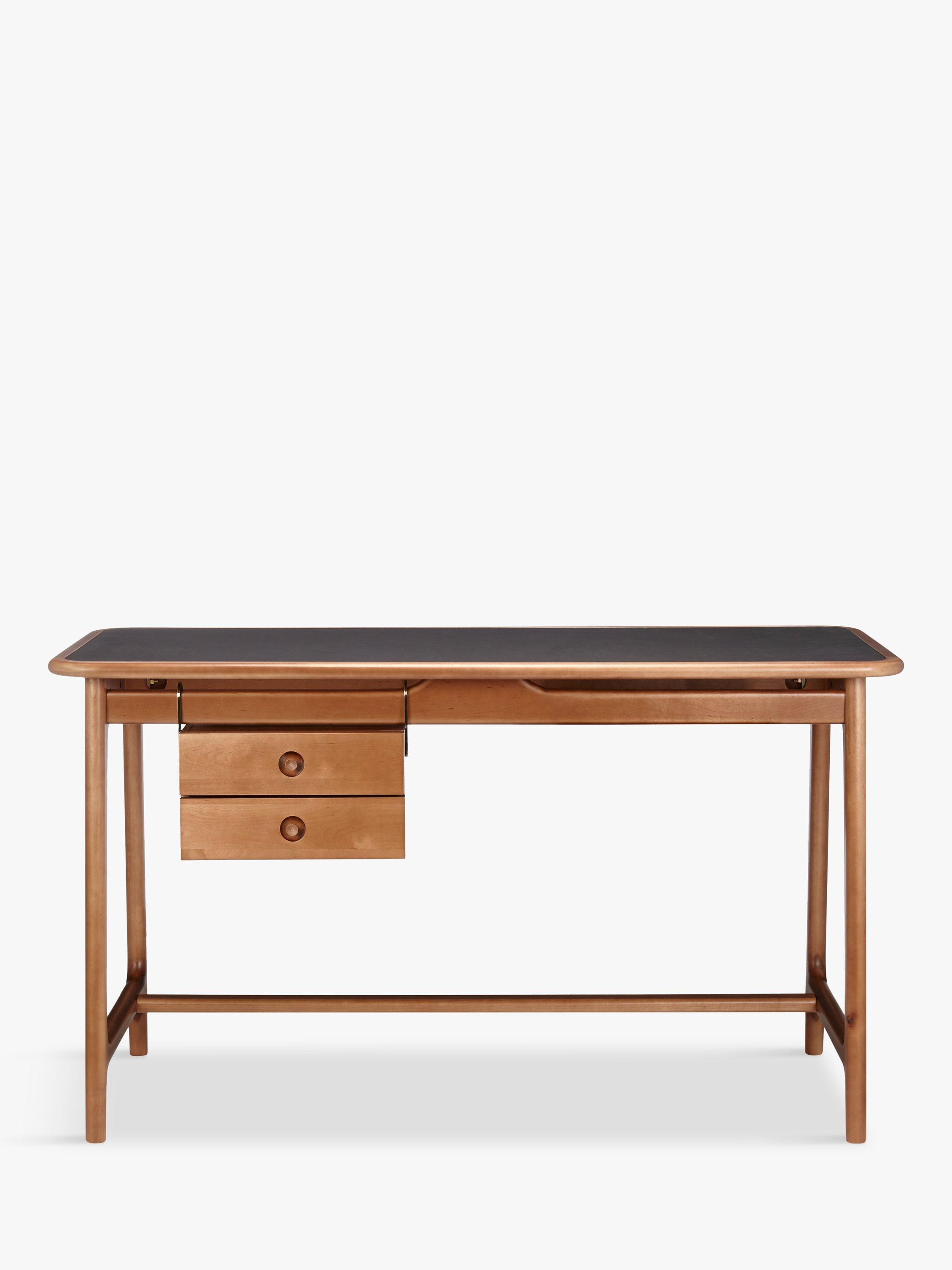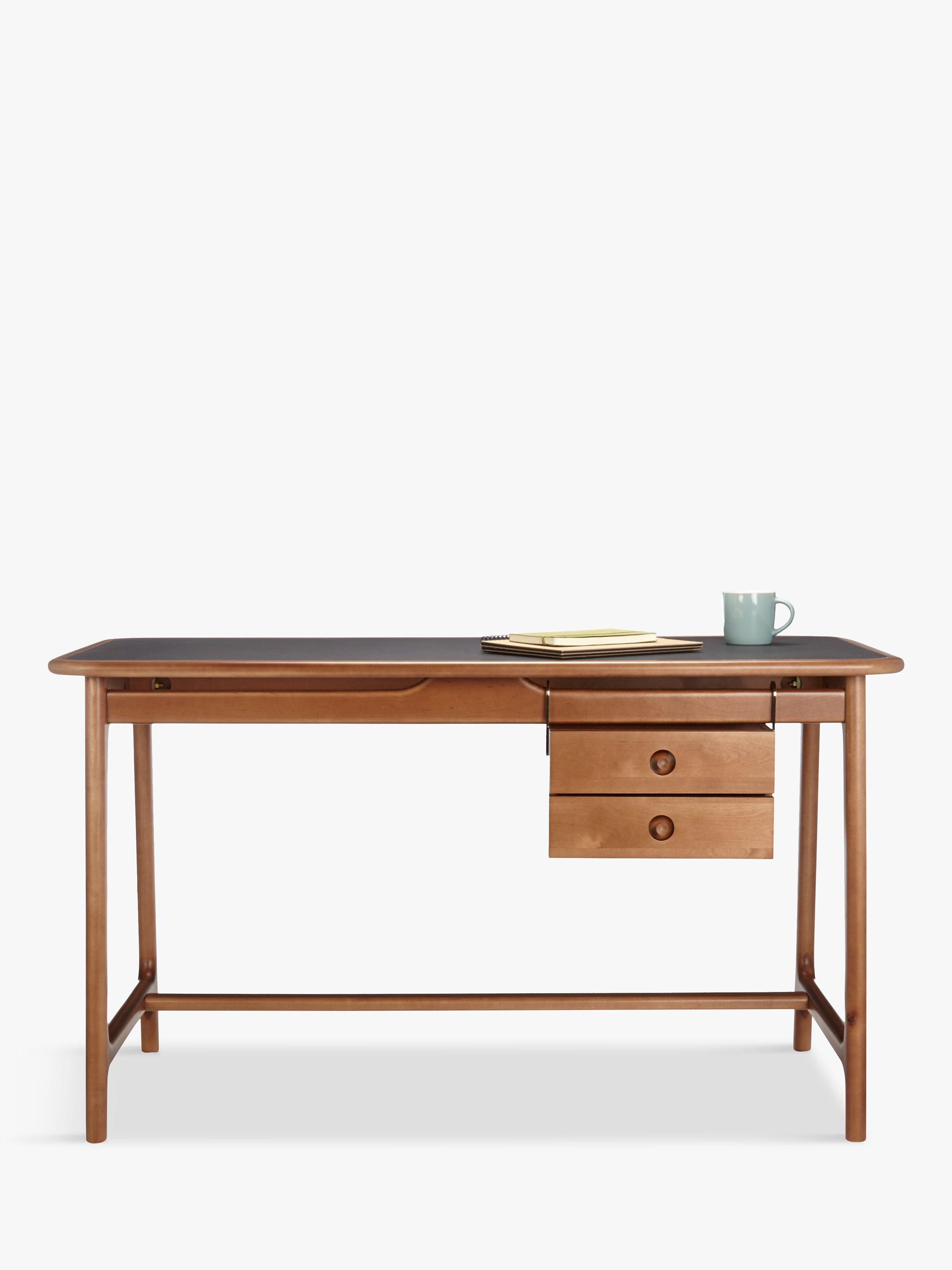 This sleek mid-century inspired desk is perfectly positioned in an office or study to create a sophisticated working environment with real style appeal. Its faux leather table top provides an attractive and durable surface for work, while the smooth wooden frame and floating drawers offer a distinctive finish. The drawers can moved to suit your requirements, simply unhook to place them on your preferred side of the desk.
