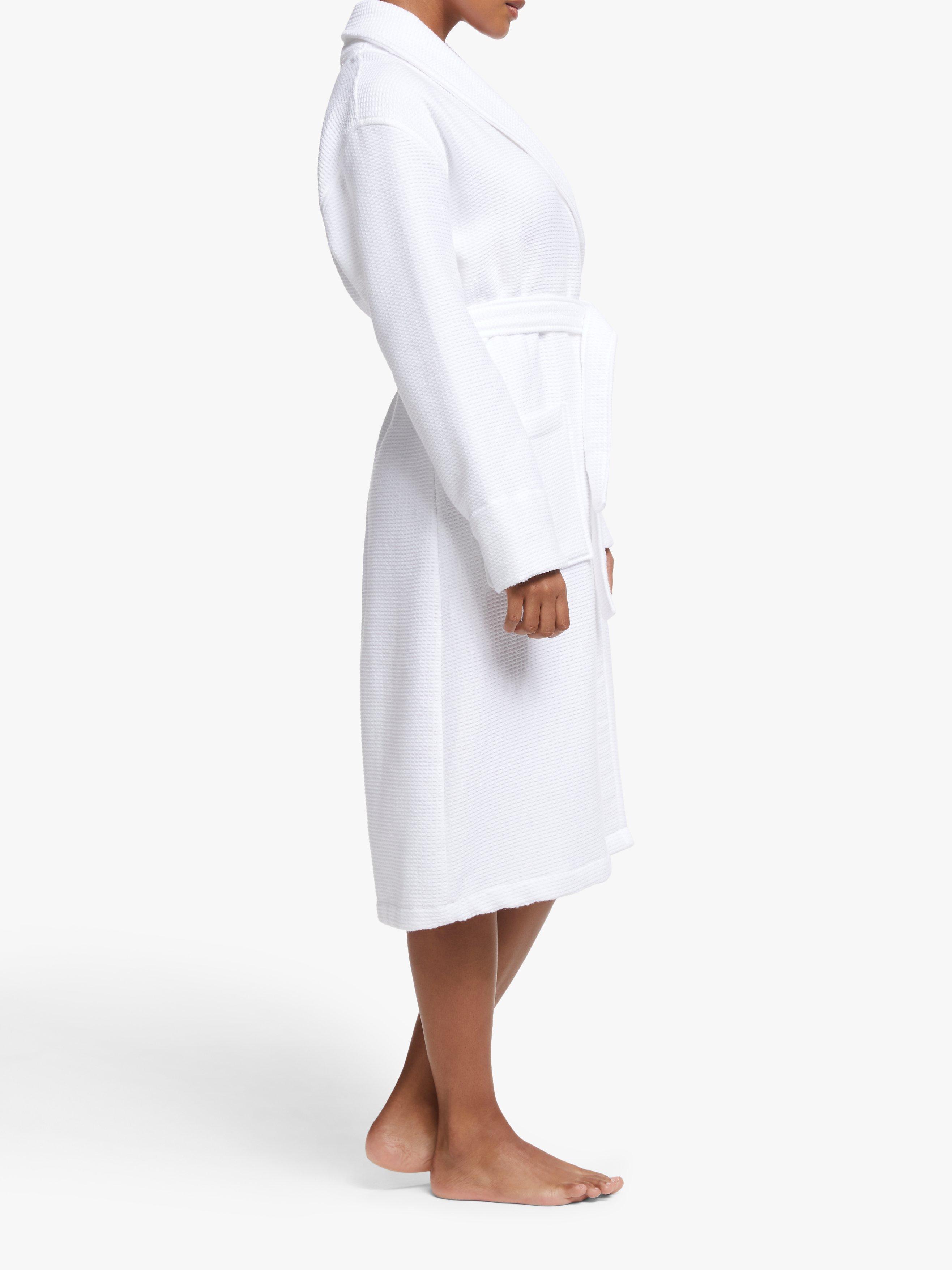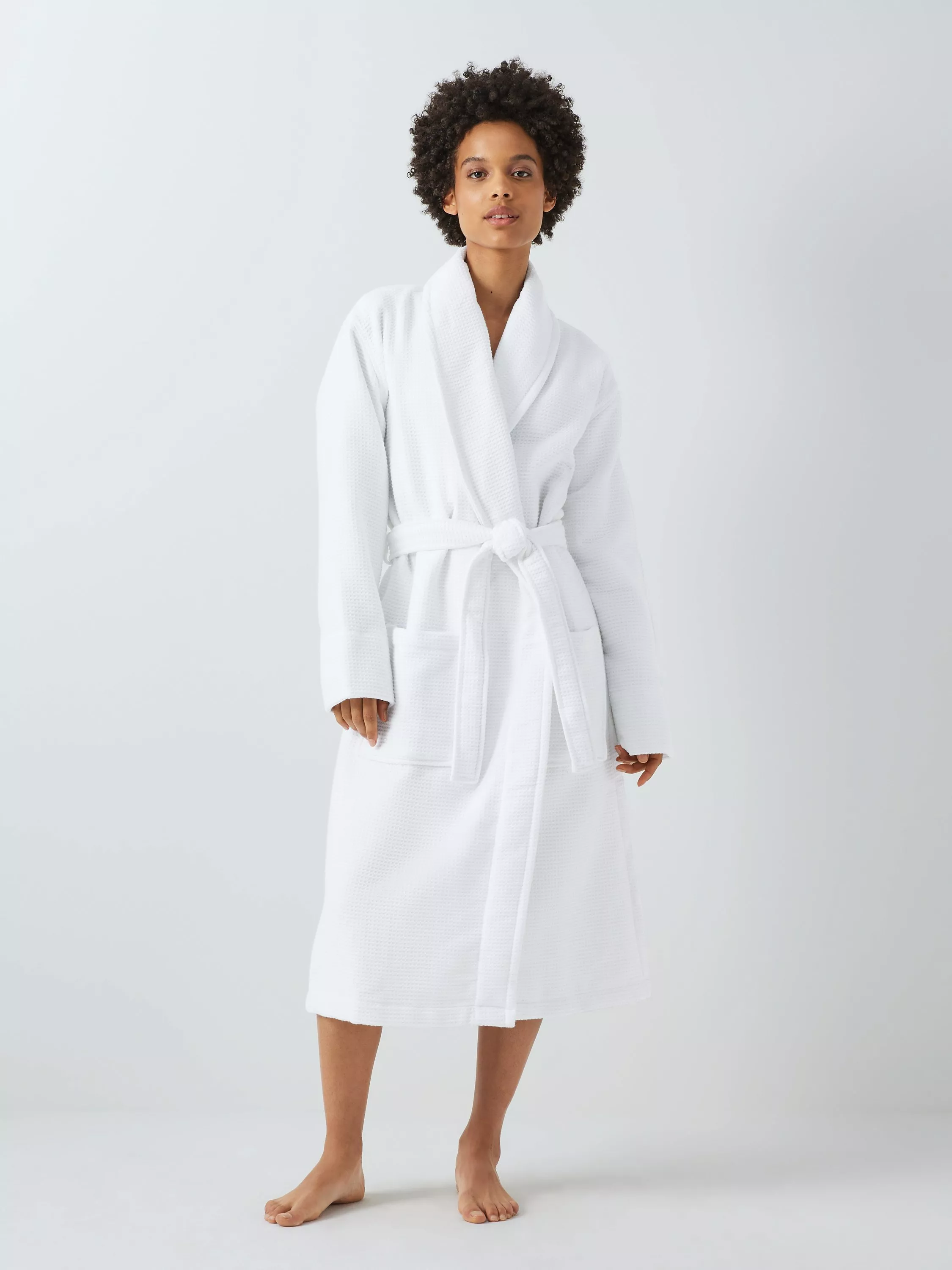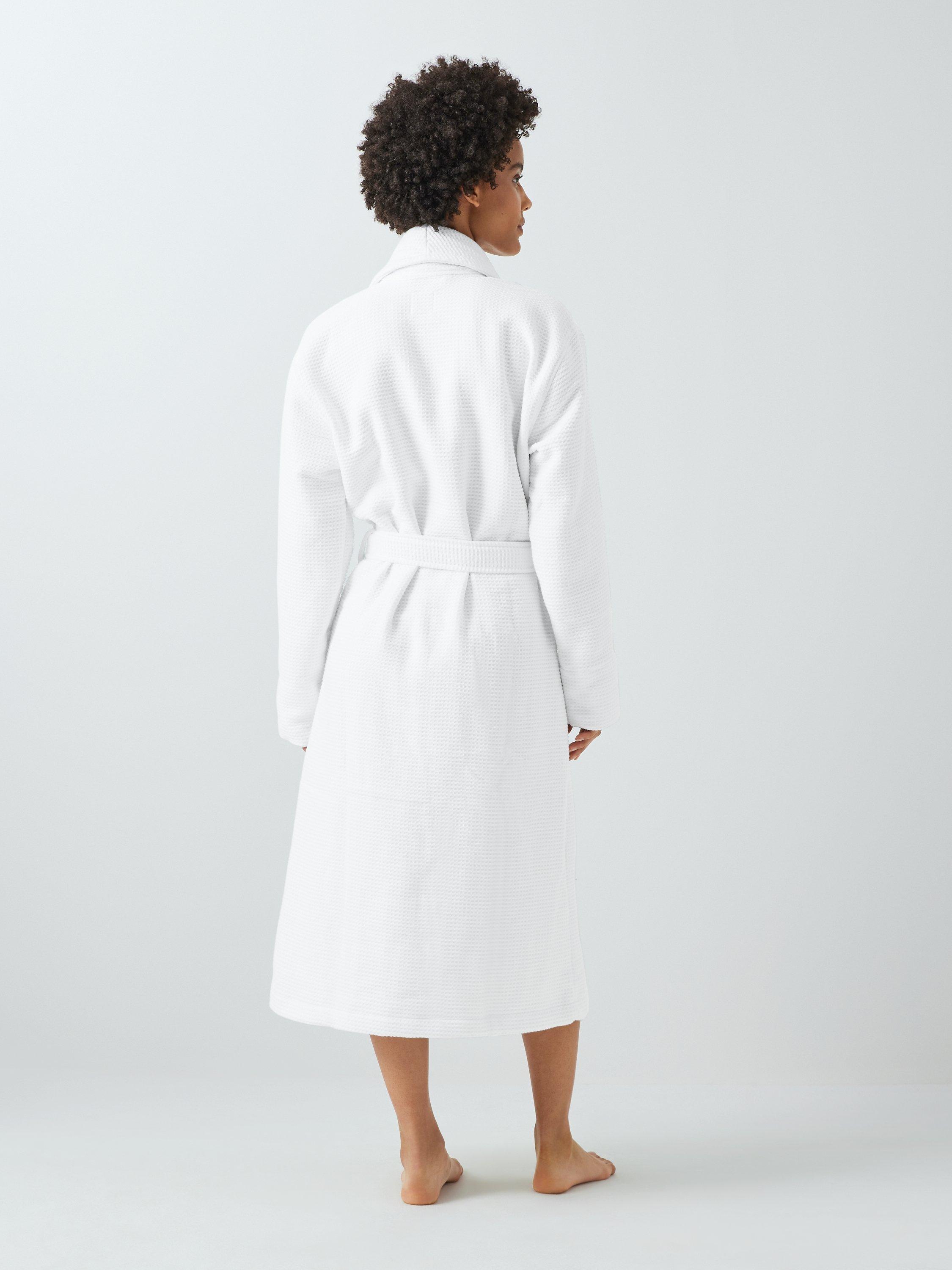 Our spa robe allows you to leave the daily routine behind and unwind with its comfortable waffle texture. Made from pure cotton, this relaxed fitting piece is designed with a shawl collar, two oversized patch pockets and a matching tie belt for fastening.