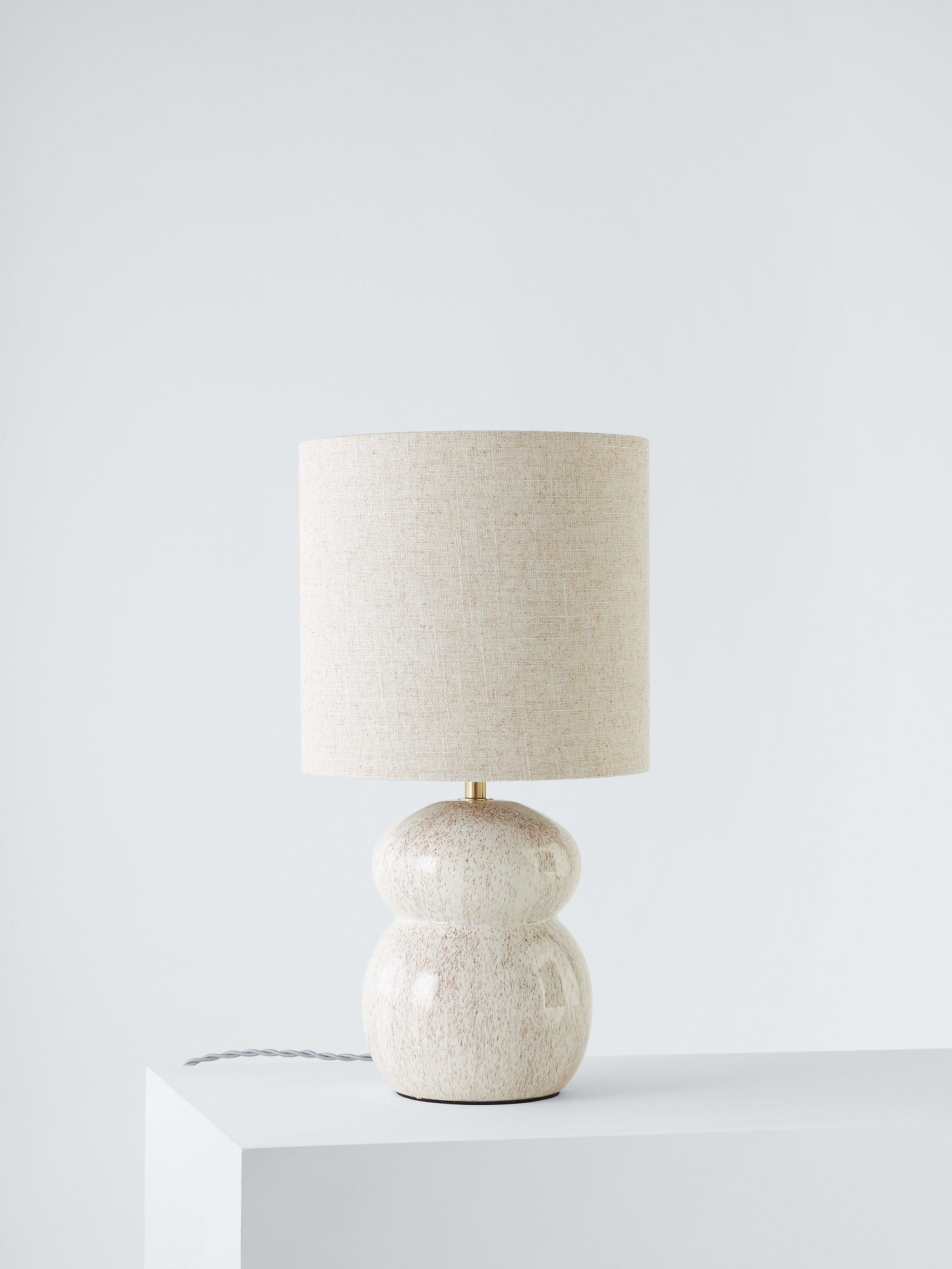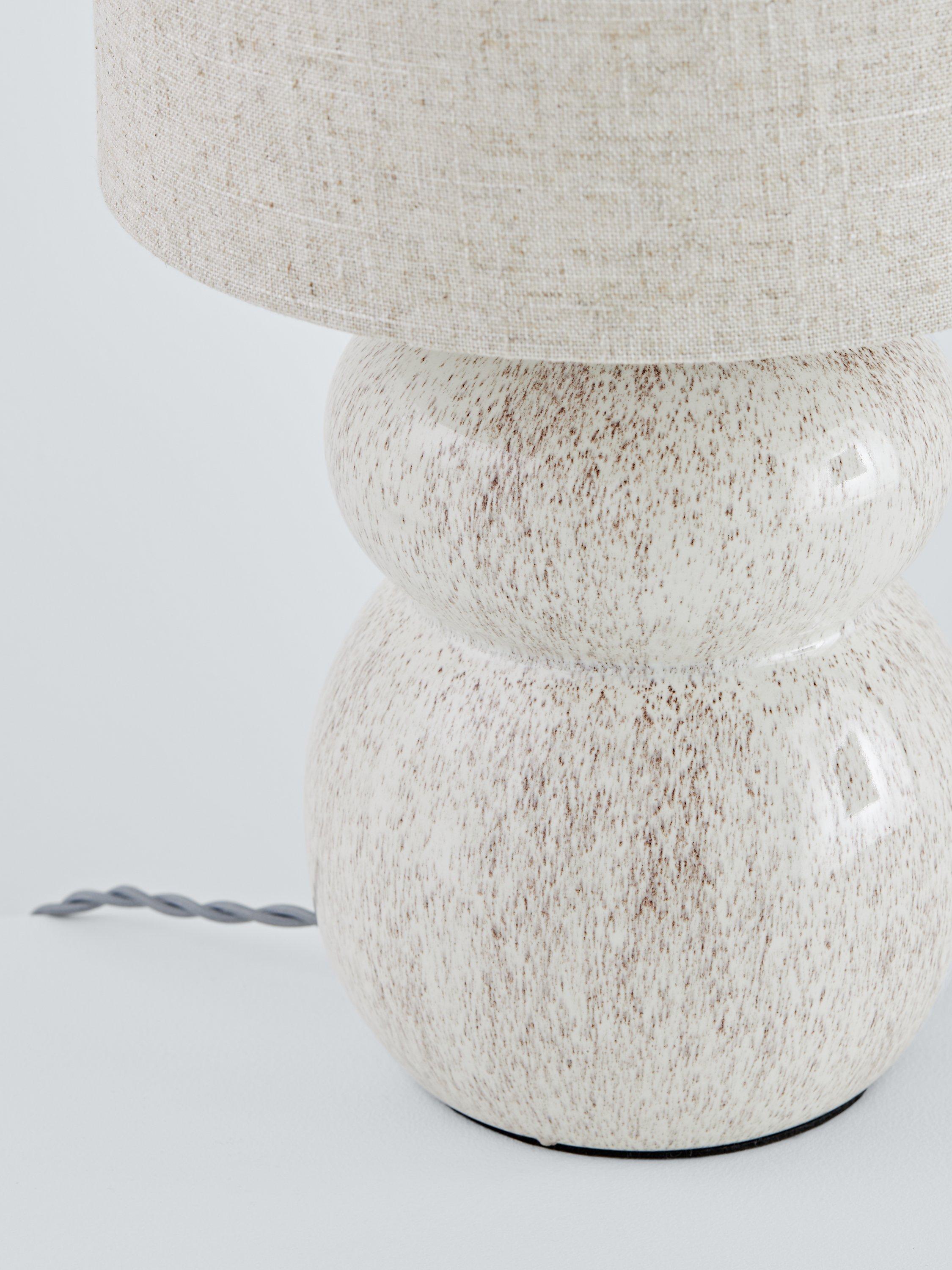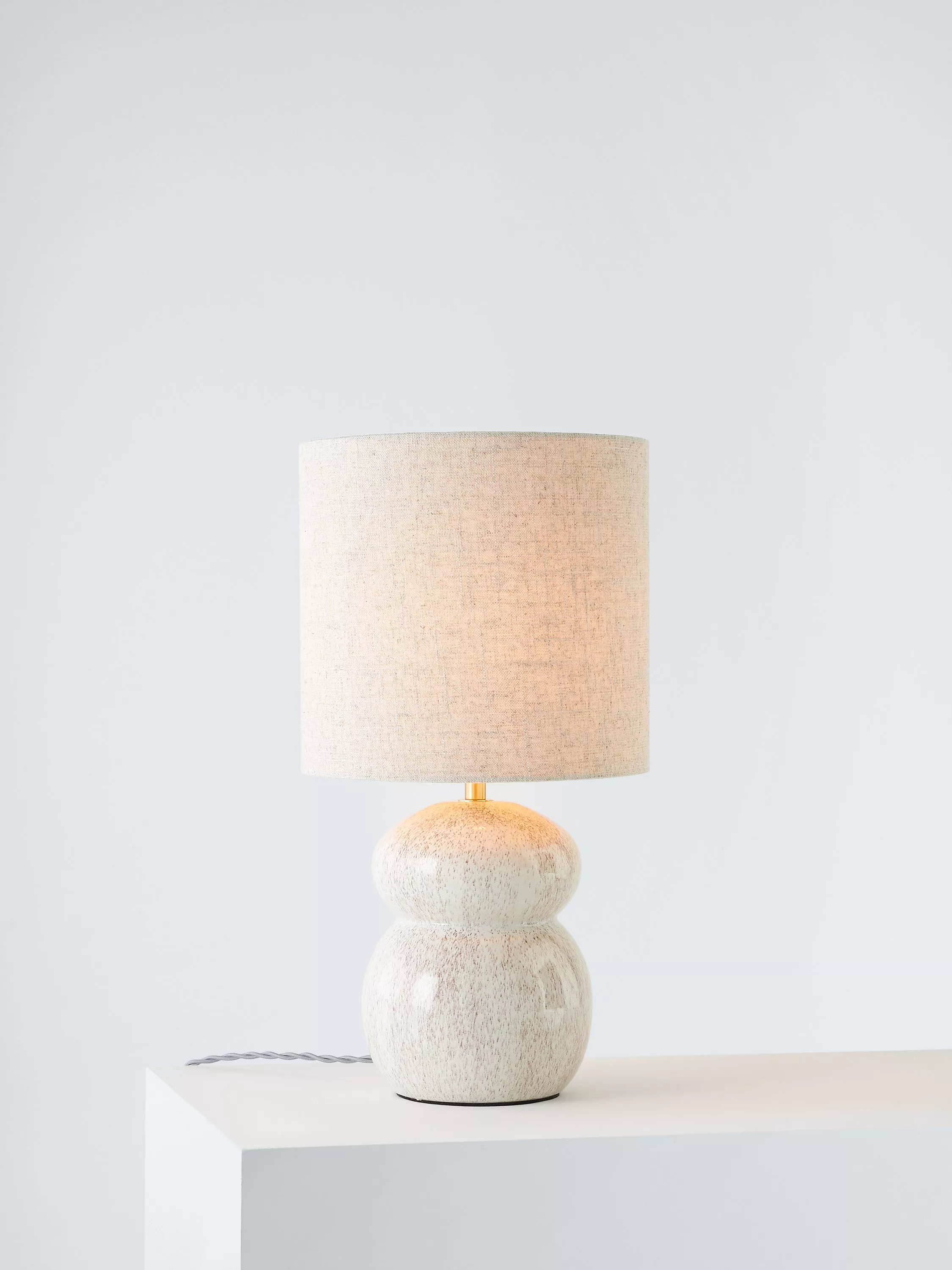Our Speckle table lamp is a real statement piece for bedside tables or living room surfaces. The stunning reactive glaze is combined with a lovely tiered ceramic base. Finished with a textured linen shade, antique brass metalwork and twisted fabric flex.