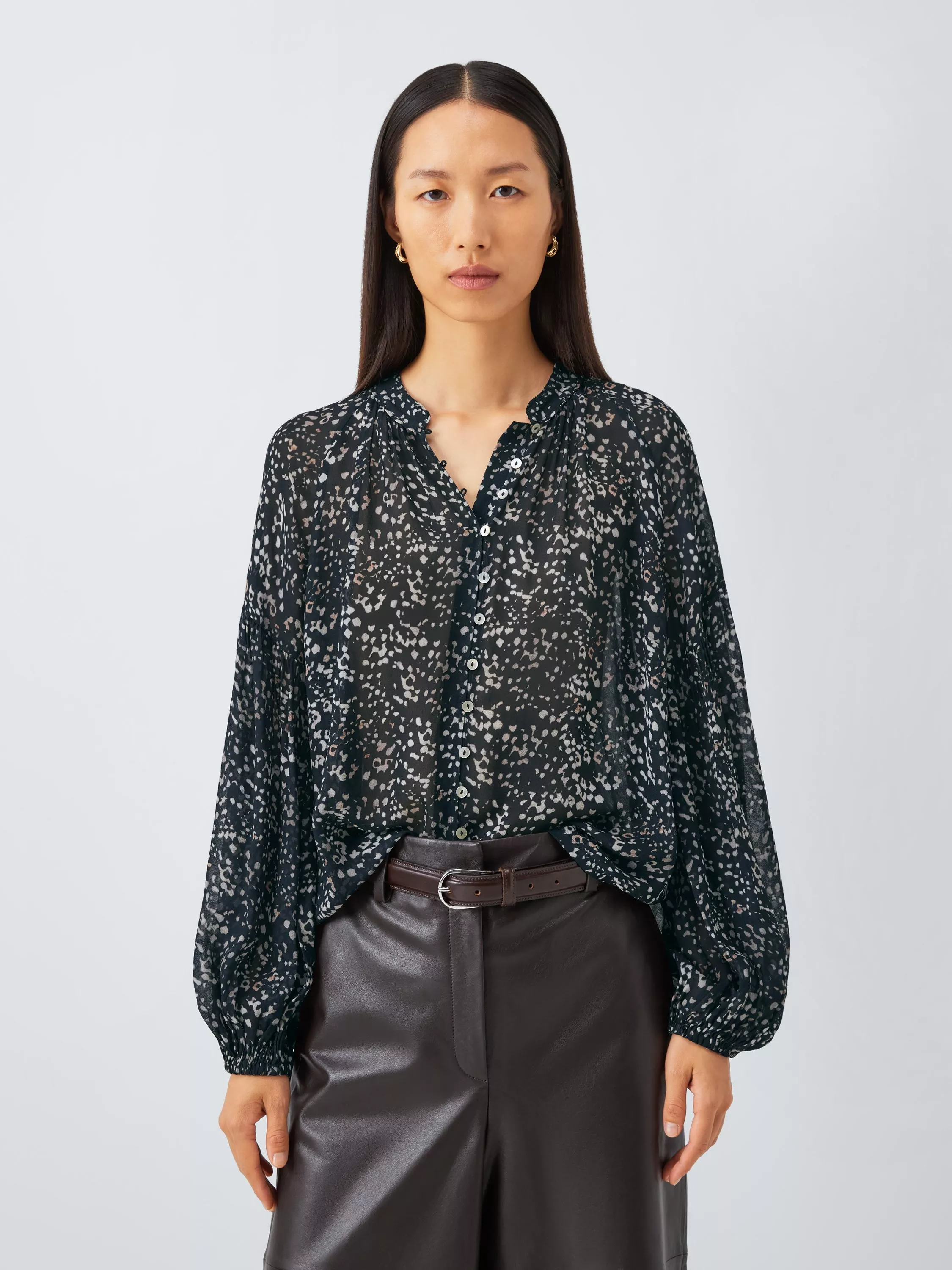 Volume sleeve blouse with an abstract speckled print in a fluid fabric that drapes beautifully. The round neckline and front feature vintage-inspired hook-and-button fastenings.
