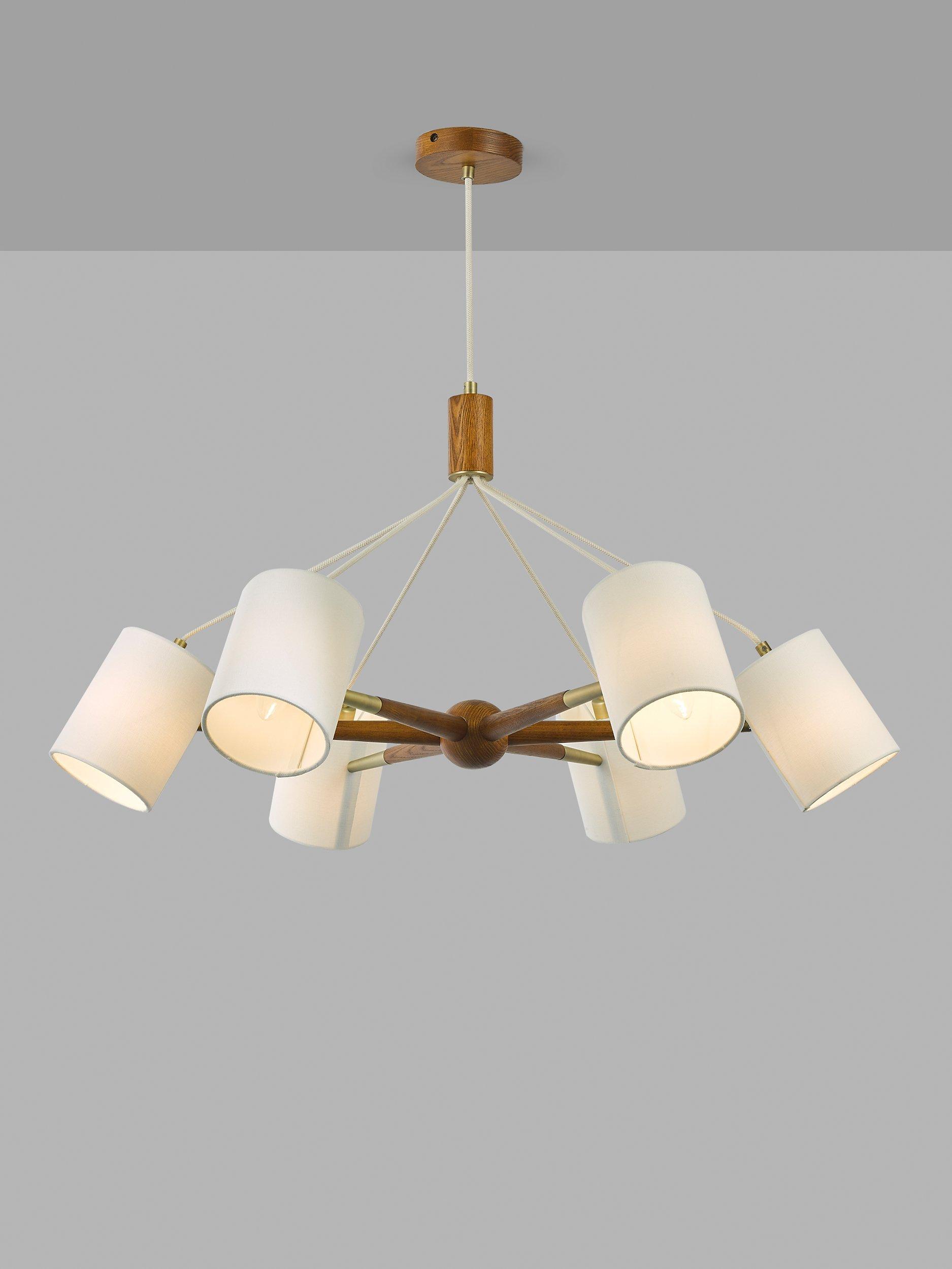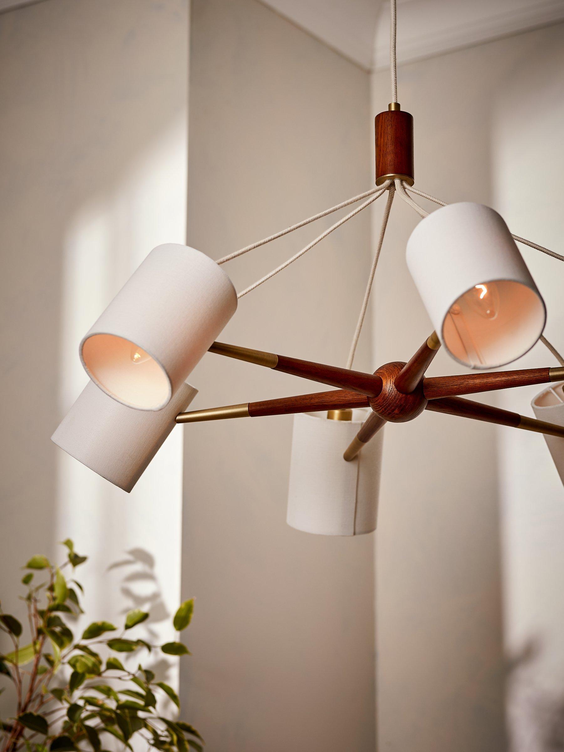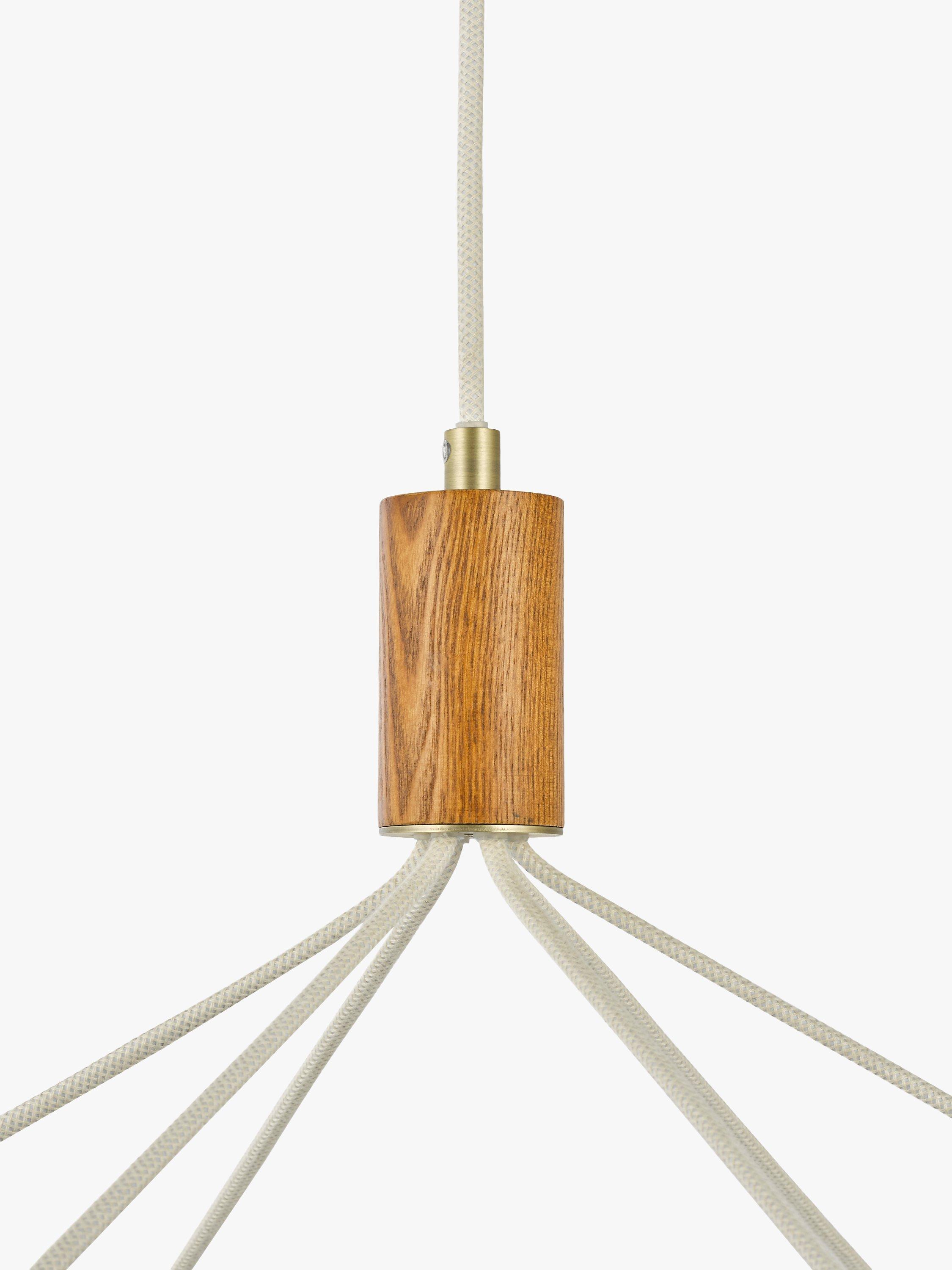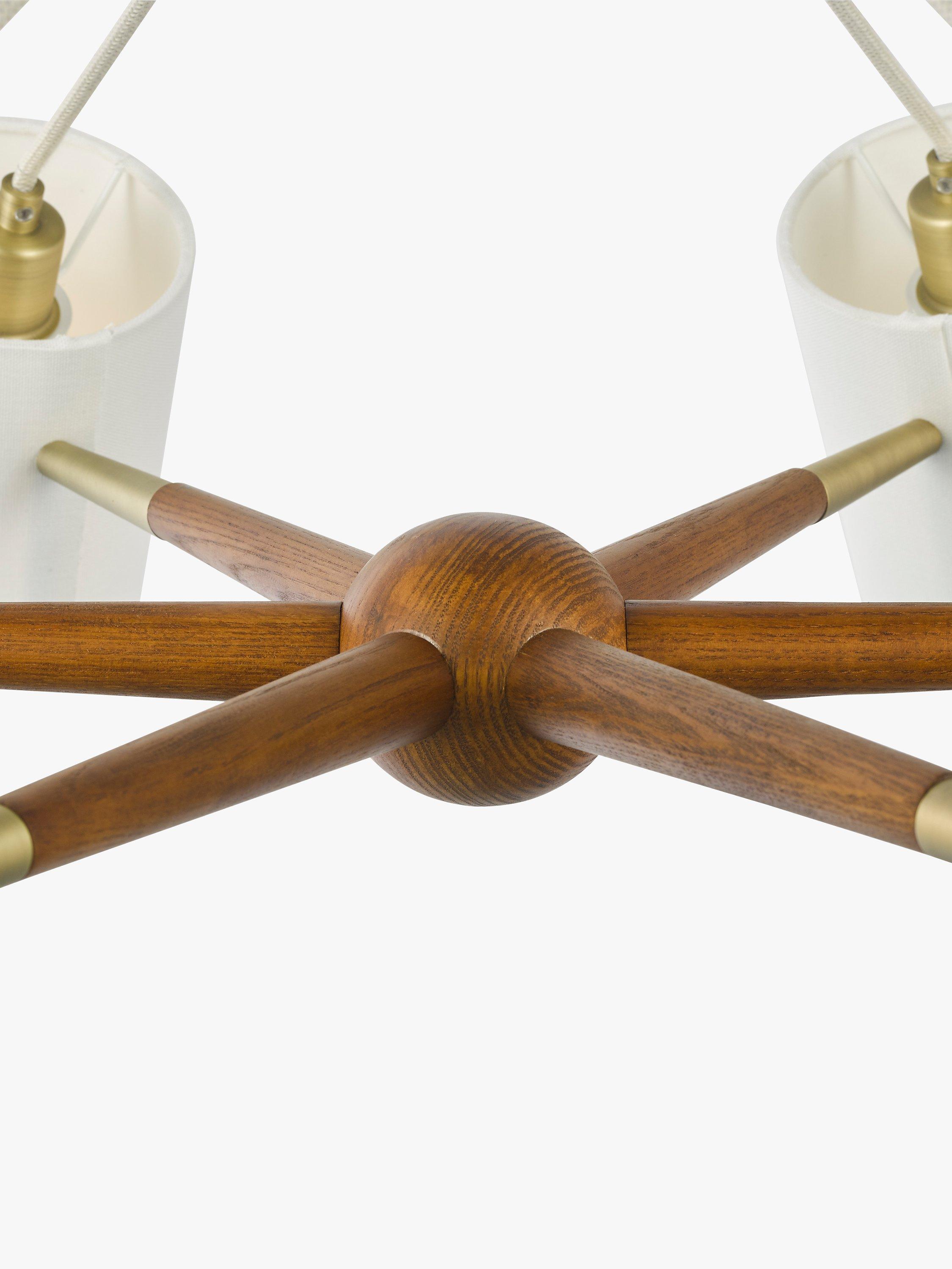 The Spindle ceiling is a stunning Mid-Century design that promises to light your home with elegant style whilst creating great impact. A real statement piece that showcases beautifully shaped, stained ash blended with matte antique brass. Finished with, oatmeal linen shades and a natural fabric flex.