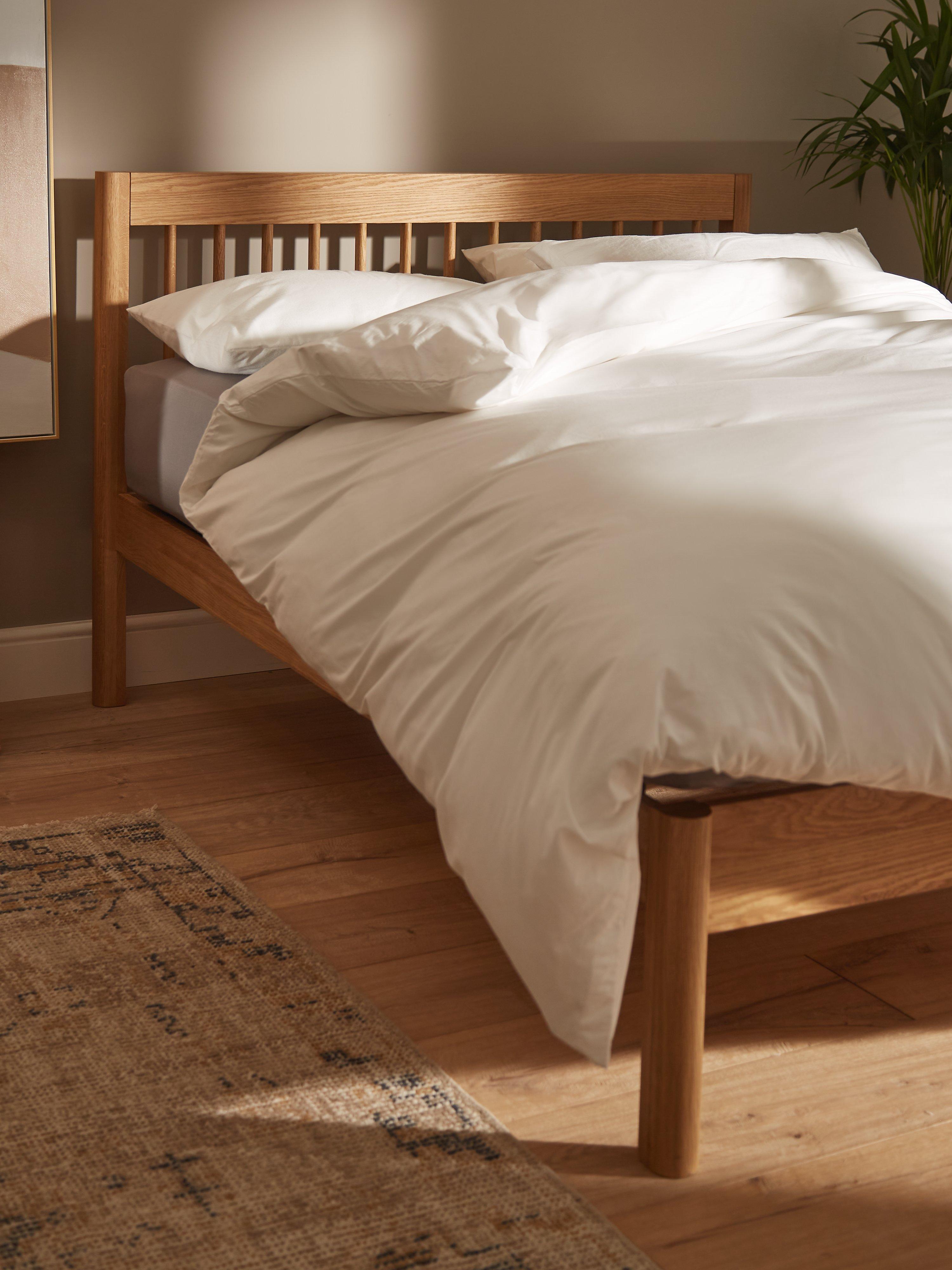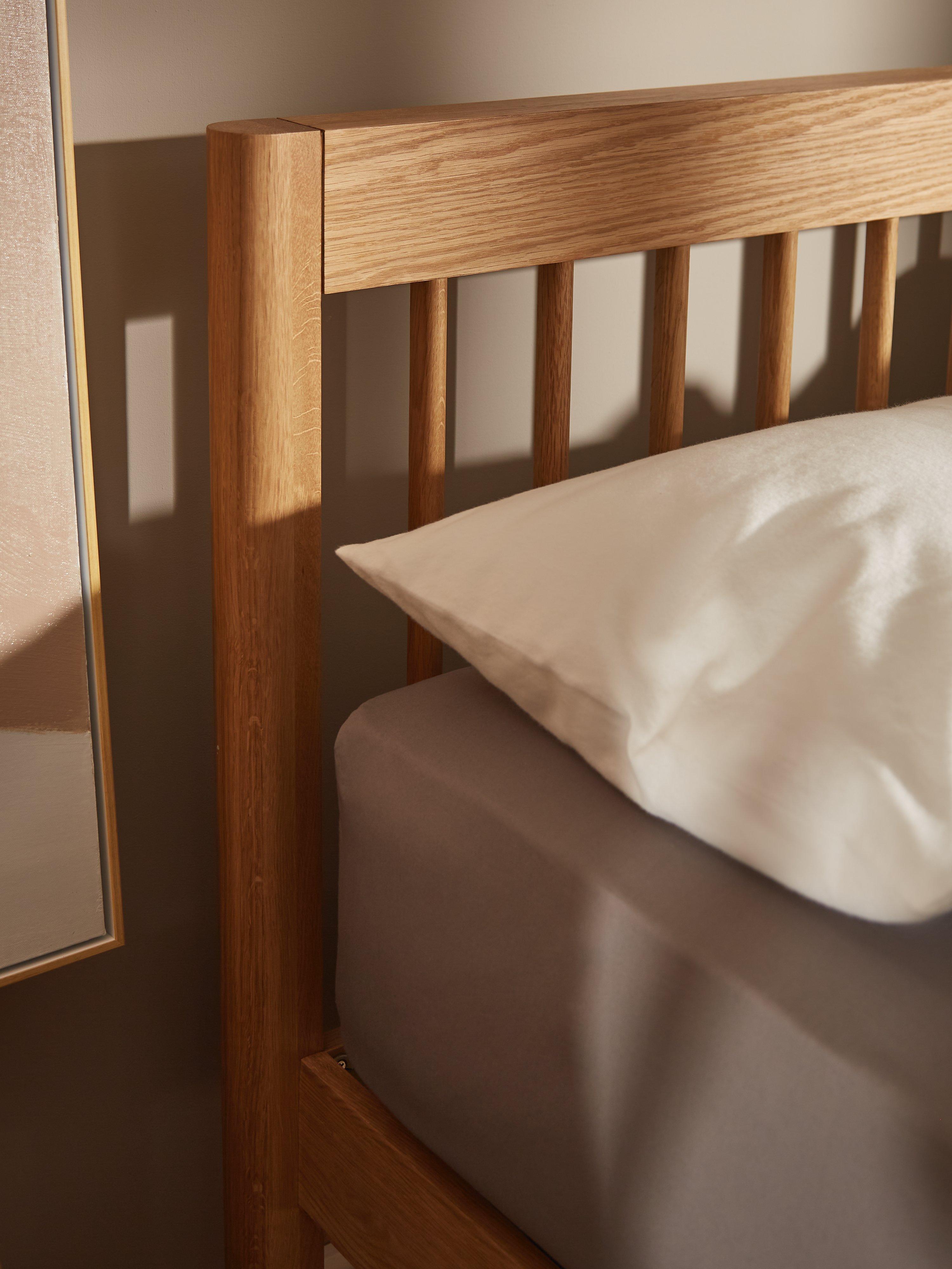 This bed frame has a charming, natural aesthetic thanks to its slatted headboard, rounded edges and shapely frame. There are supportive sprung slats in the base which your mattress will sit on top of, rather than sitting inside the frame. Available in a warm, natural or bold painted finish. Simply layer your bed with linens and cosy throws and create the perfect sleep spot.