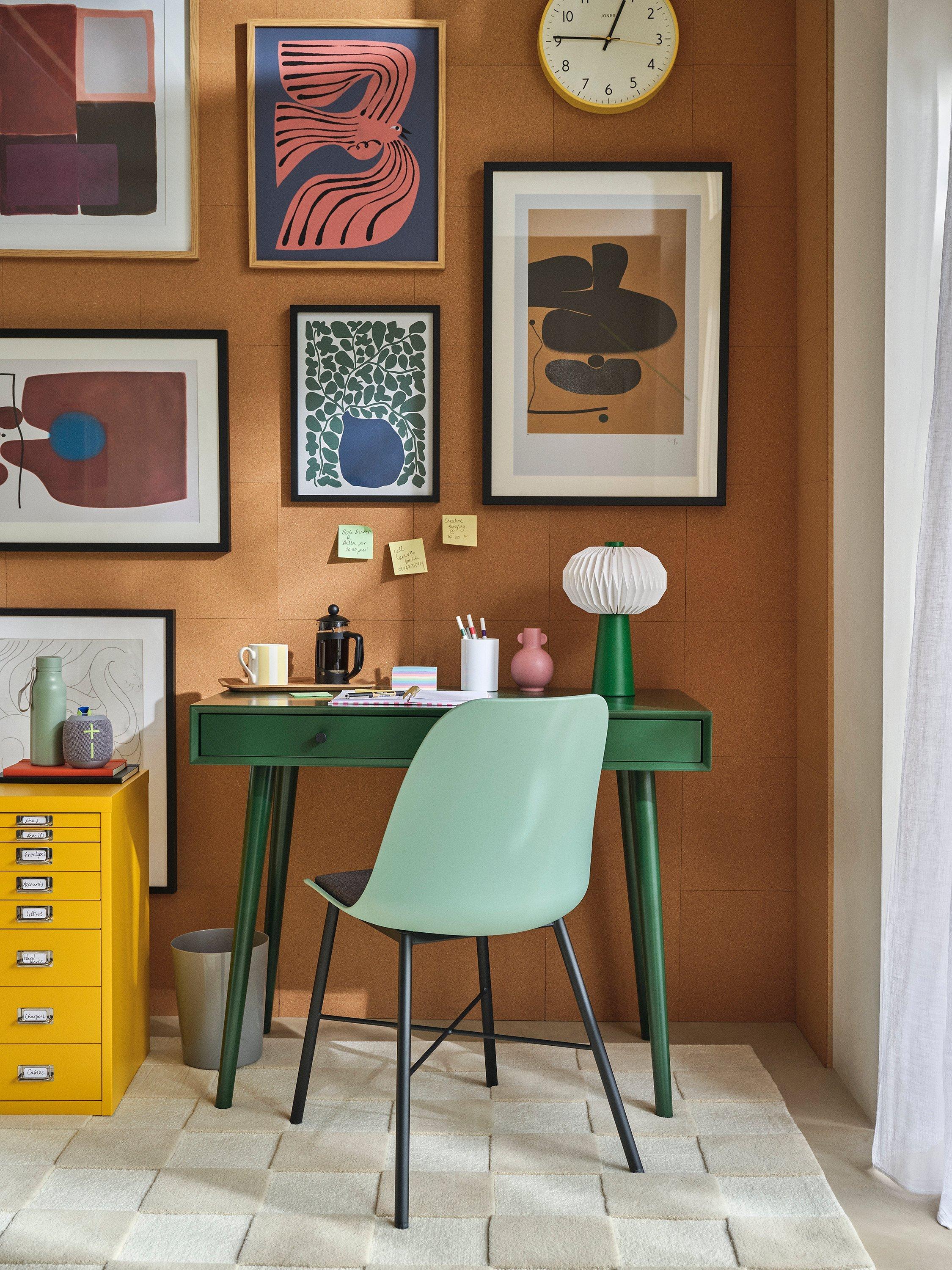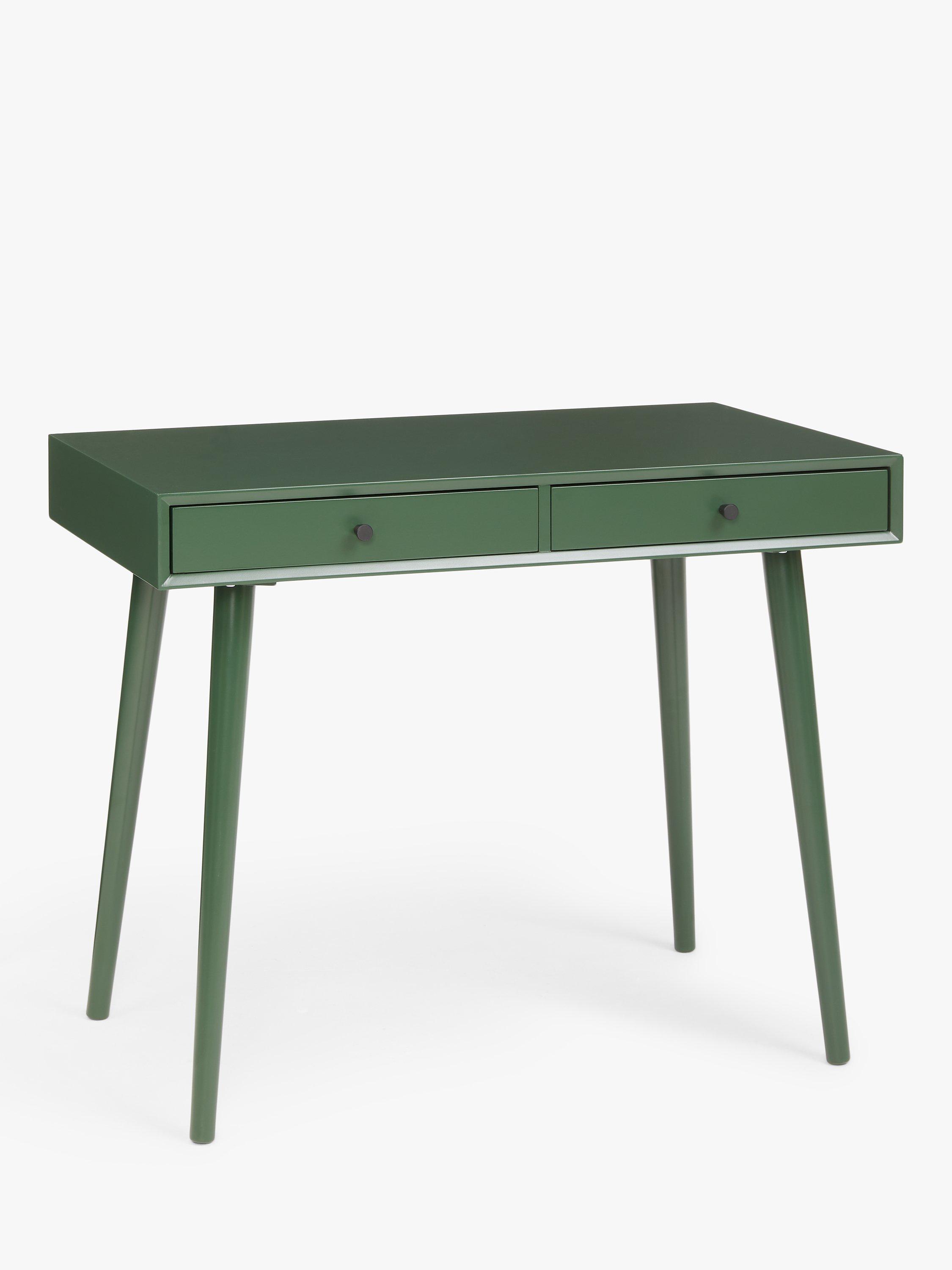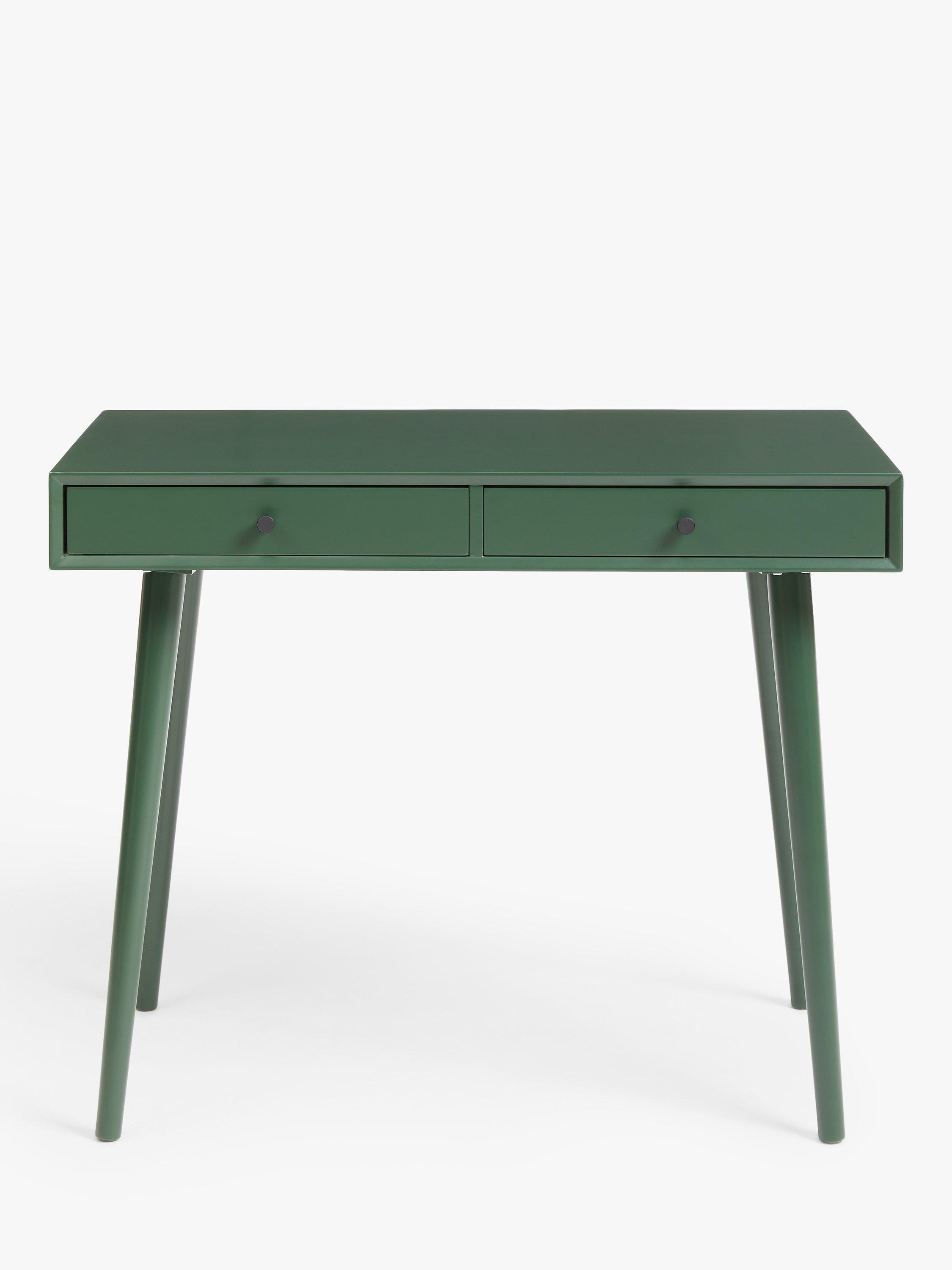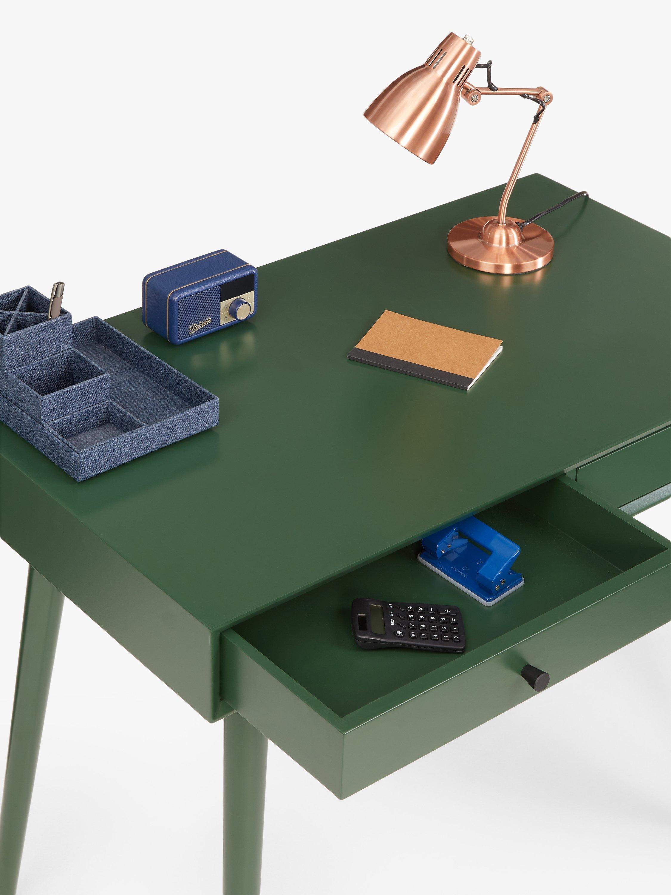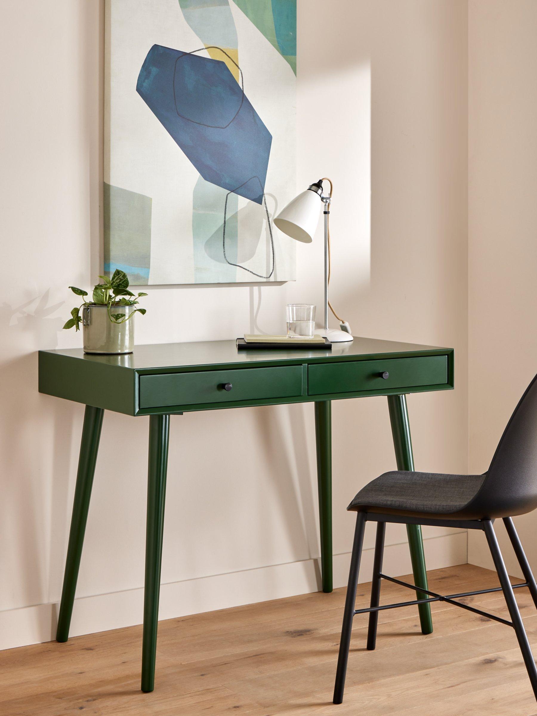This desk is ideal for injecting colour into smaller rooms. It's a compact size and we've made it from sturdy MDF and bamboo, which is one of the most renewable, durable and readily available raw materials in the world. There are two useful storage drawers and the spindle-shaped legs provide a stable base while adding a softer-design accent. Painted in a bold colour so you can turn your home office into a creative space.
