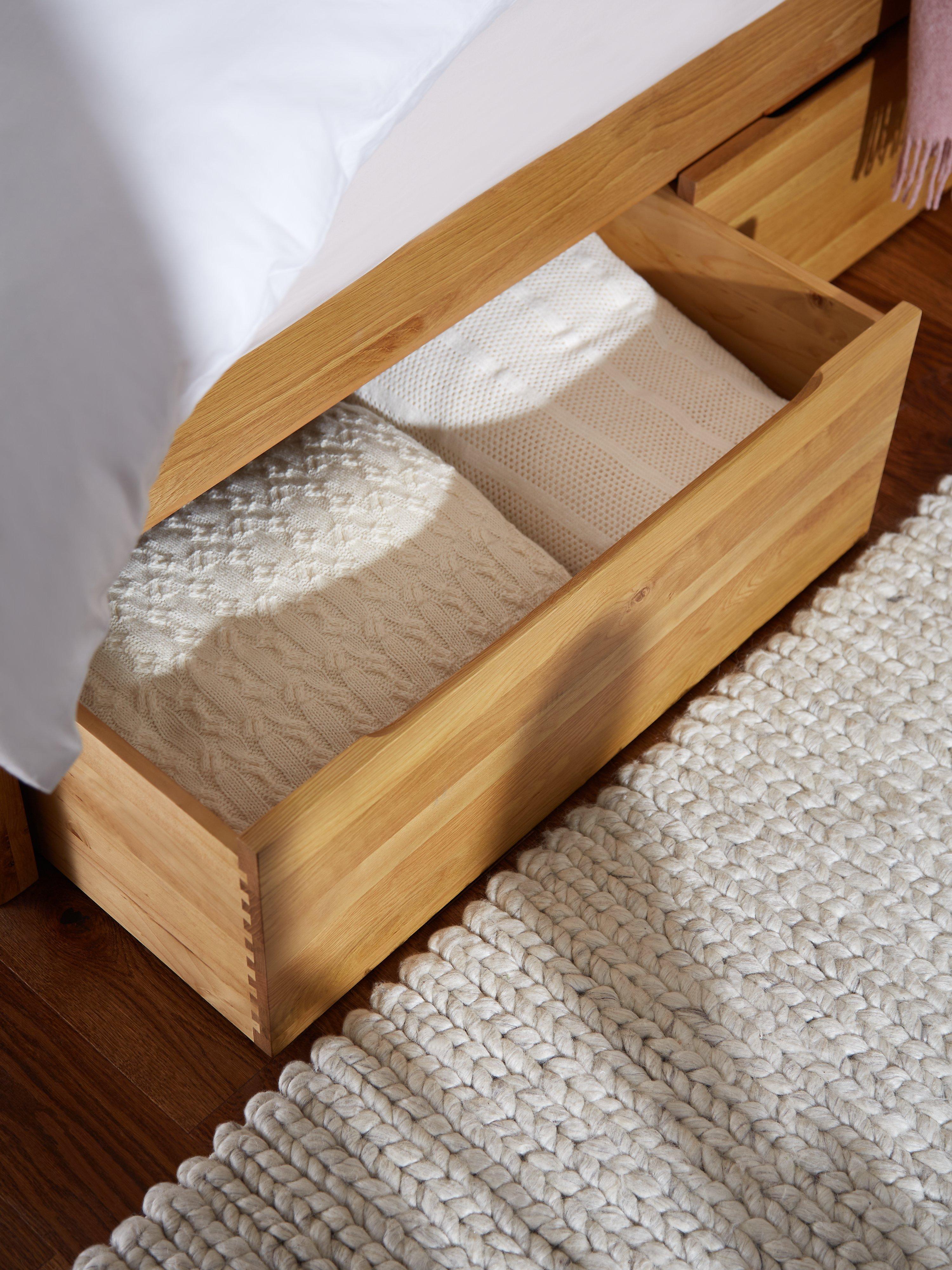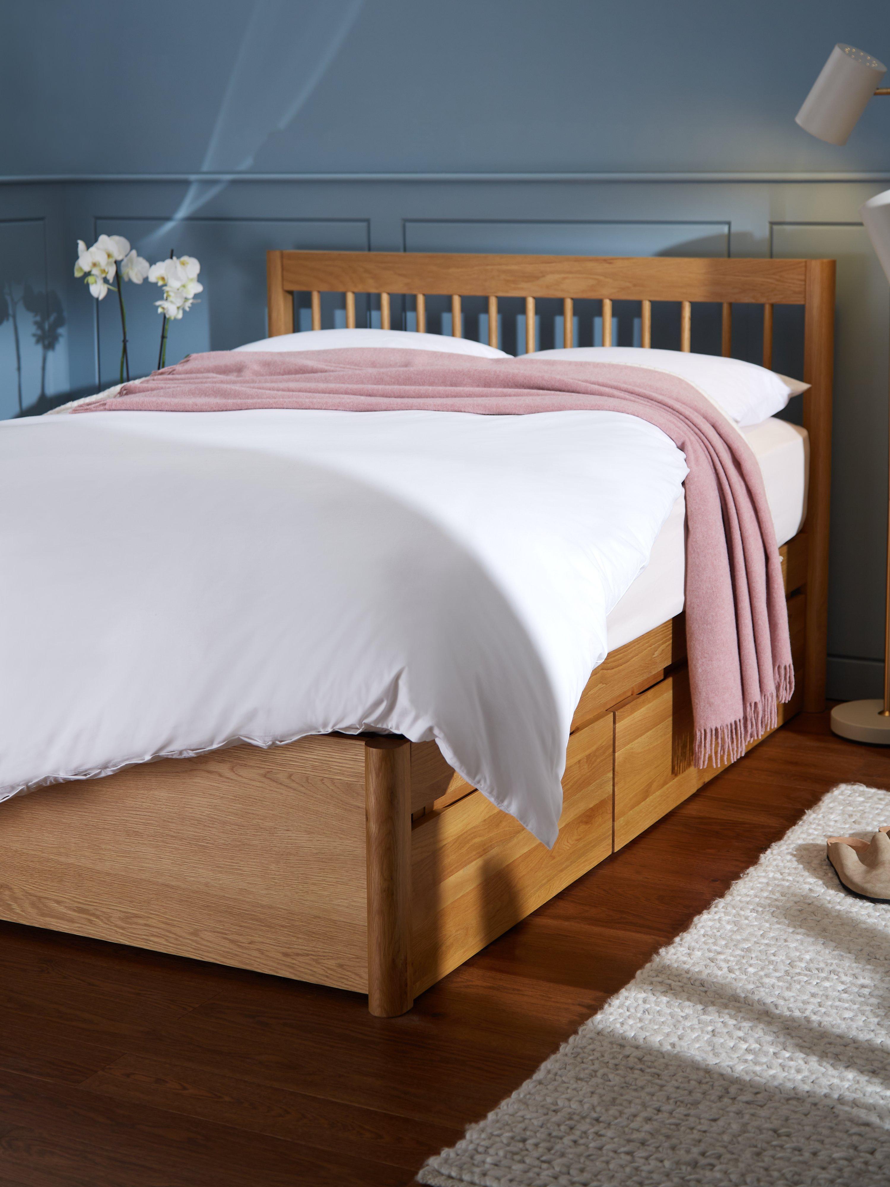 Our in-house designers focused on sturdy woodwork and softer shapes when creating our Spindle range of bedroom furniture. If you're in need of extra storage space in your bedroom, this bed frame is designed with three deep, pull-out drawers on either side of the frame, so there's no excuse for clutter when your spare bed linens, extra clothes and even shoes have a new home.
