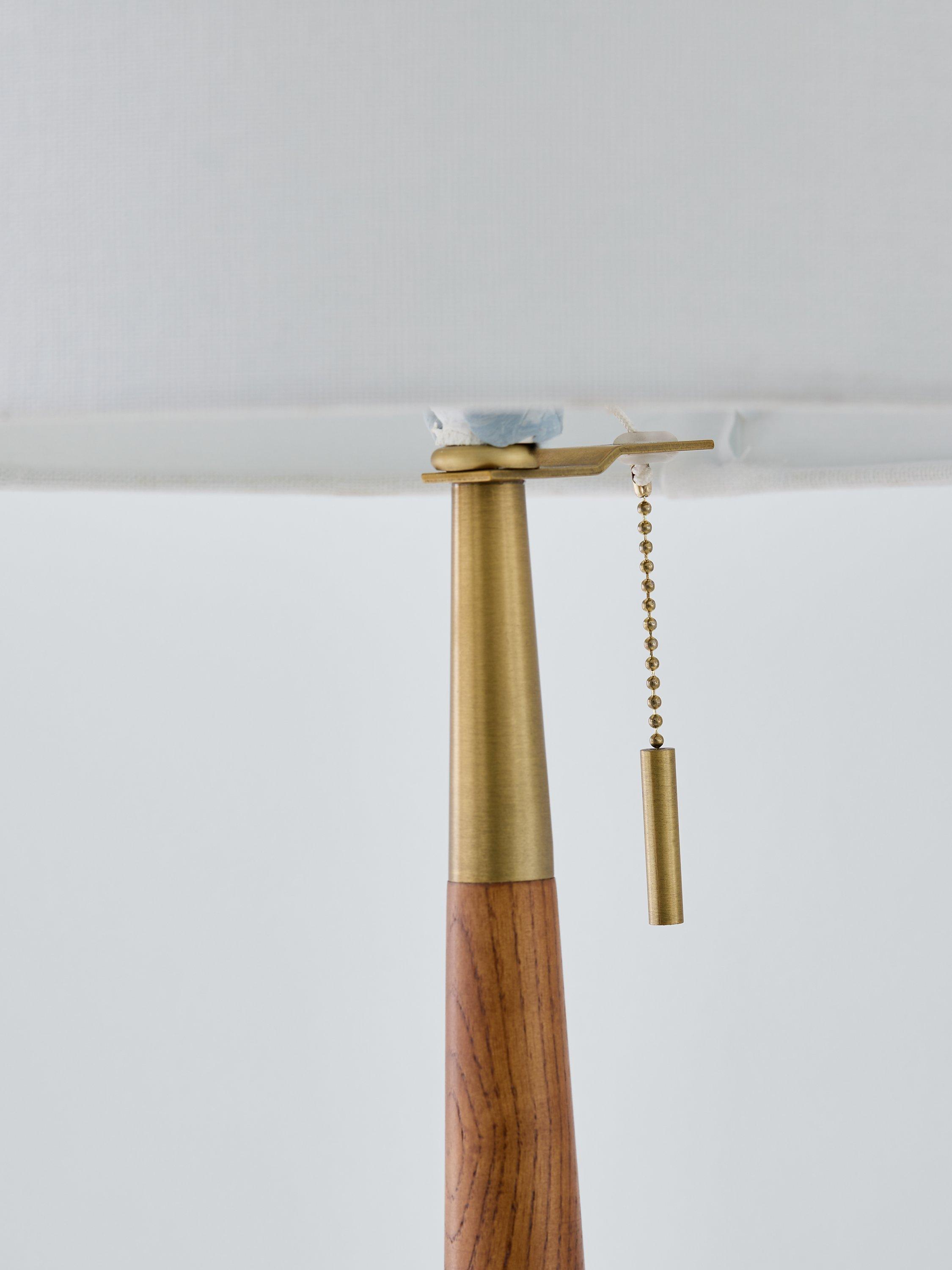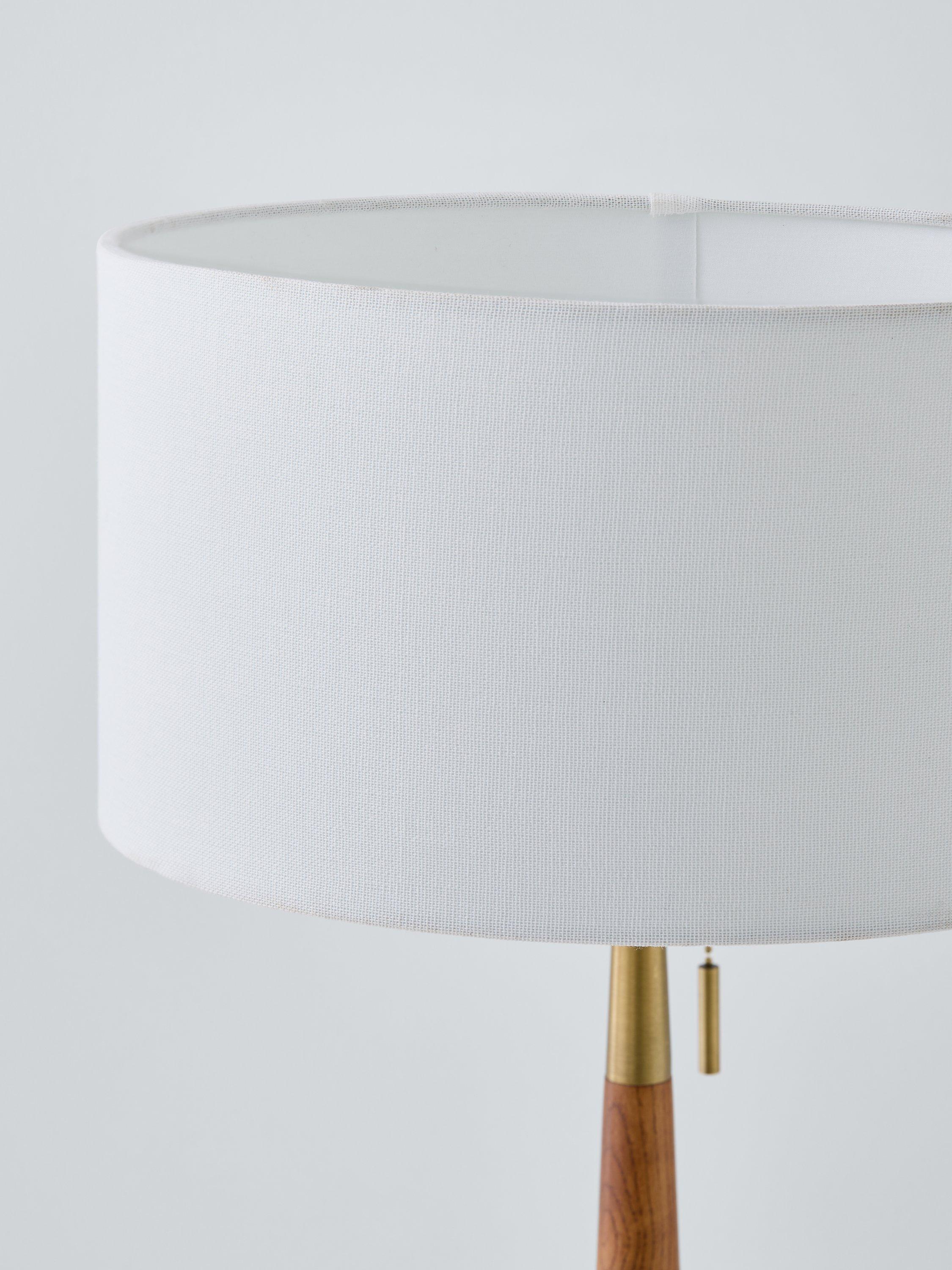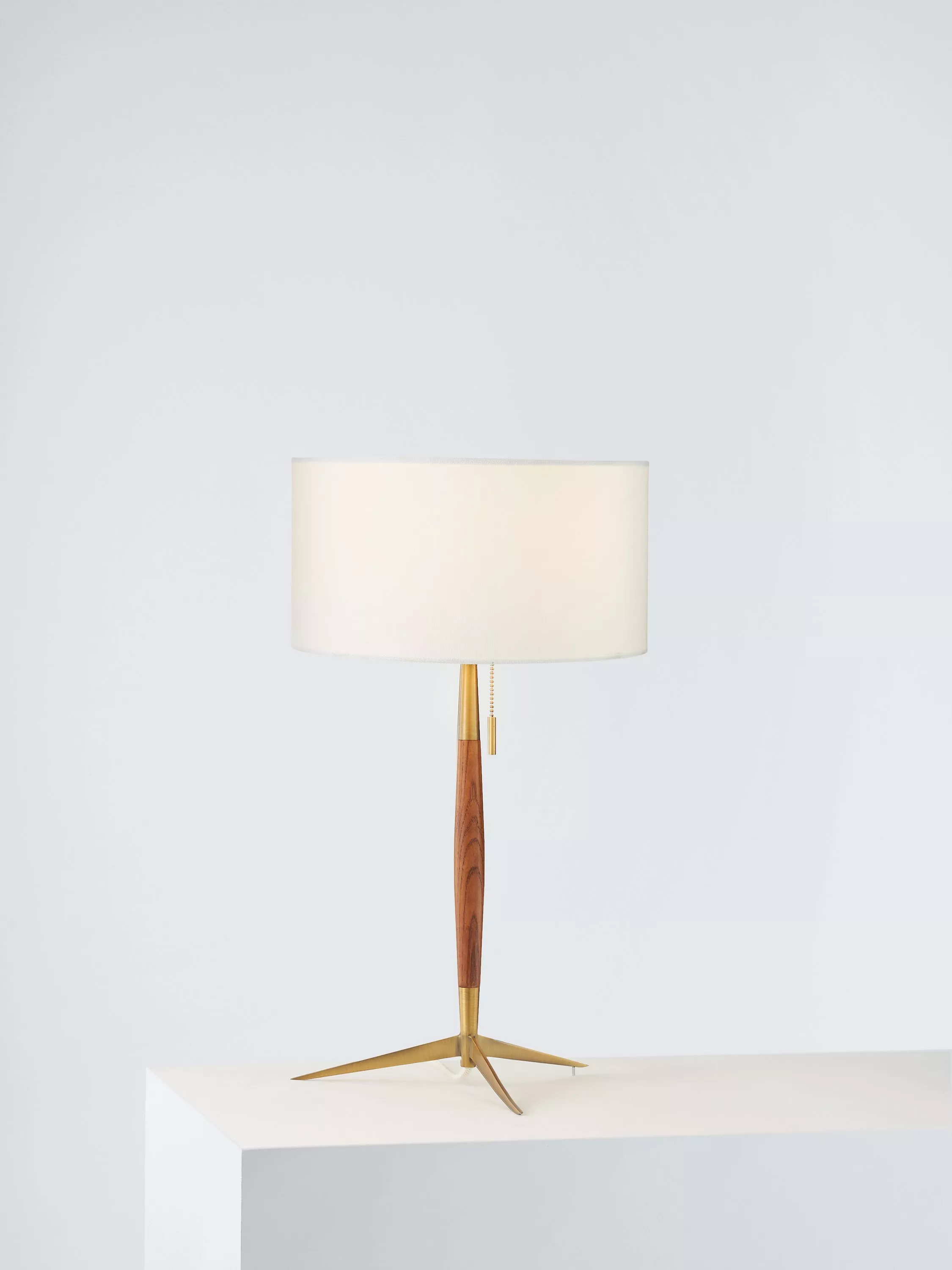 Made from walnut stained ash wood and accented with brushed brass details, we've designed the base of this table lamp with a Mid-Century aesthetic in mind. Its sleek, spindle-shaped frame and tripod-style base won't take up too much space on your surface top, and the linen lampshade will enhance a warm wash of light.