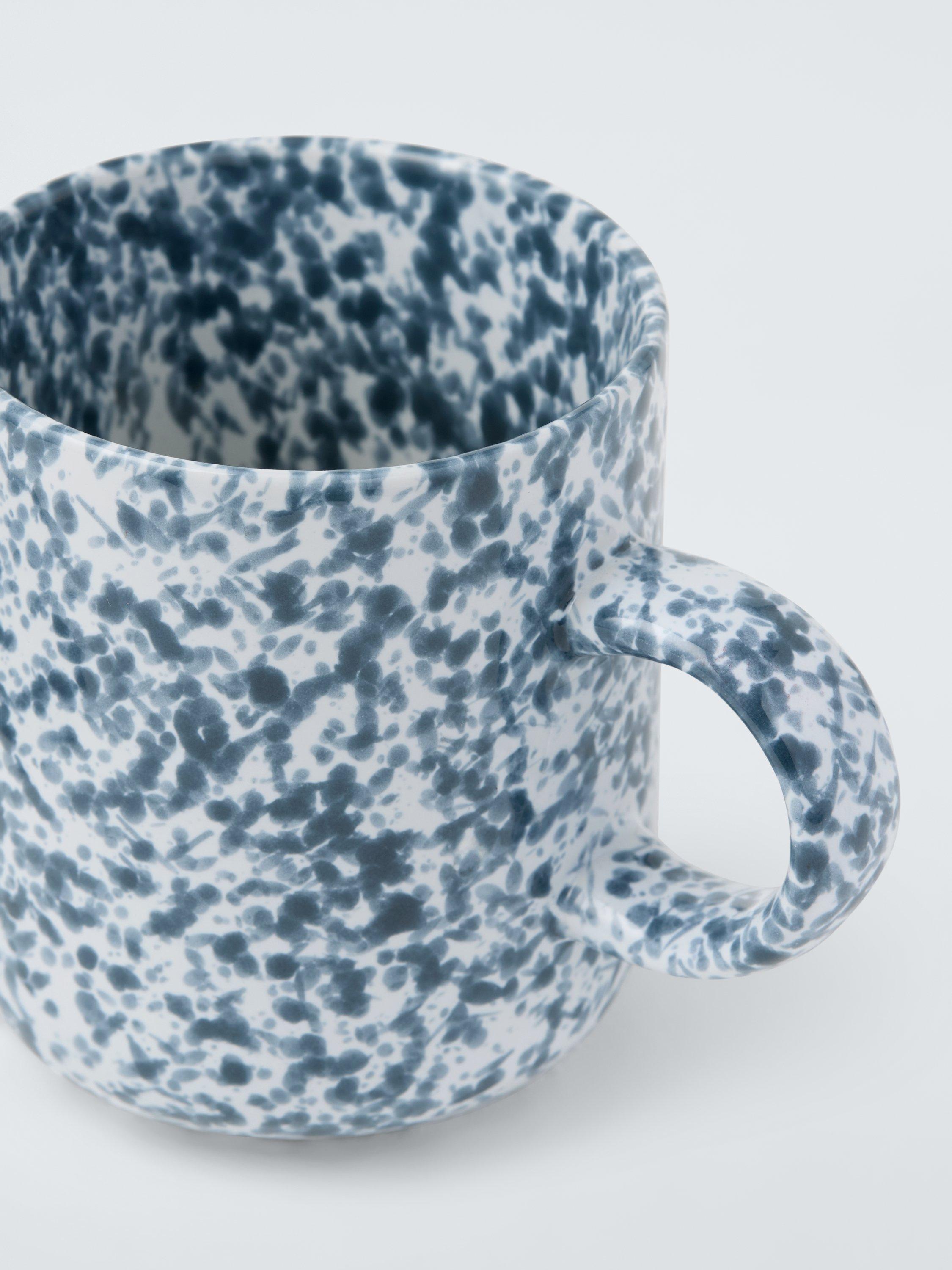 Stoneware mug with a splattered paint design. Dishwasher and microwave safe for everyday use.