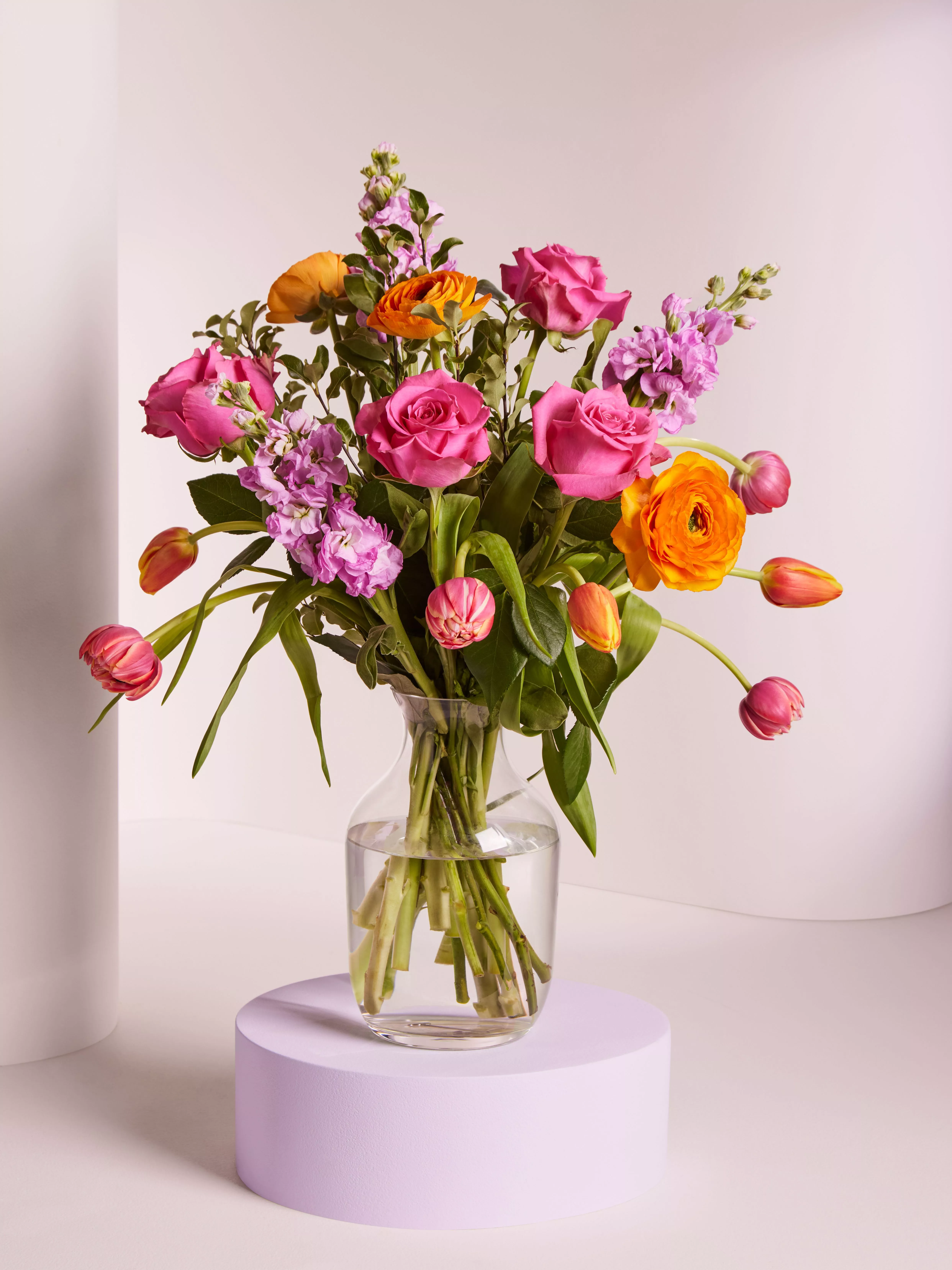 Enjoy this stunning mix of vibrant blooms, paired with roses and tulips for a soft, romantic touch. Bringing a burst of sunshine are orange ranunculus and tulips, mixed with pink tulips Columbus, intermediate Pink Revival roses and Matthiola Pink, filled out with Irish Mini Pitto for greenery and texture to complete the look.