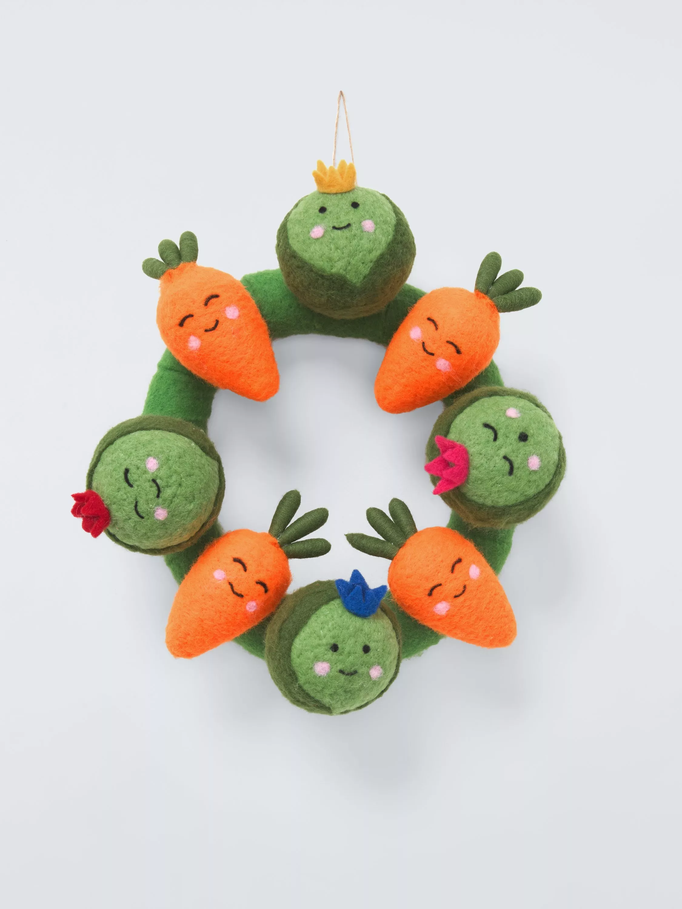 This small wreath is a celebration of winter veg, with smiley felt carrots and sprouts in Christmas hats.