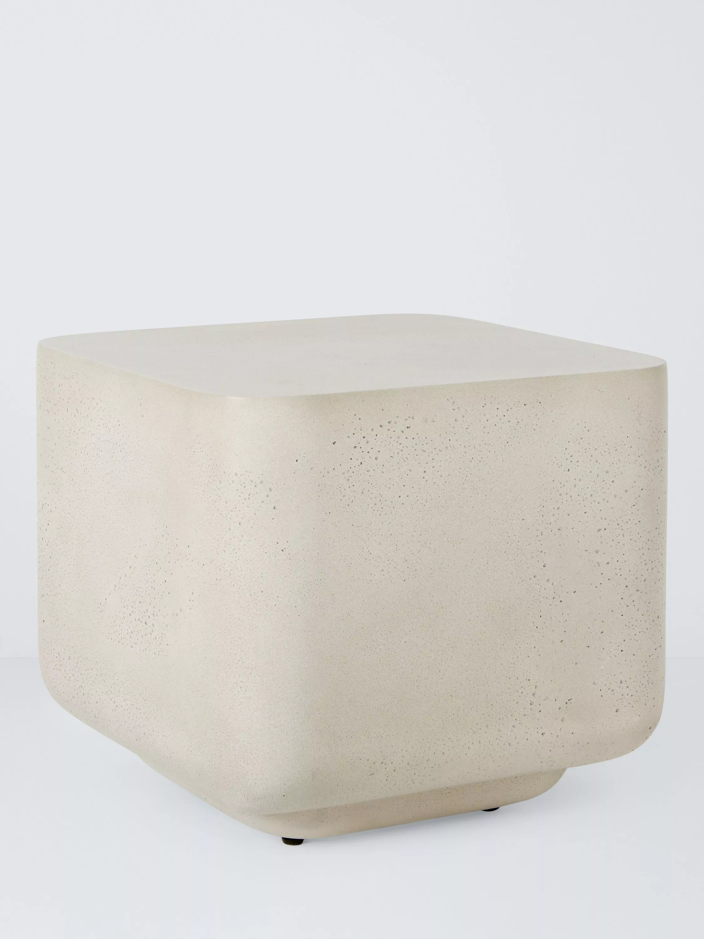 Contemporary side table made using concrete-like material to create a fluid shape. A solid-looking design that's relatively light in weight compared to standard concrete and much easier to move. The material is robust, durable and corrosion-resistant, making it ideal for use in the garden.