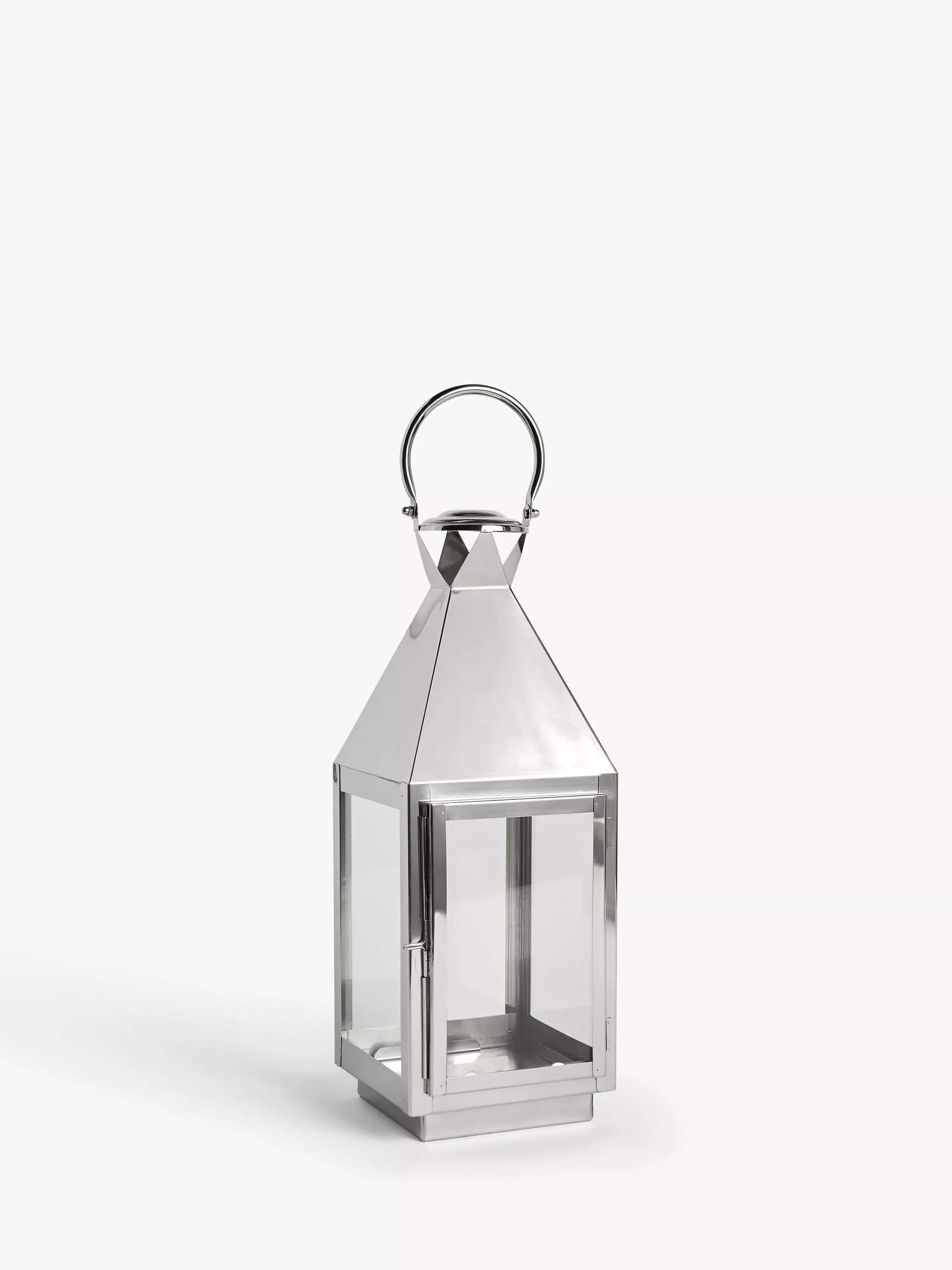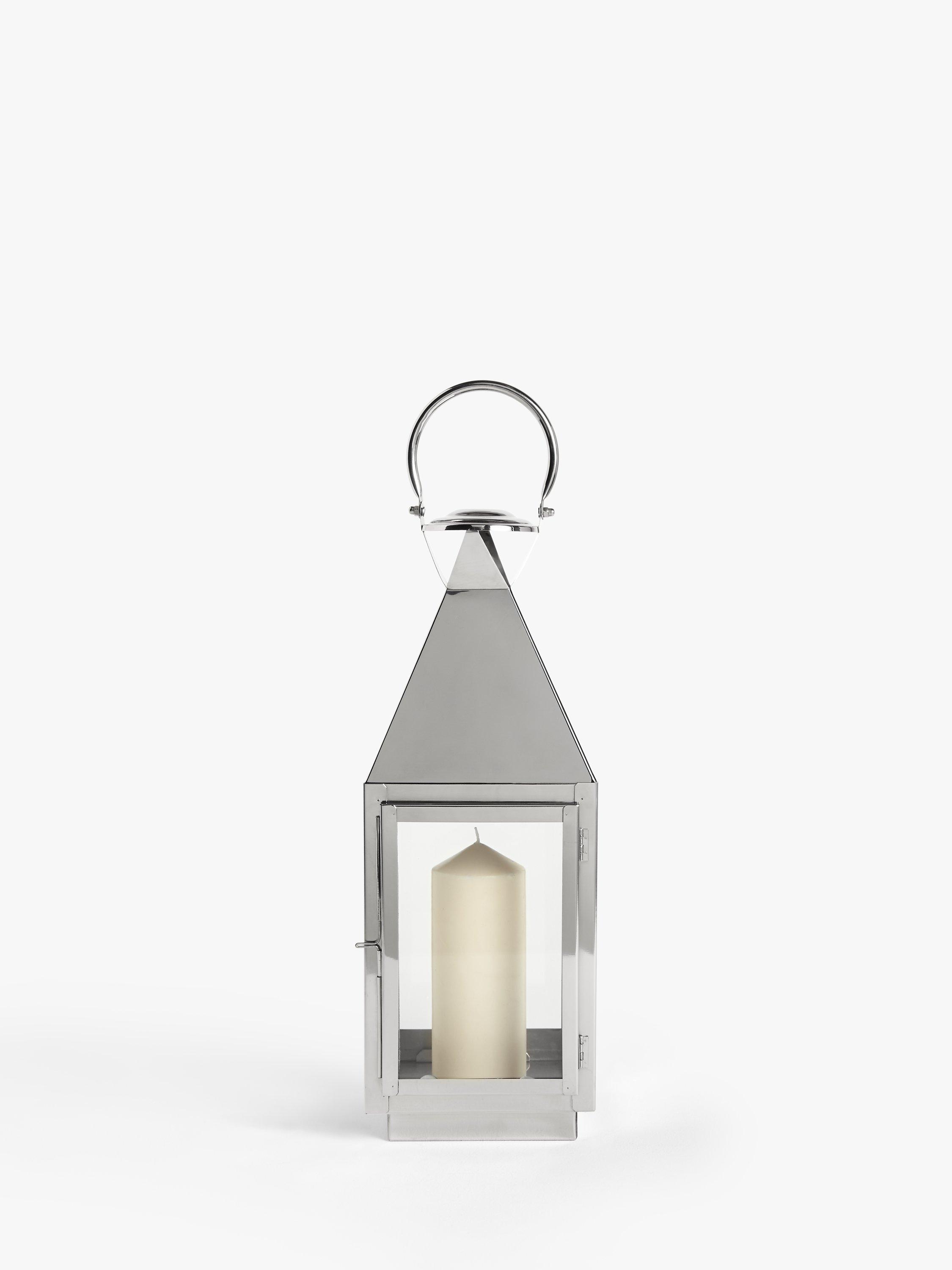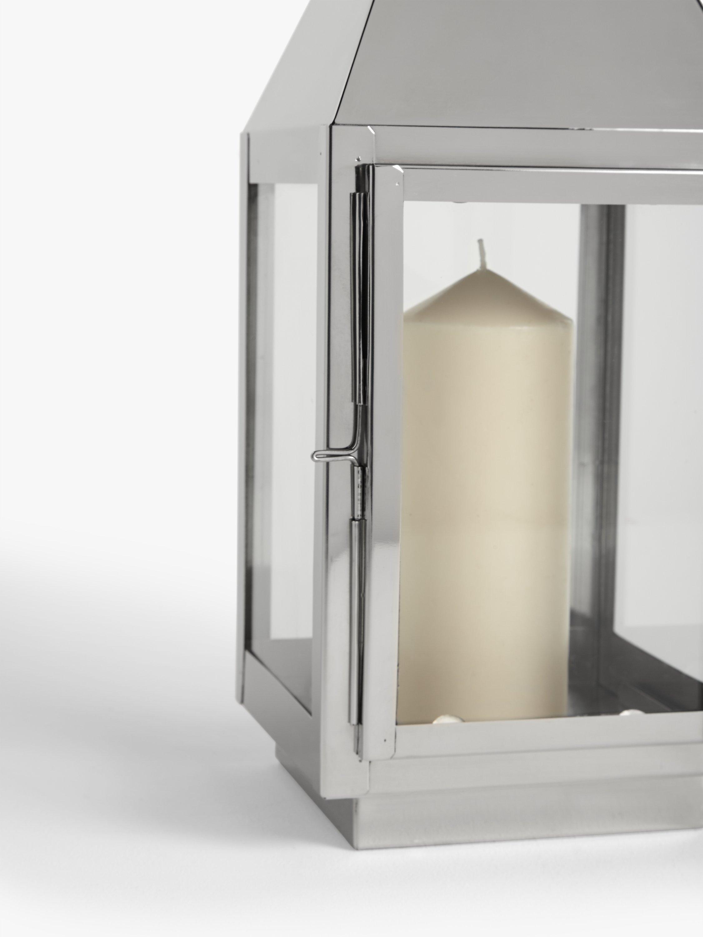 In a freestanding design, meaning it can be displayed on a surface or hung from a decorative beam, this lantern-style candle holder is made using a durable, high-gauge stainless steel.