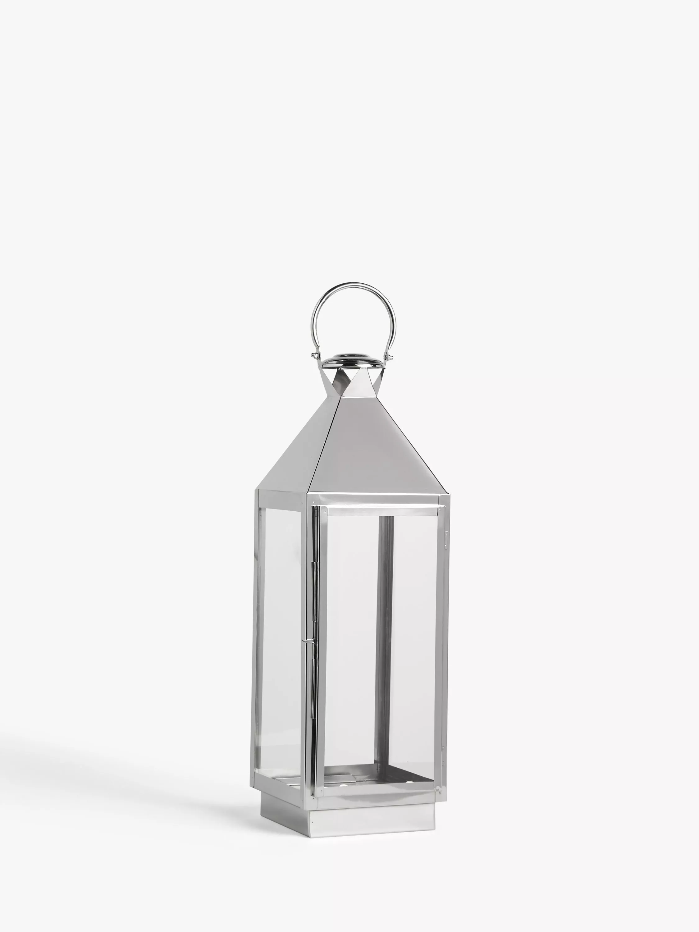 In a freestanding design, meaning it can be displayed on a surface or hung from a decorative beam, this lantern-style candle holder is made using a durable, high-gauge stainless steel.