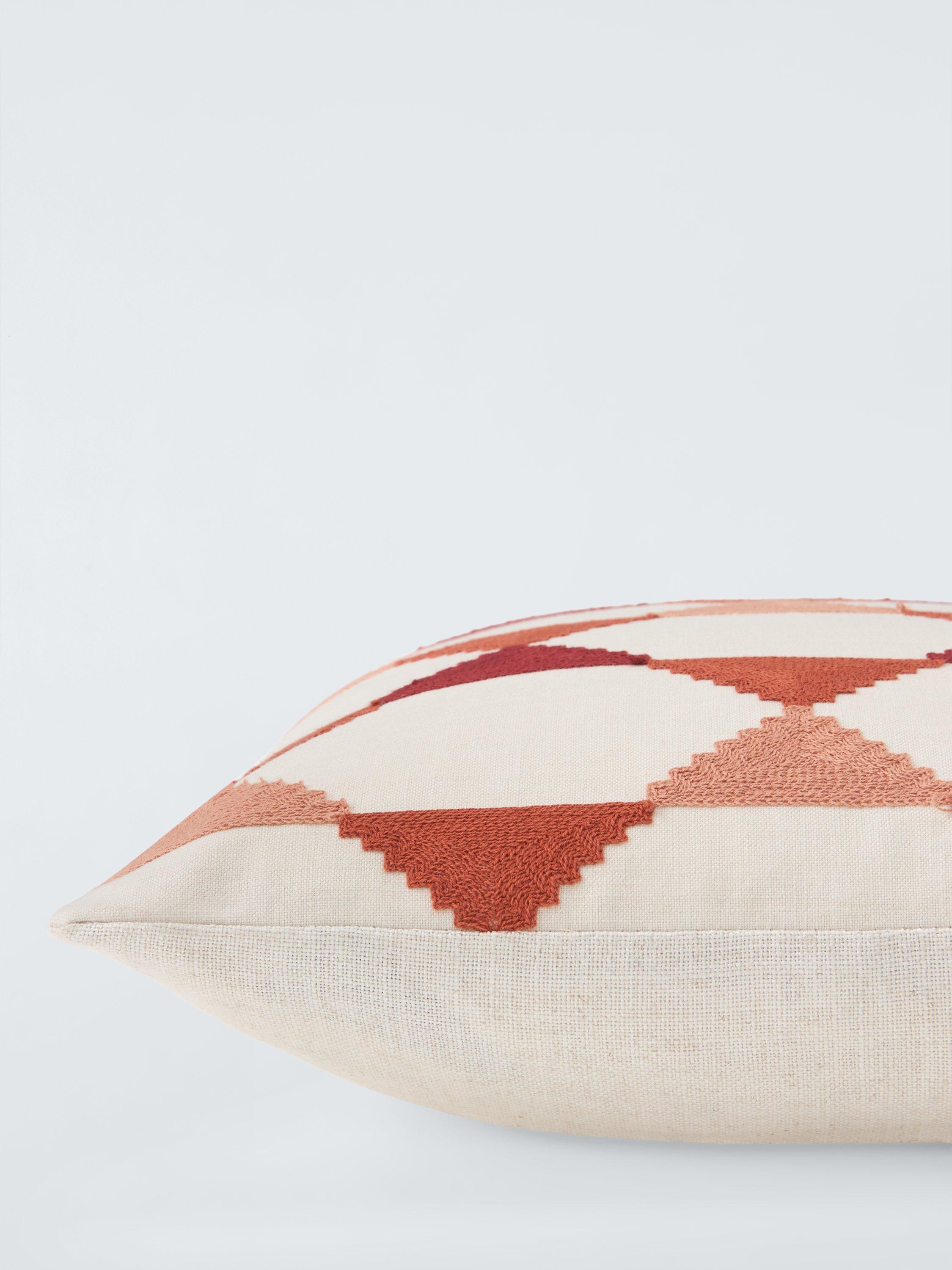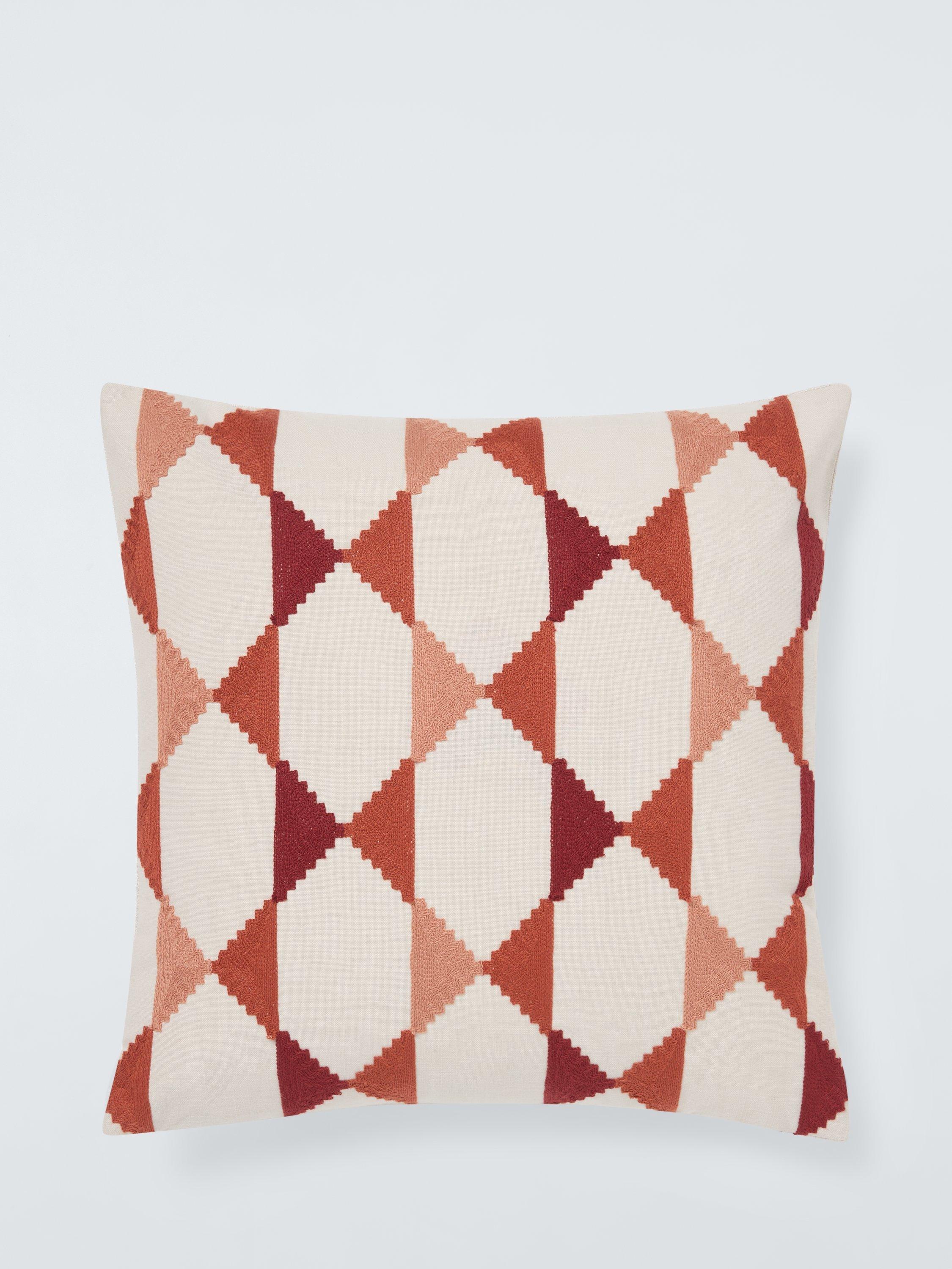 This on-trend geometric design is woven with triangular "stacks" of colour on a natural background. The reverse is plan.