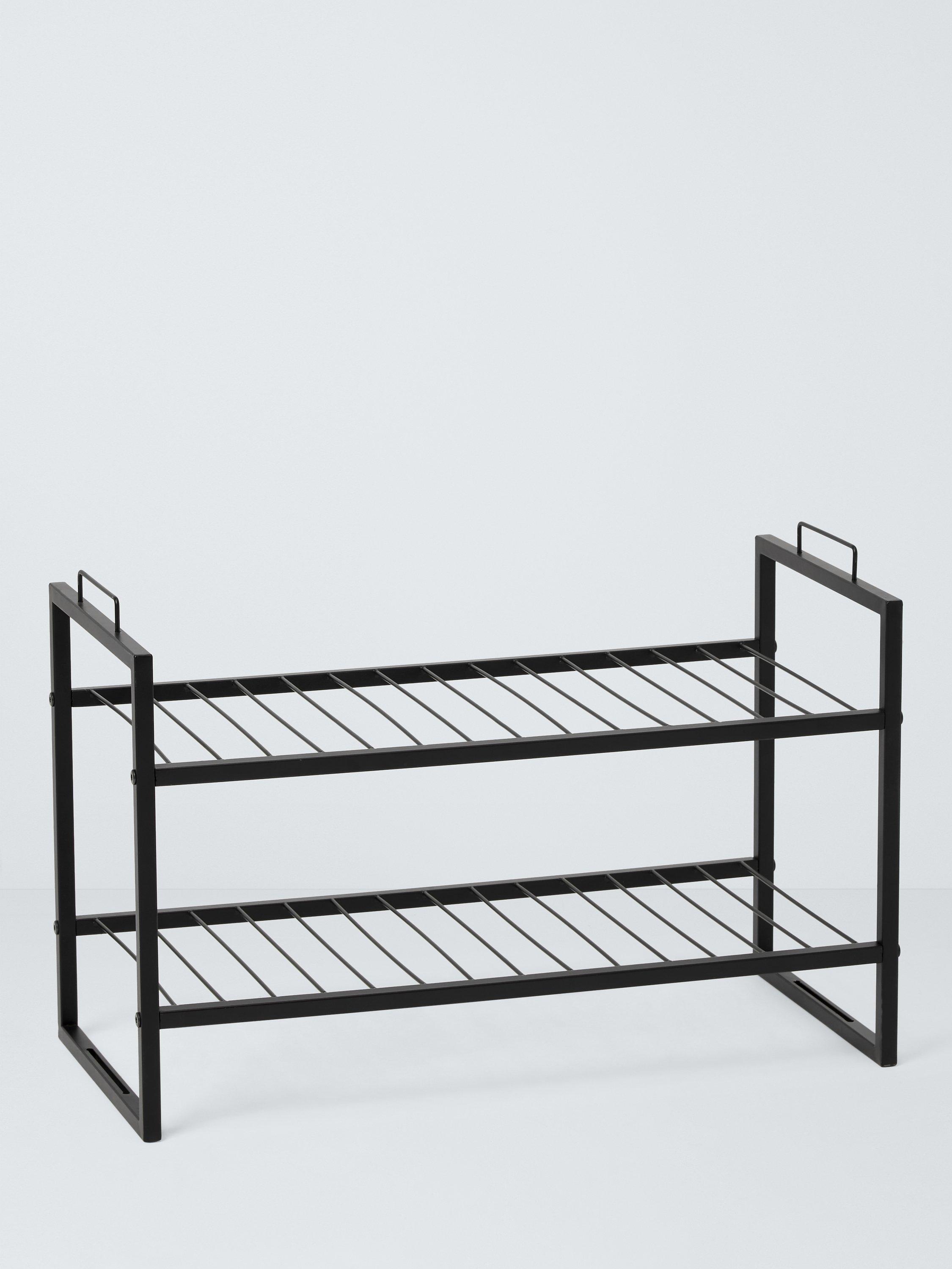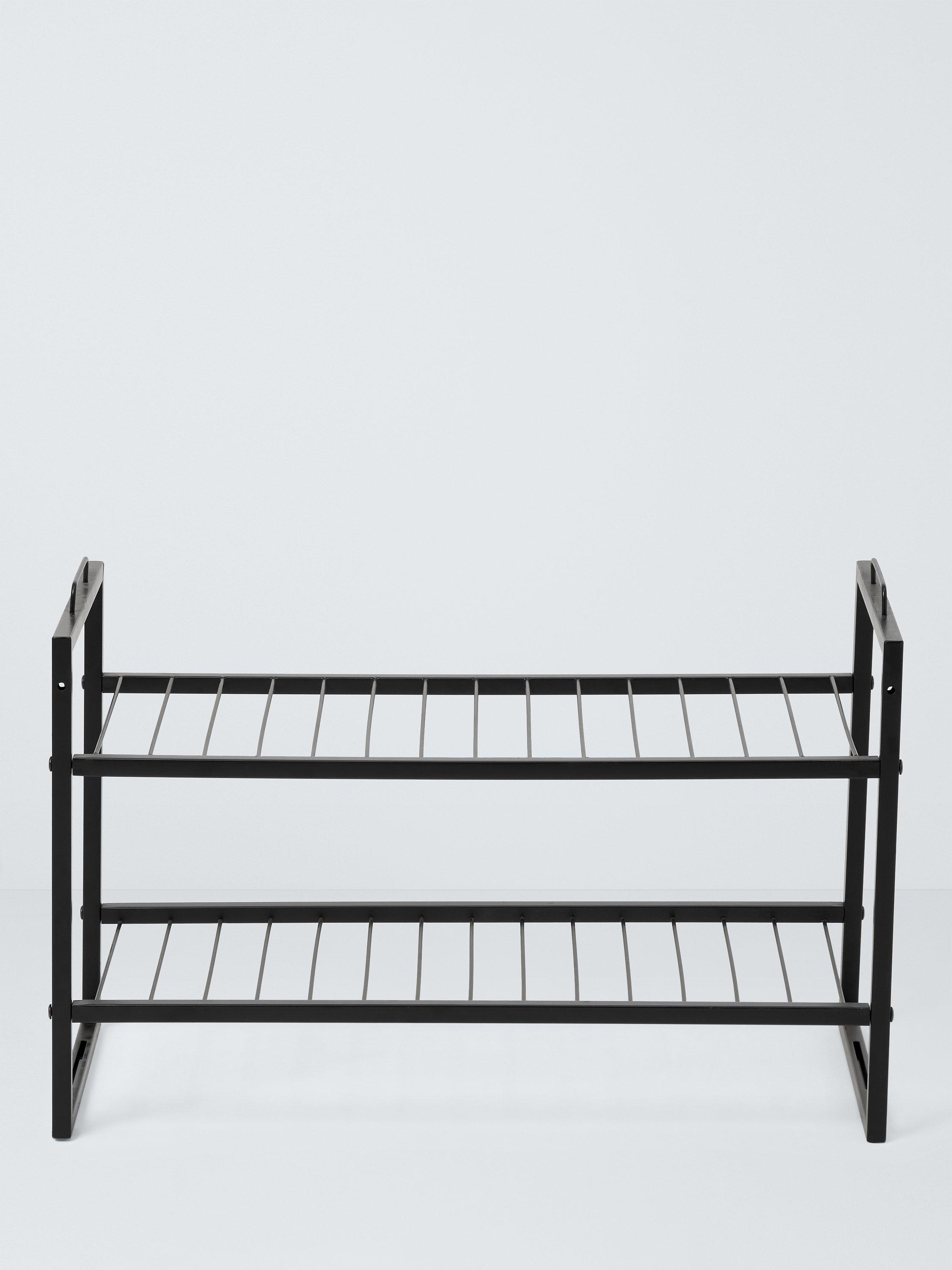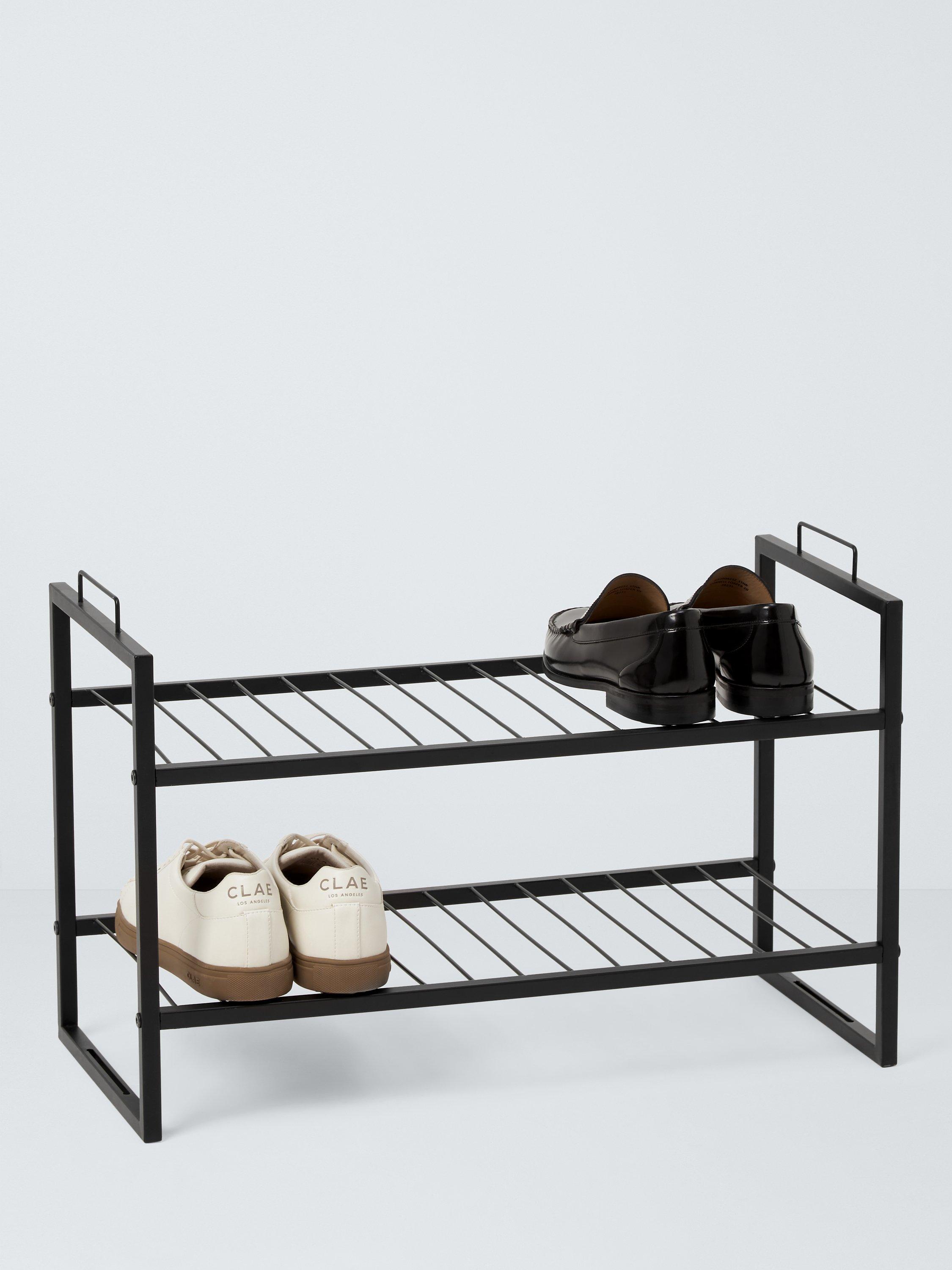 Lightweight and stackable, this tubular metal shoe rack holds up to six pairs of shoes.