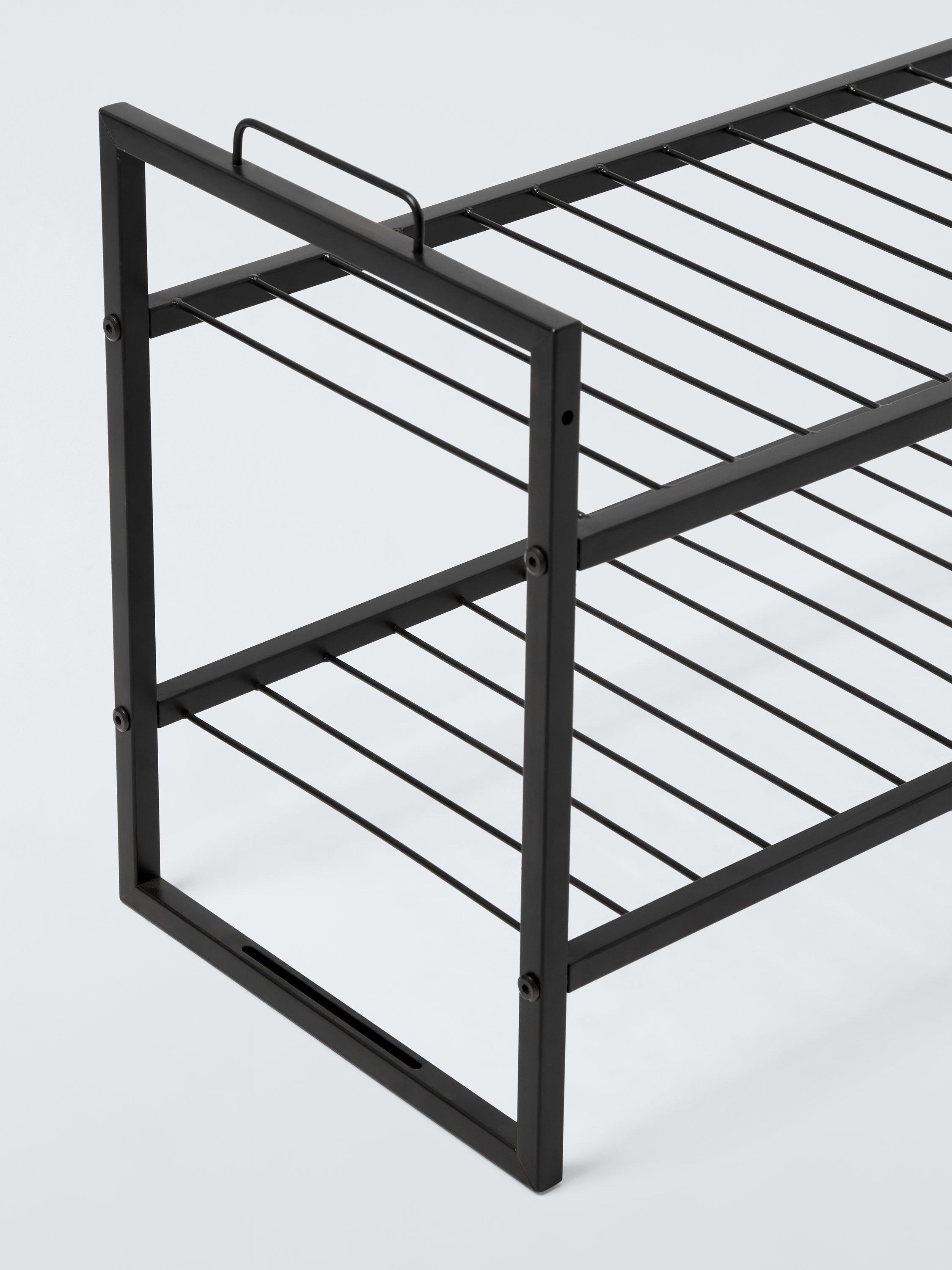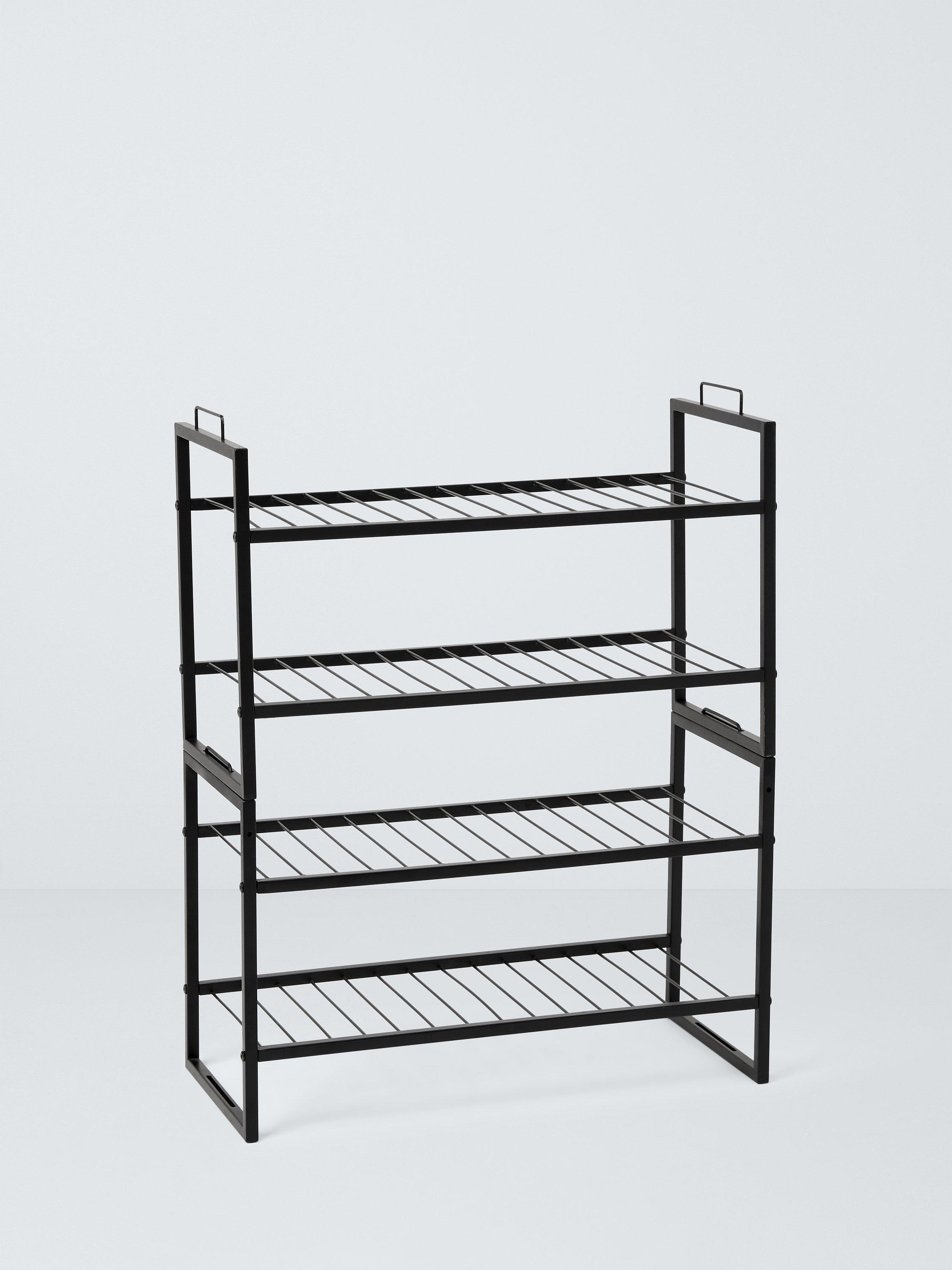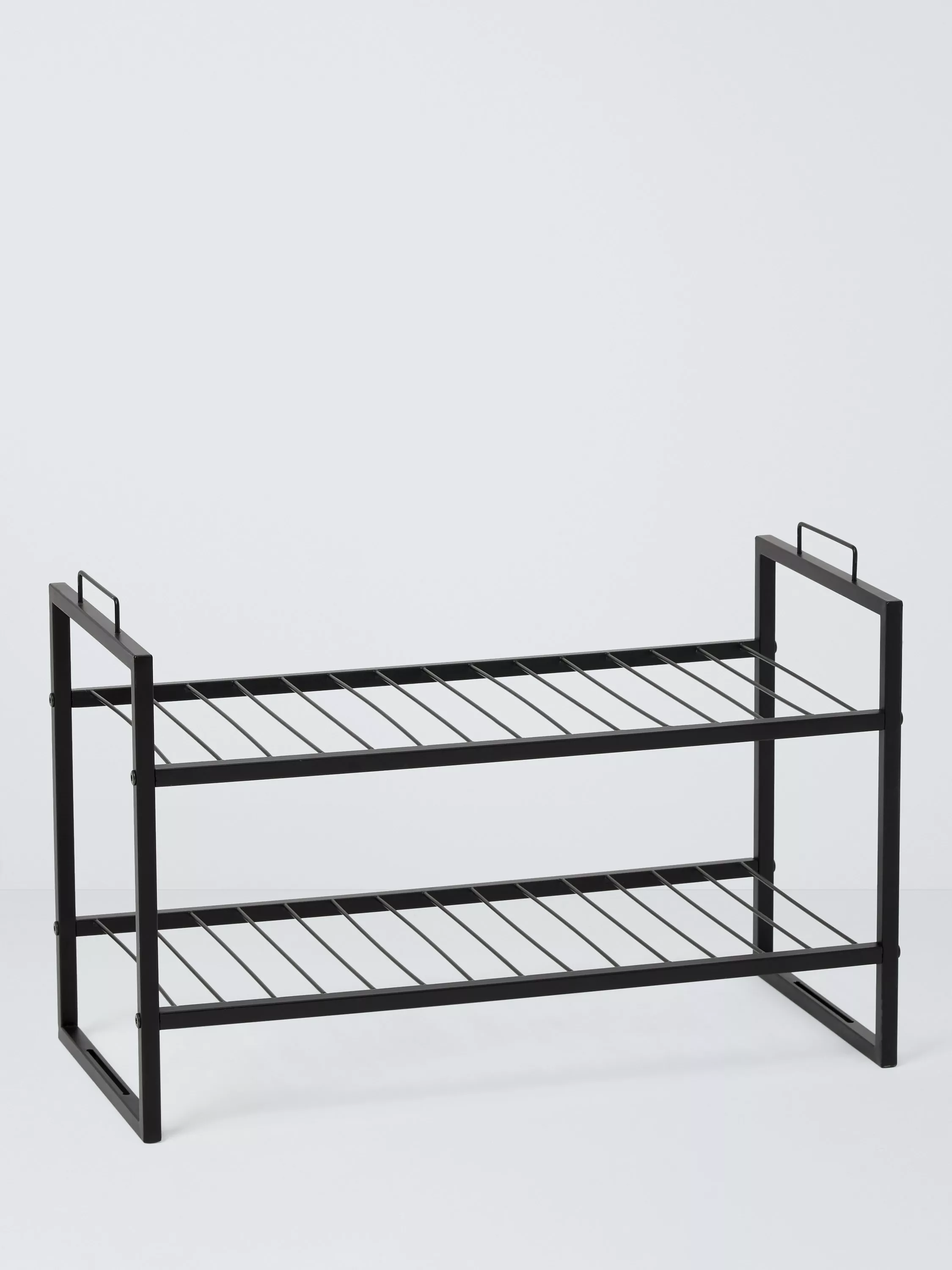 Lightweight and stackable, this tubular metal shoe rack holds up to six pairs of shoes.
