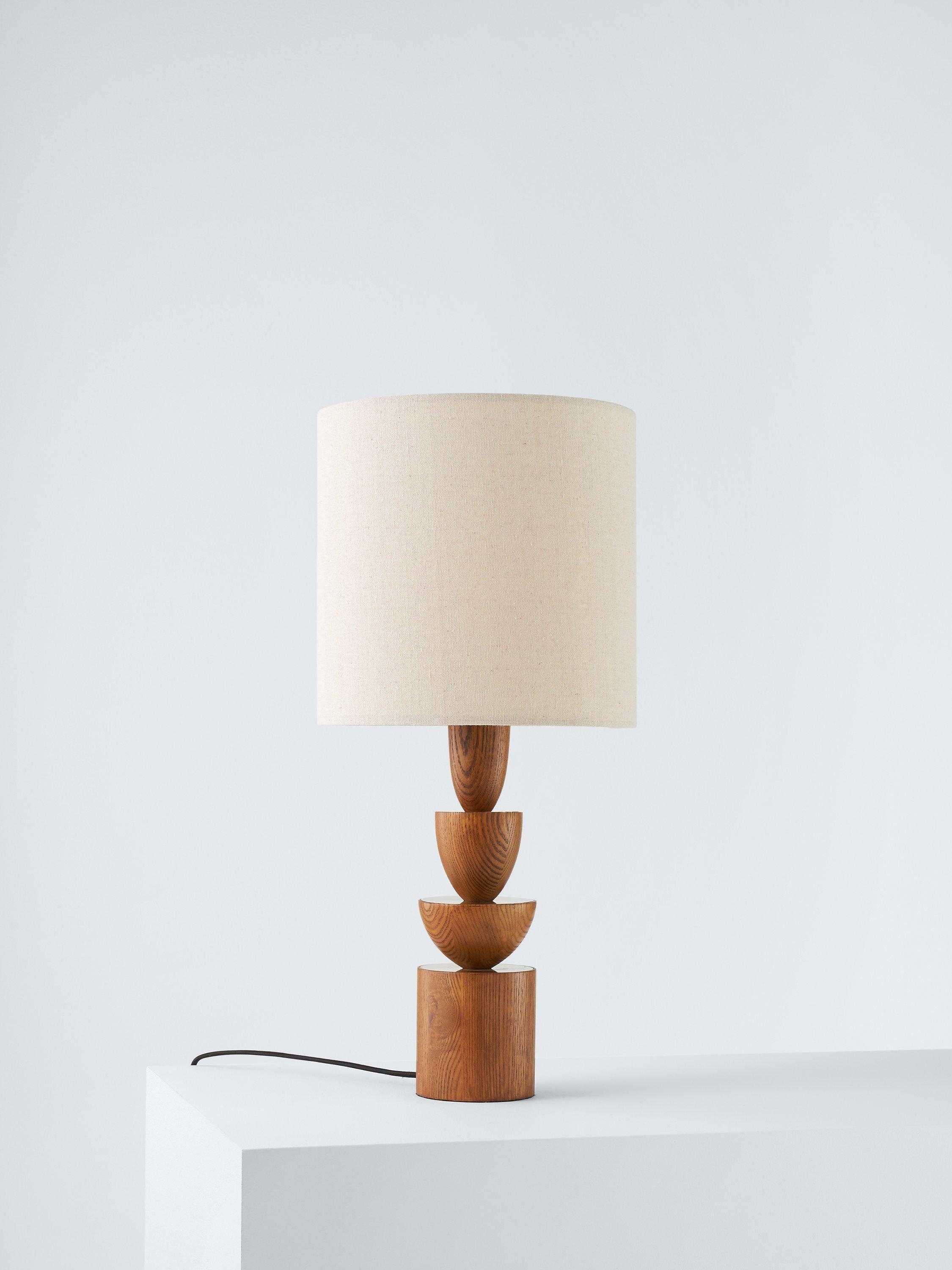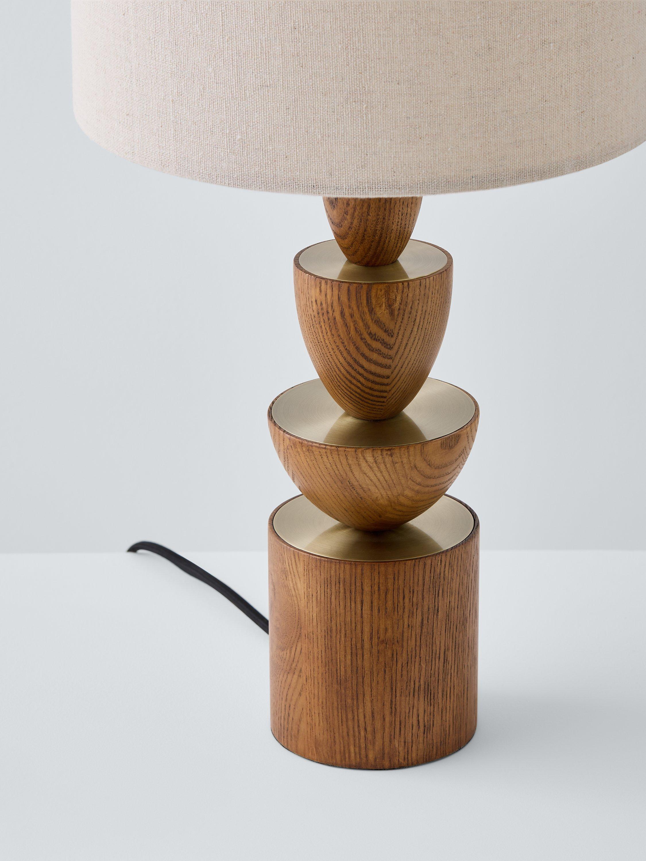 Our Stacked Wooden Table Lamp creates a unique silhouette which combines mid-century styling with a modern twist. The beautifully stained wooden base is finished with inlays of matte, brass toned metalwork adding a luxury feel. Finished with a linen fabric shade and matching flex.