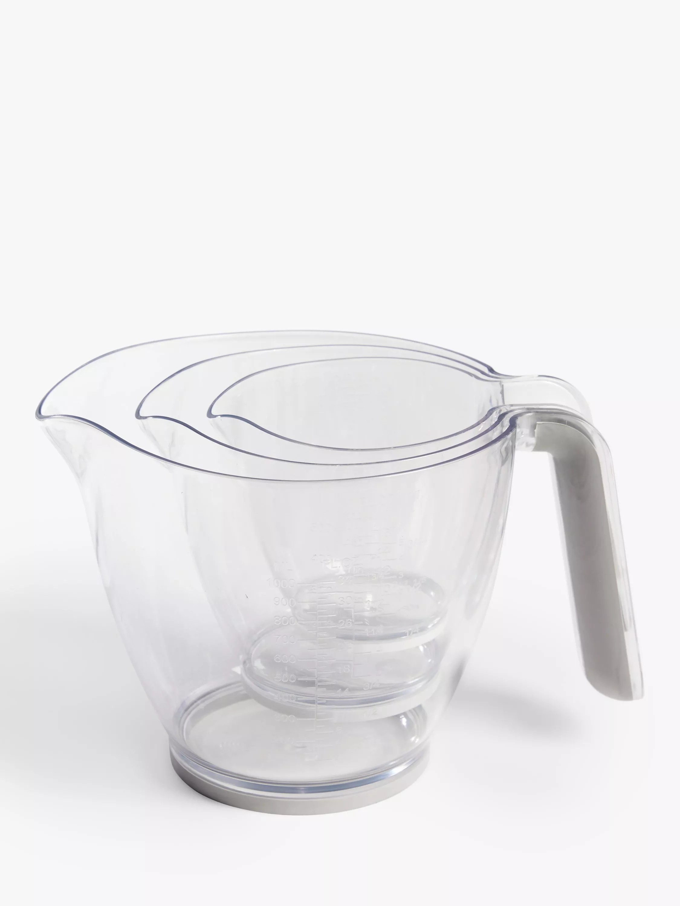 A set of plastic measuring jugs in three key sizes, for all your kitchen needs. Designed with glass-like clarity, they have soft-grip handles.