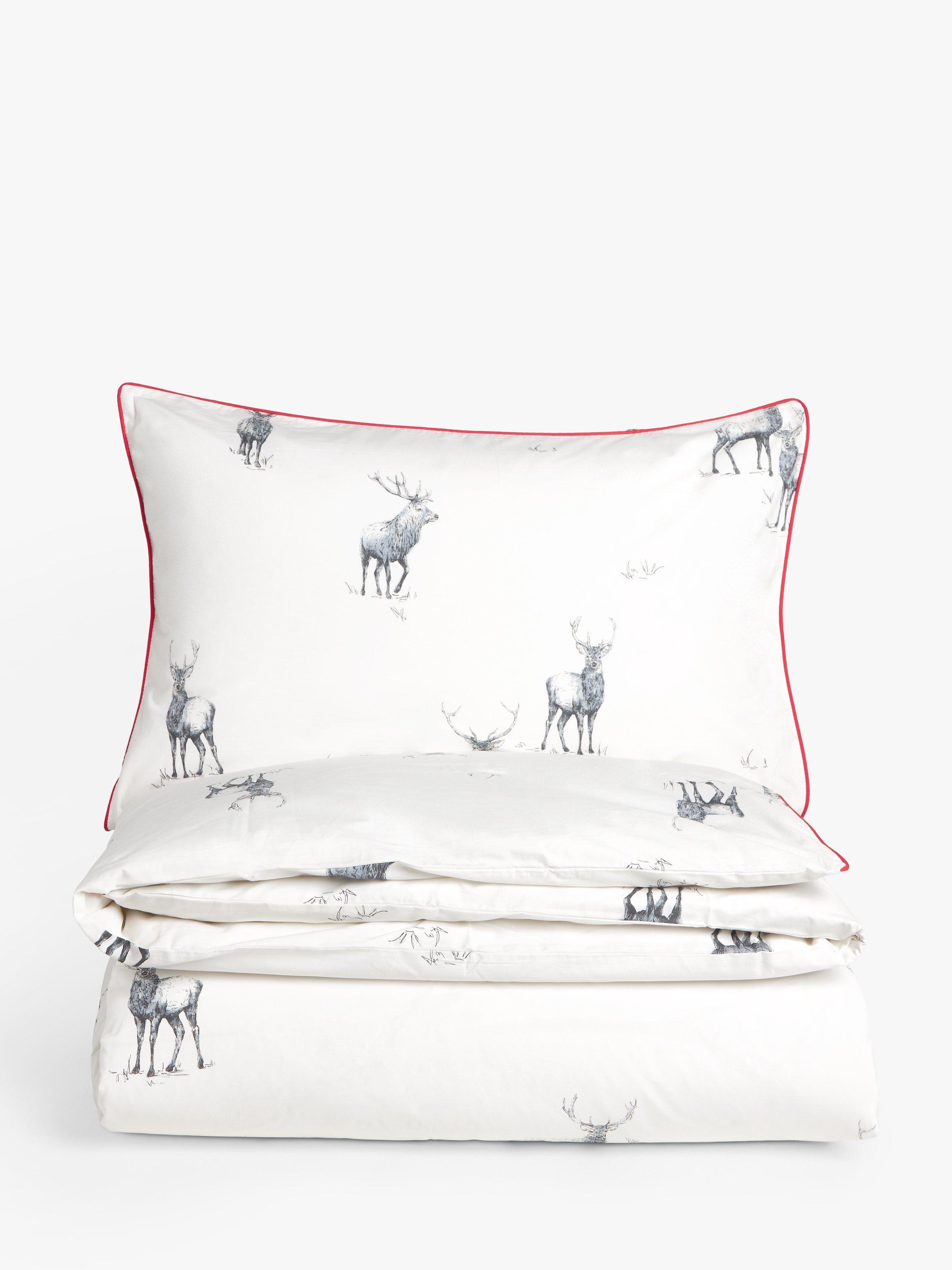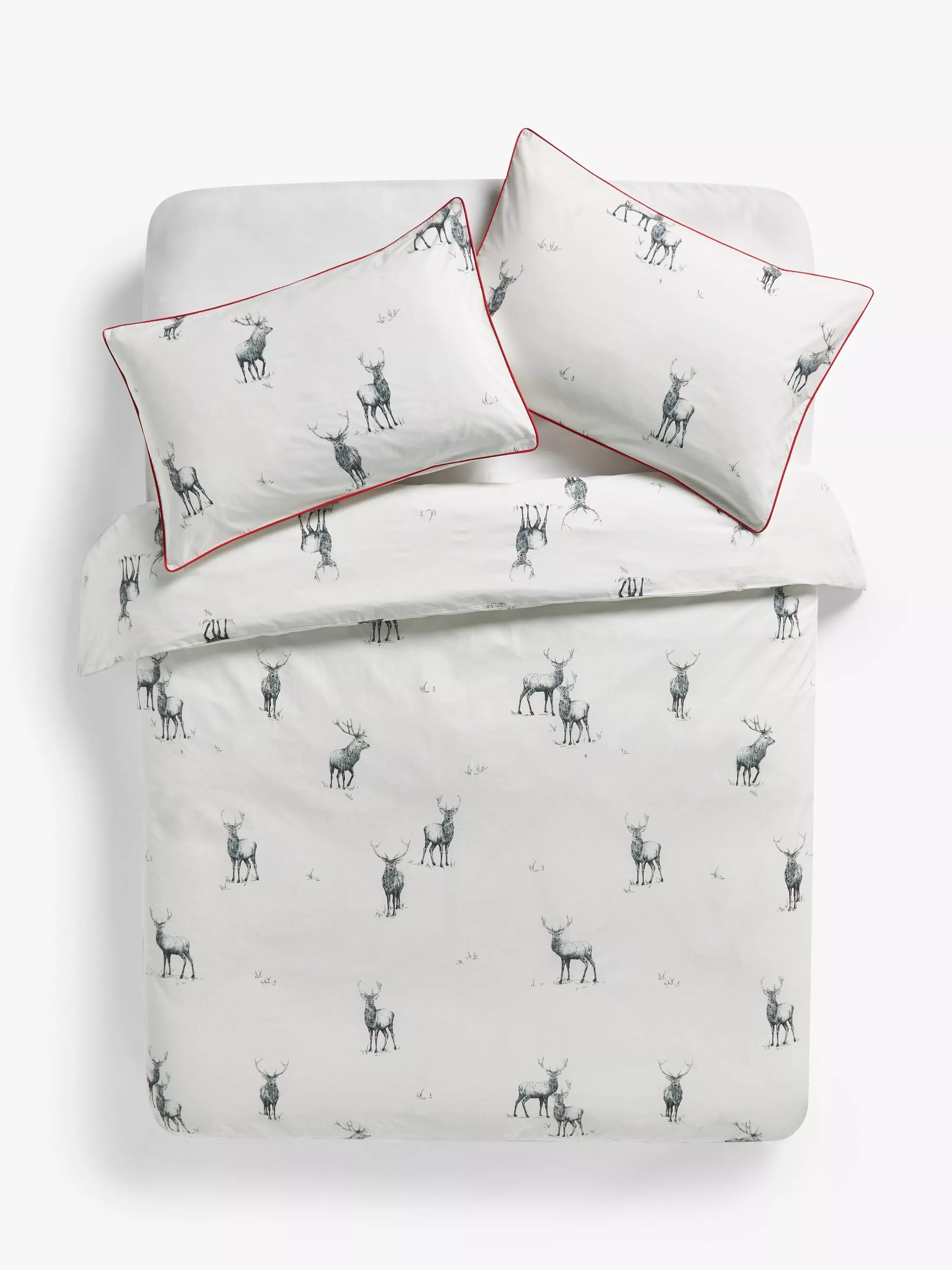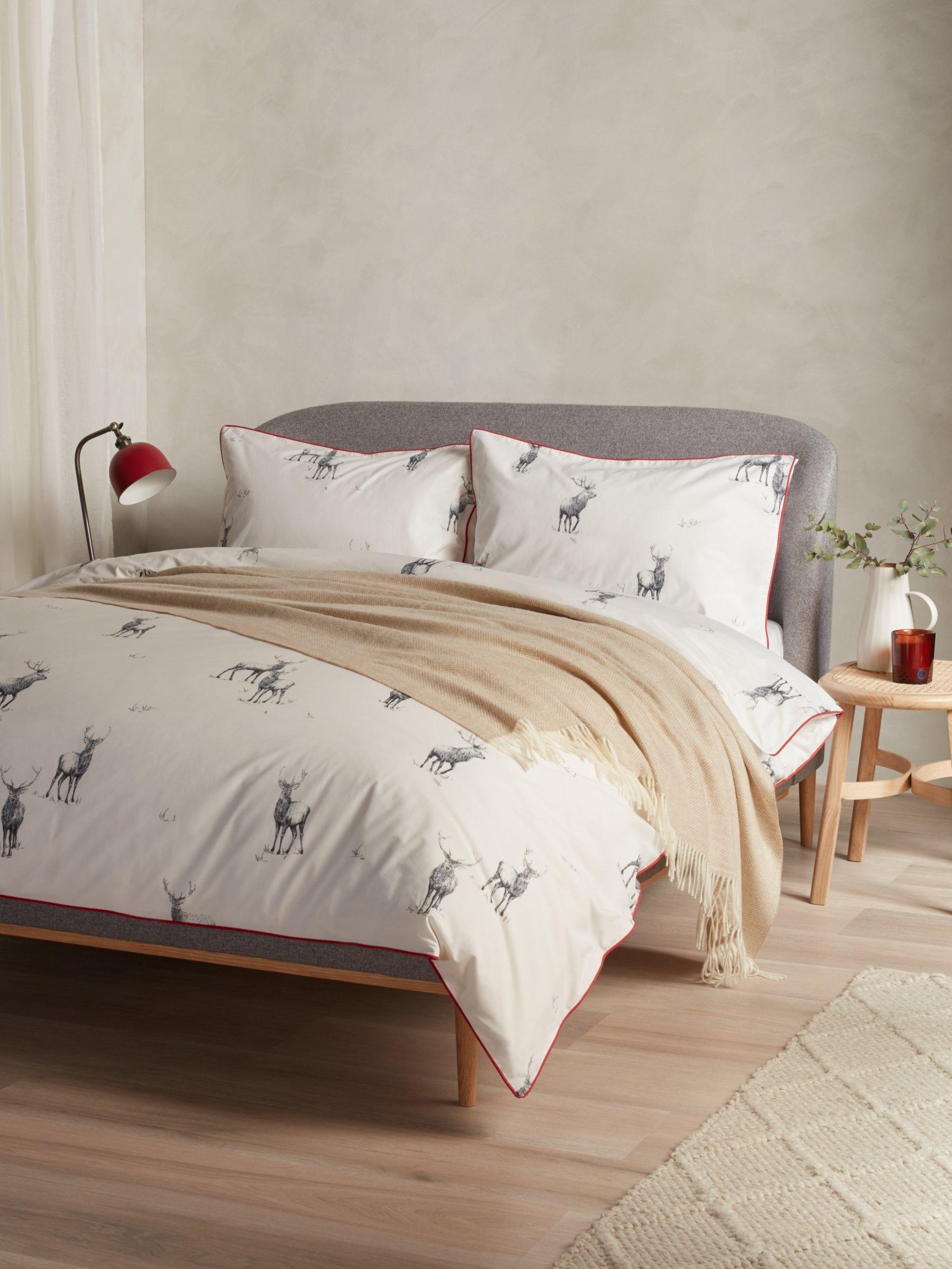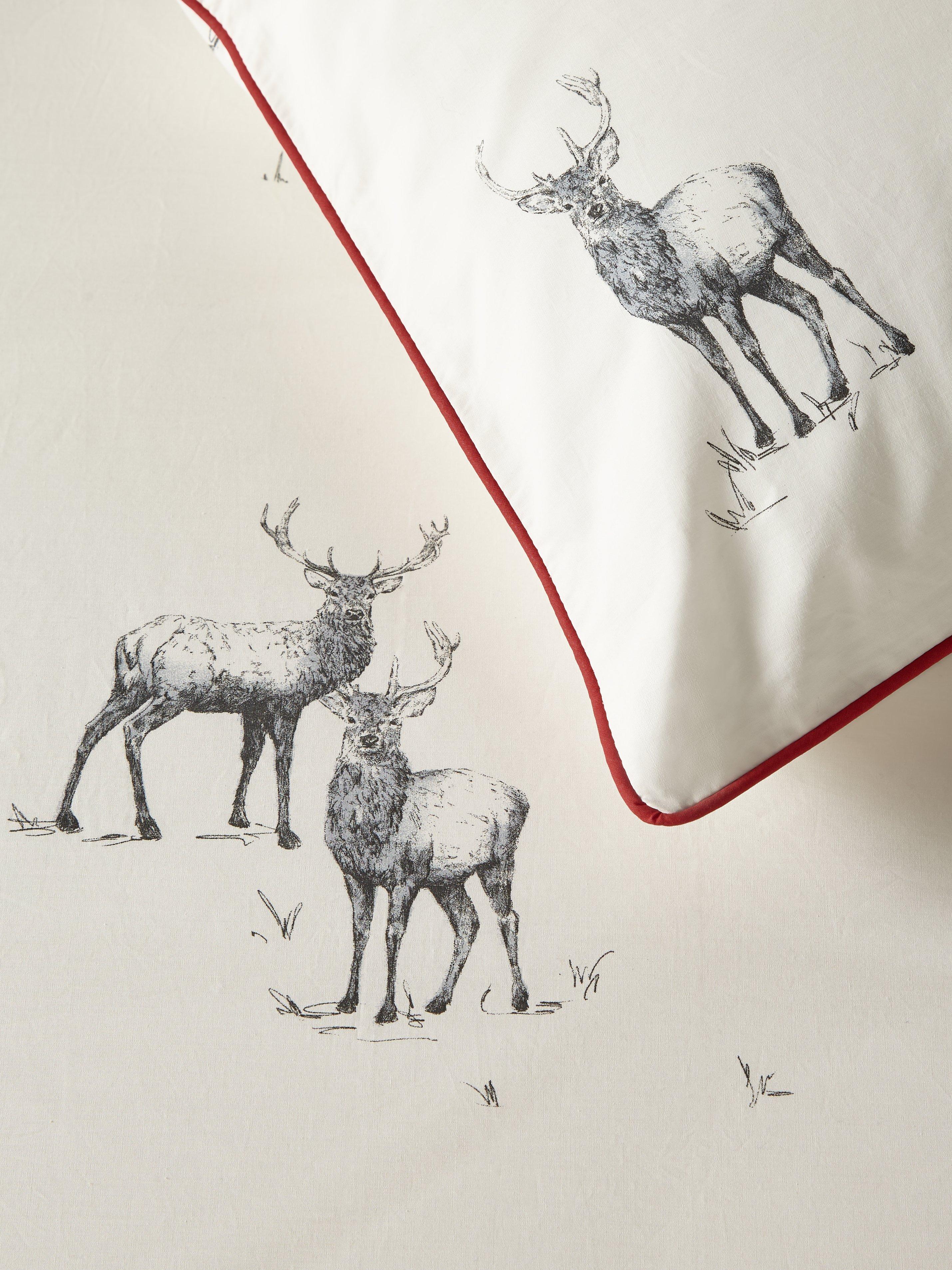 A seasonal scene with stags in winter. Rich, red piping on the duvet cover and pillowcases adds a subtle, yet festive edge.