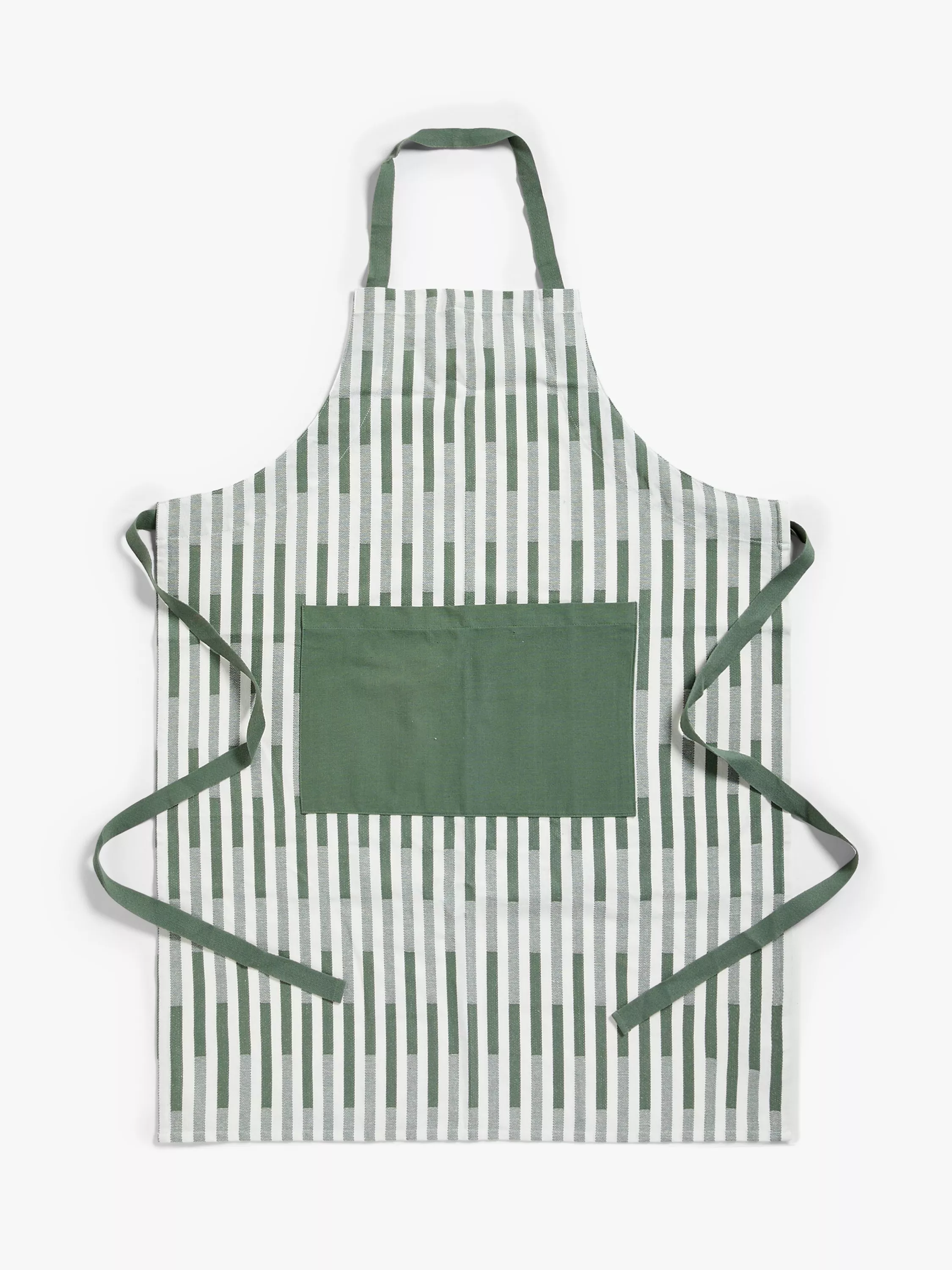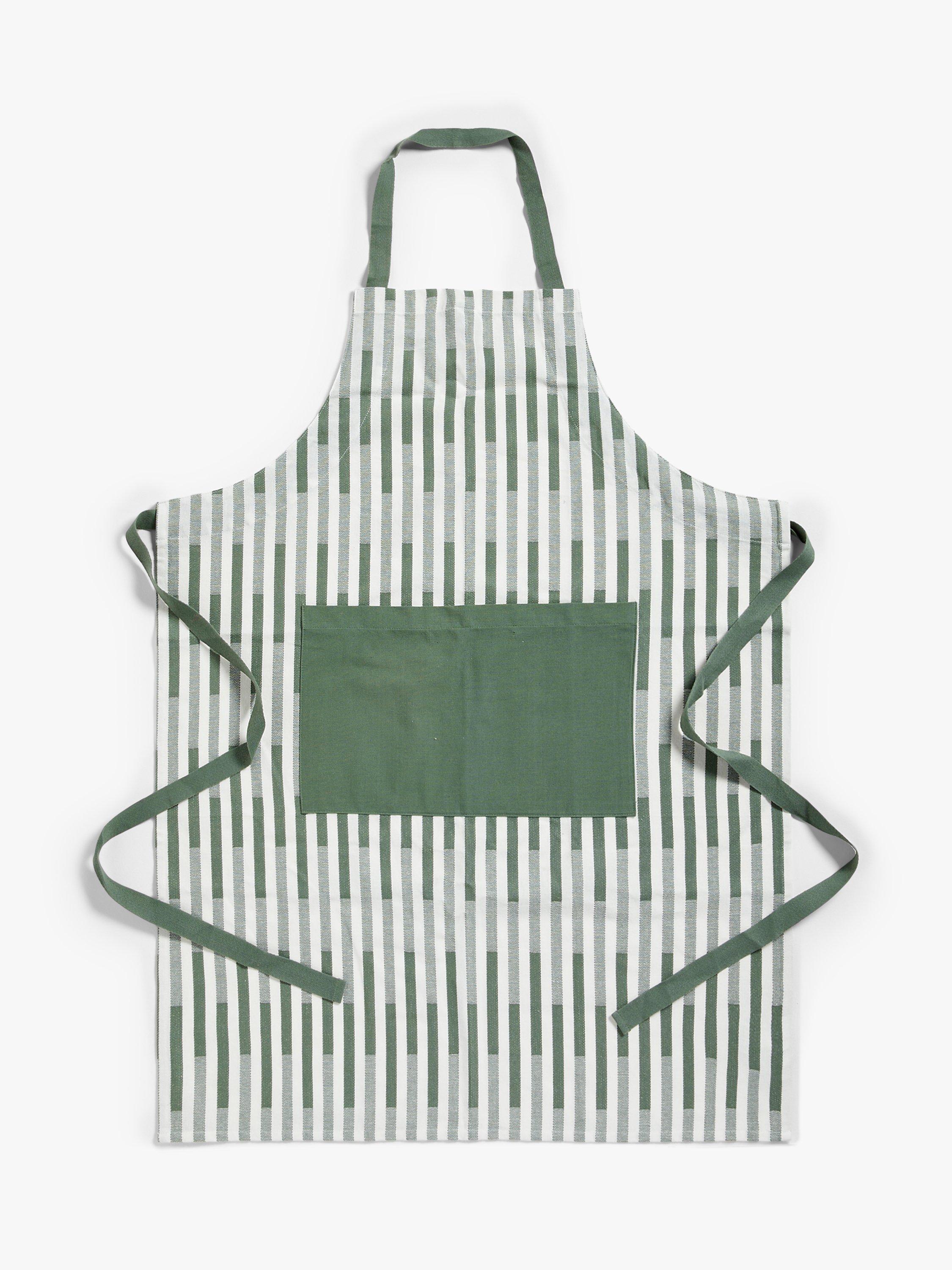 Update your cooking look with this kitchen apron covered in a contemporary striped pattern. It's designed with a neck loop, adjustable ties and a handy front pocket for stashing a phone or kitchen utensils. Made of pure cotton, it's machine washable for easy cleaning. Coordinate with other stripey kitchen textiles to match.