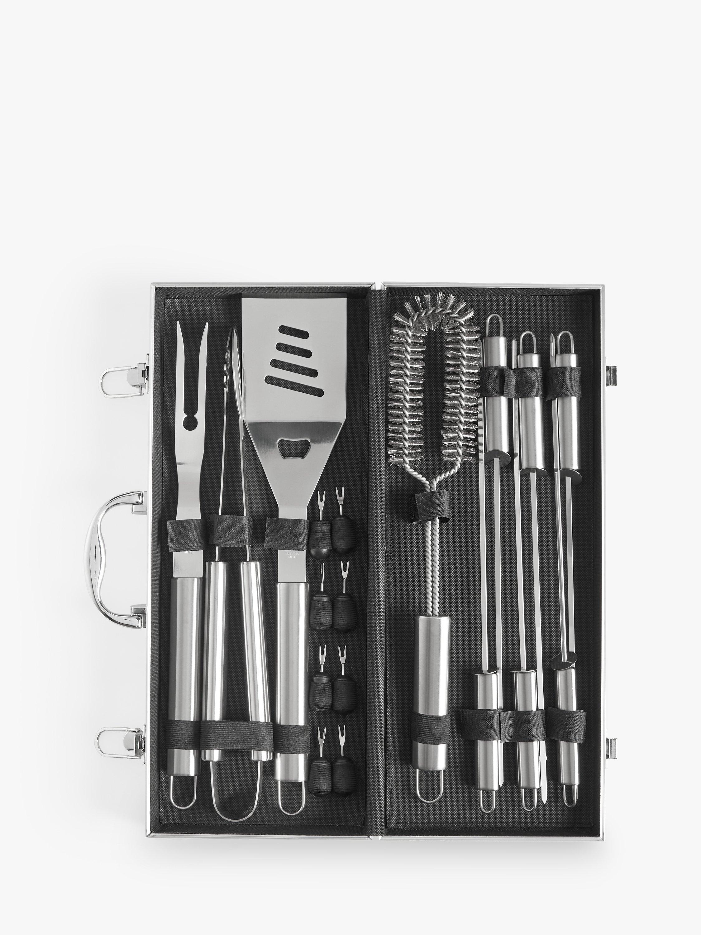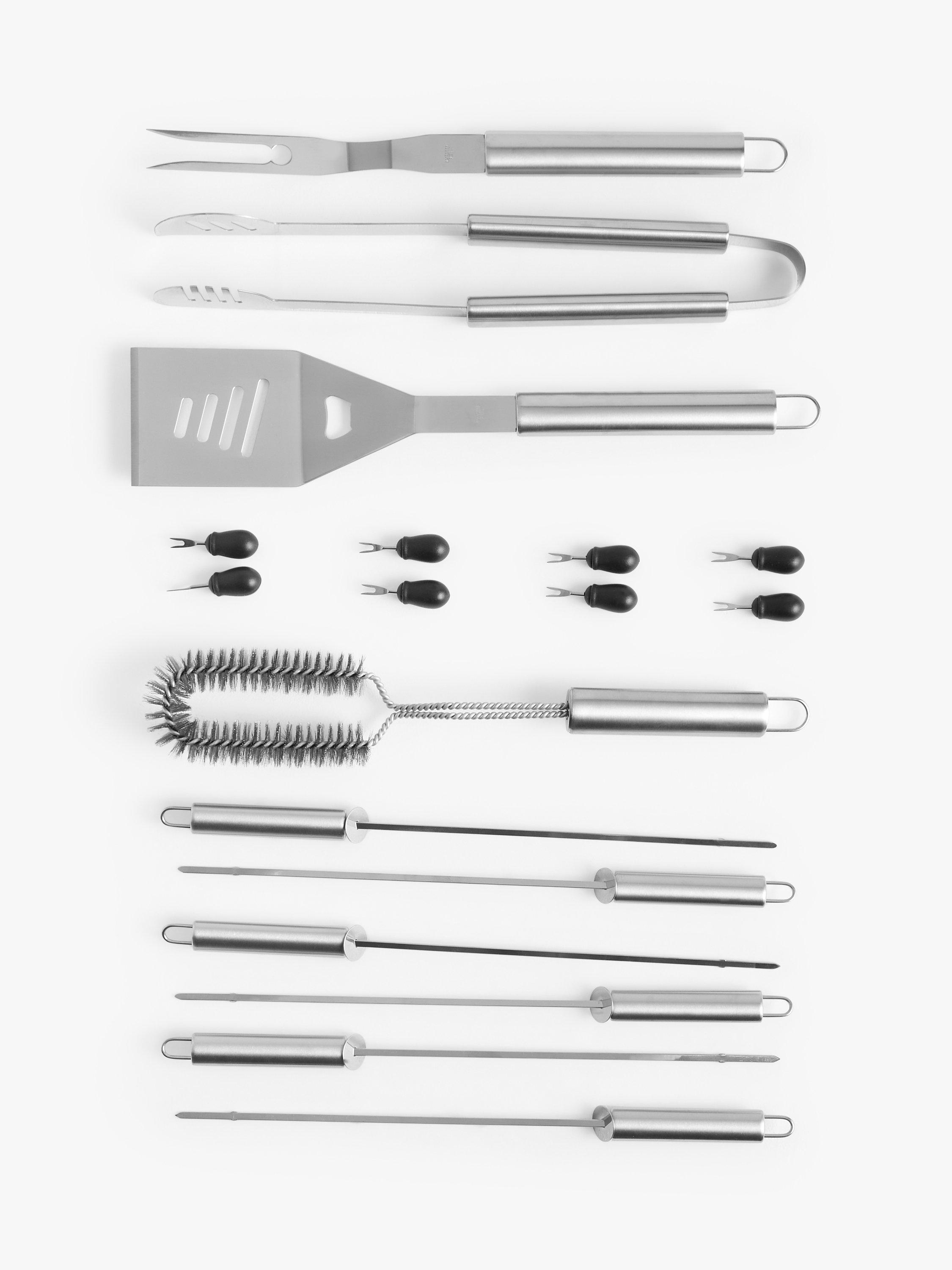Nineteen-piece set made of durable stainless steel. This boxed set includes tongs, a turner, fork and cleaning brush with six skewers and eight corn cob holders. Dishwasher safe for easy cleaning.
