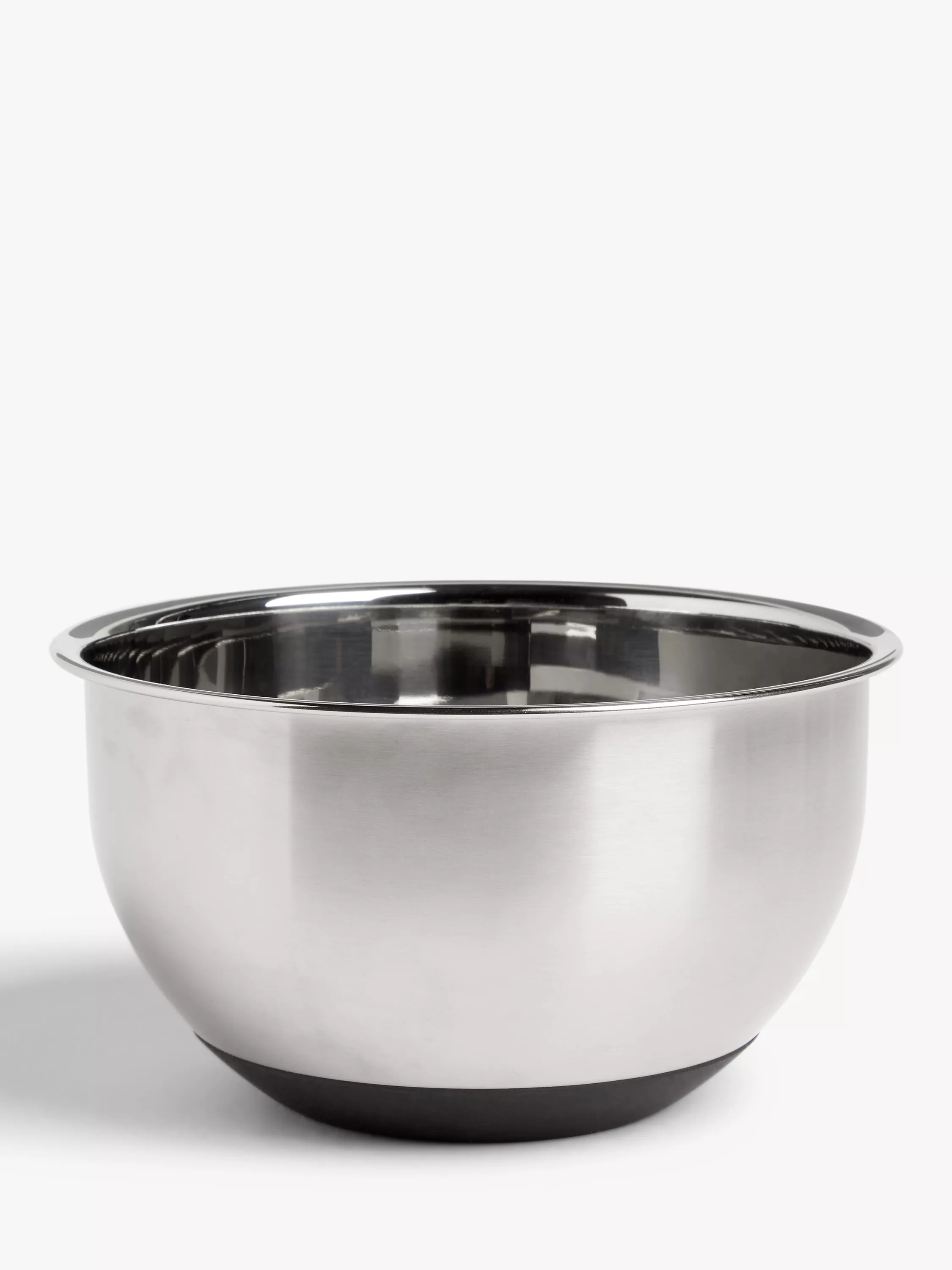 Made of durable stainless steel, this large mixing bowl has a non-slip base to make mixing easier. For compact storage, it nests together with the smaller size, sold separately.