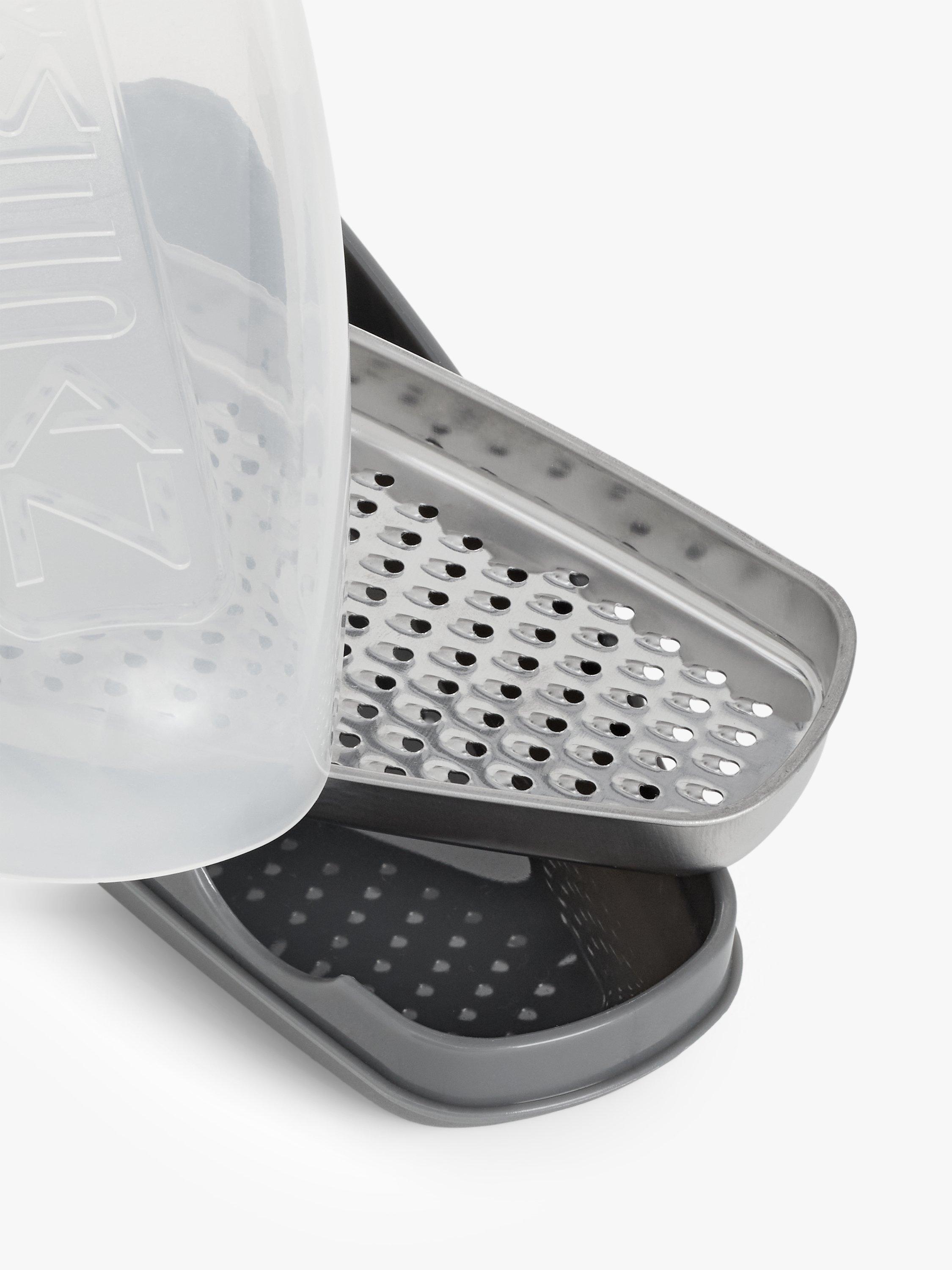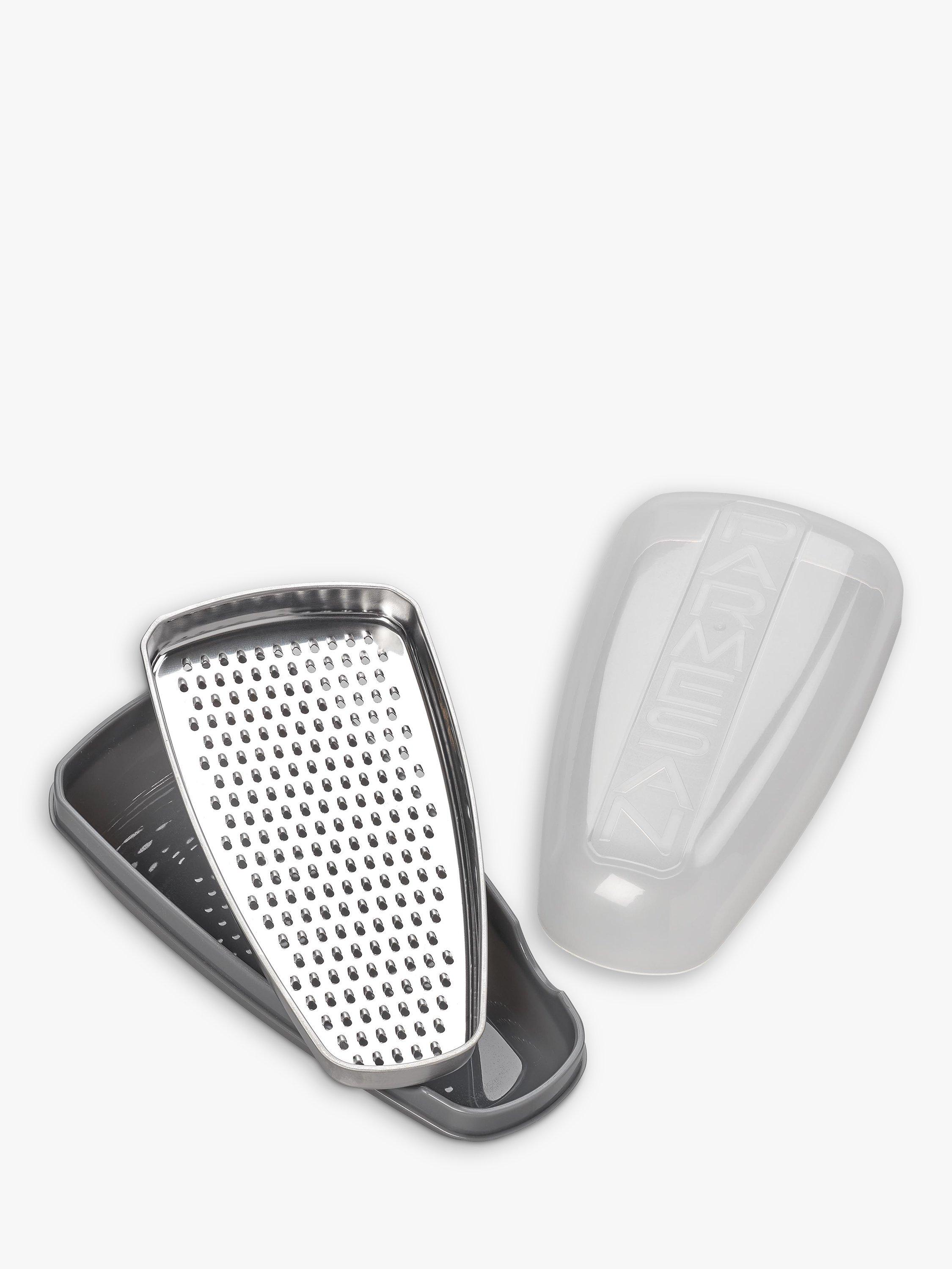 Made with sharp stainless steel blades, this gadget efficiently grates hard cheeses and captures each piece in the attached food-safe plastic container. Store the container in the fridge until it's time to add cheese to a recipe or serve it at the table. The plastic lid fits neatly over the grater and is embossed with 'Parmesan' on the front.