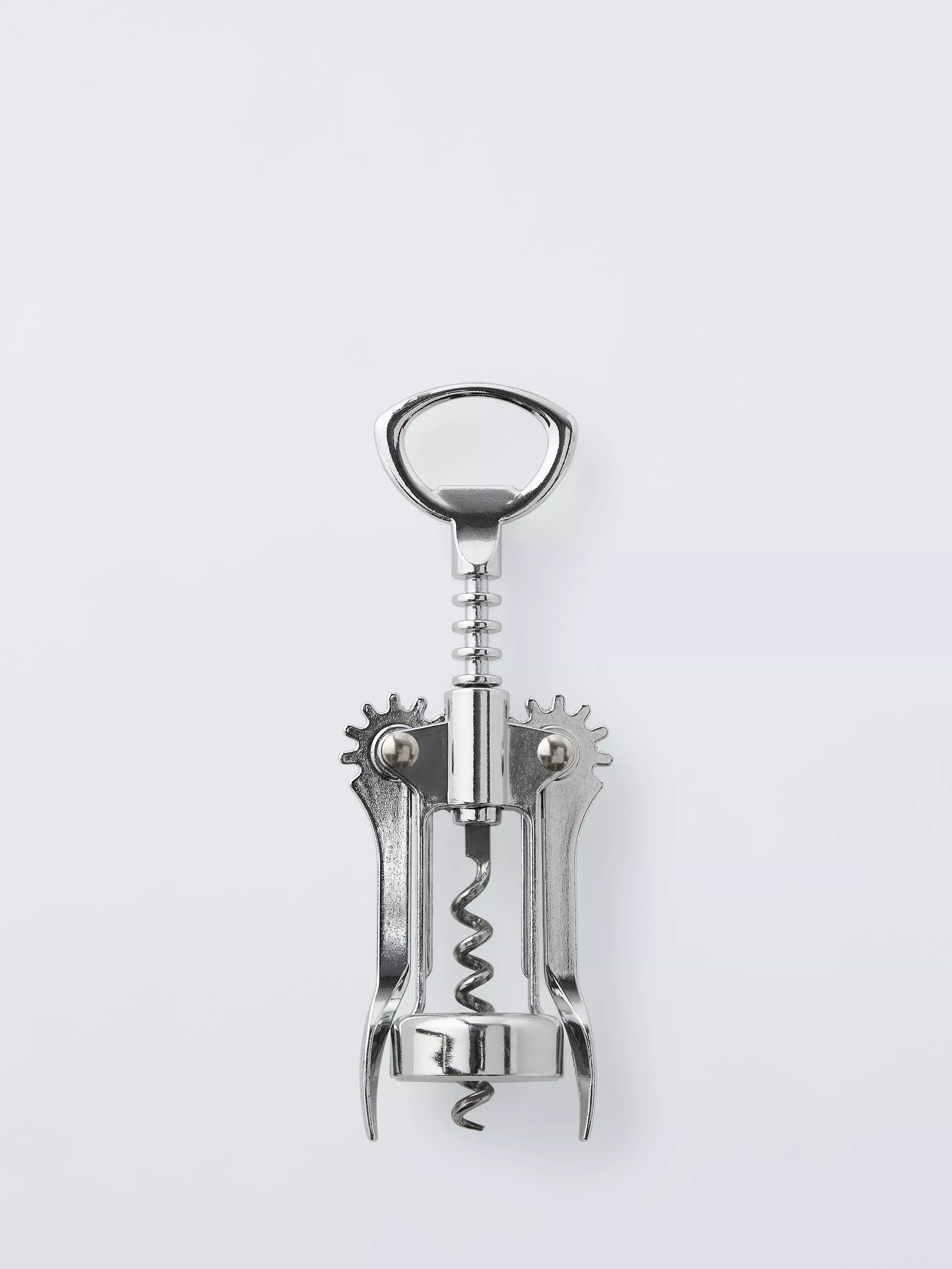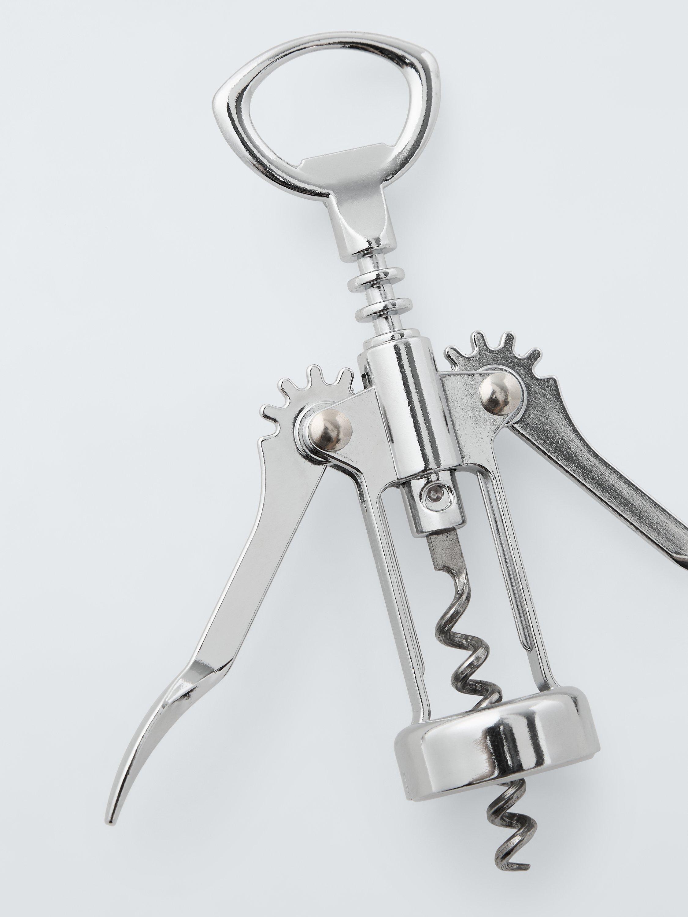 Corkscrew with winged levers to remove the stopping cork from wine bottles in one smooth motion. Made of durable stainless steel, it features an integrated bottle opener. Dishwasher-safe for easy cleaning.