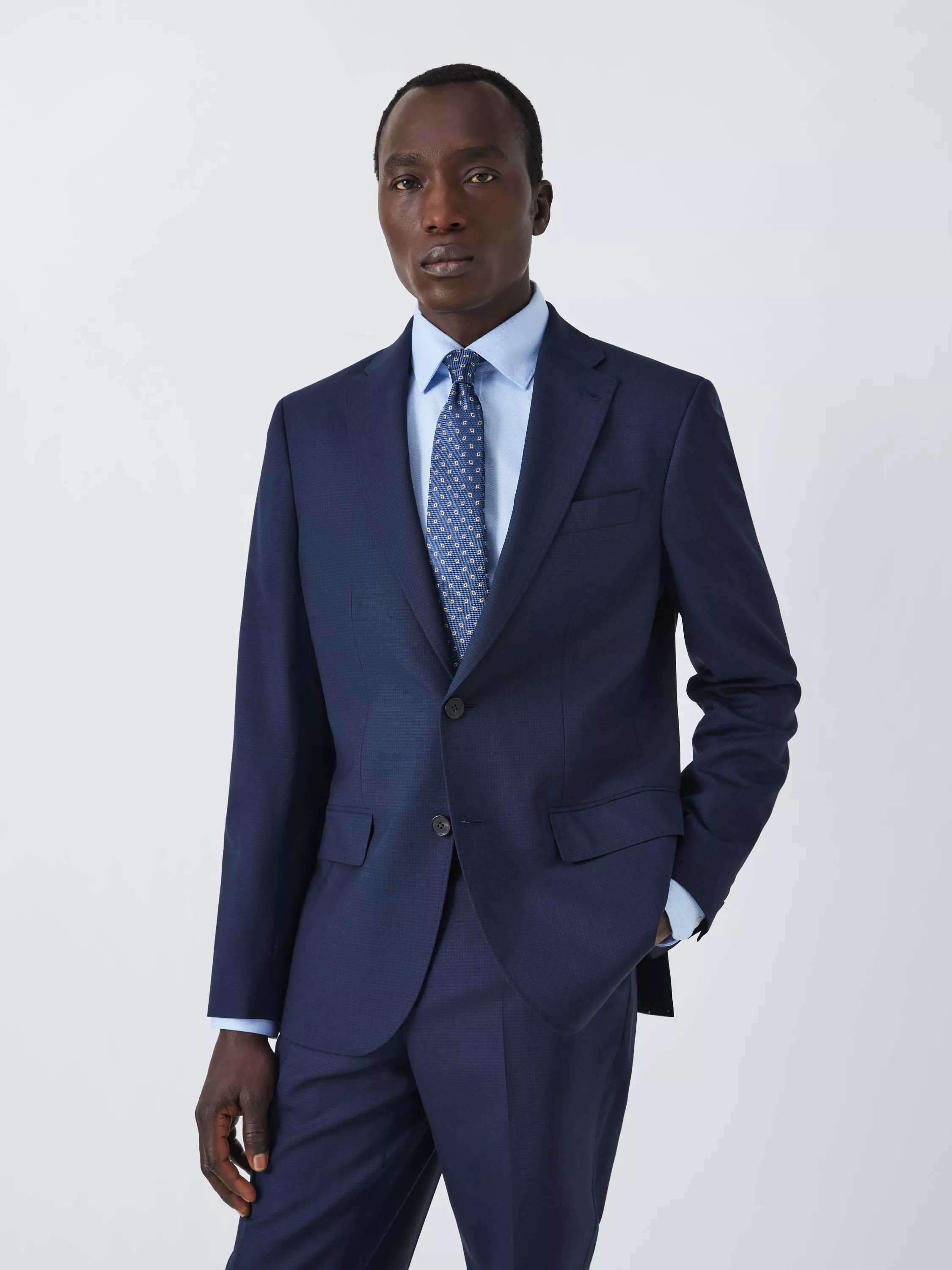 A navy grid pattern blazer tailored to our regular fit specification. Styled with notch lapel, flap pockets and a welt chest pocket.