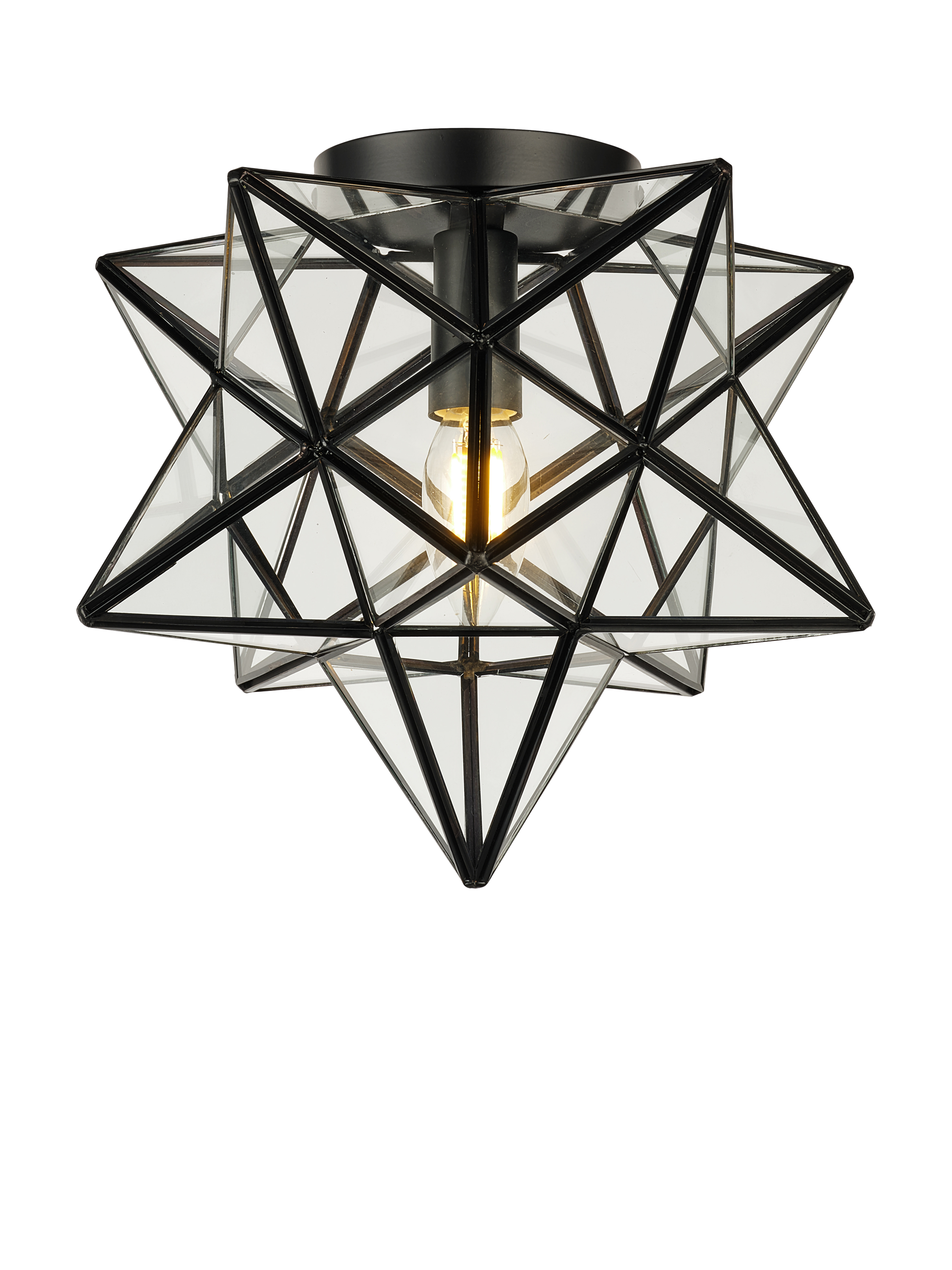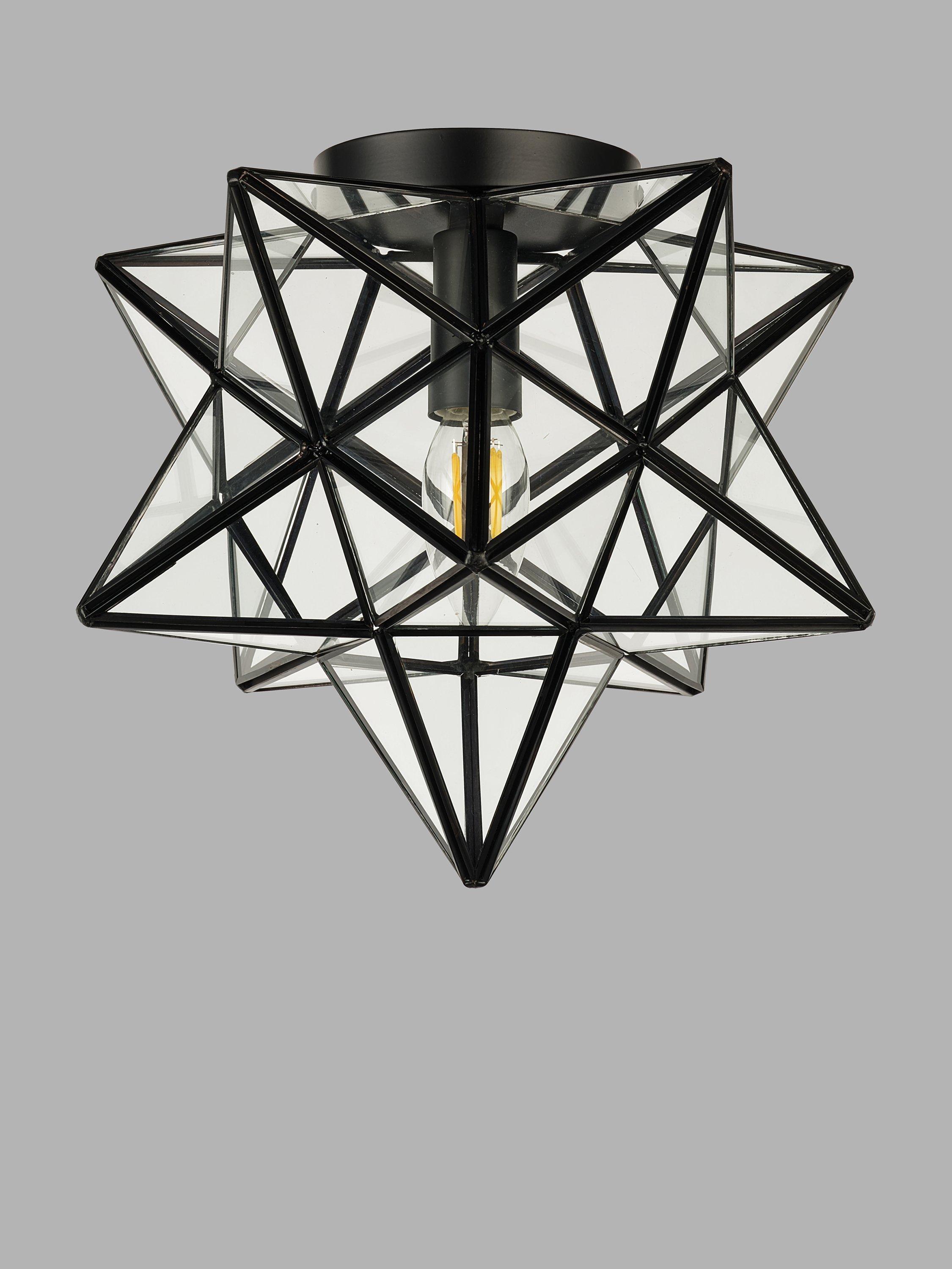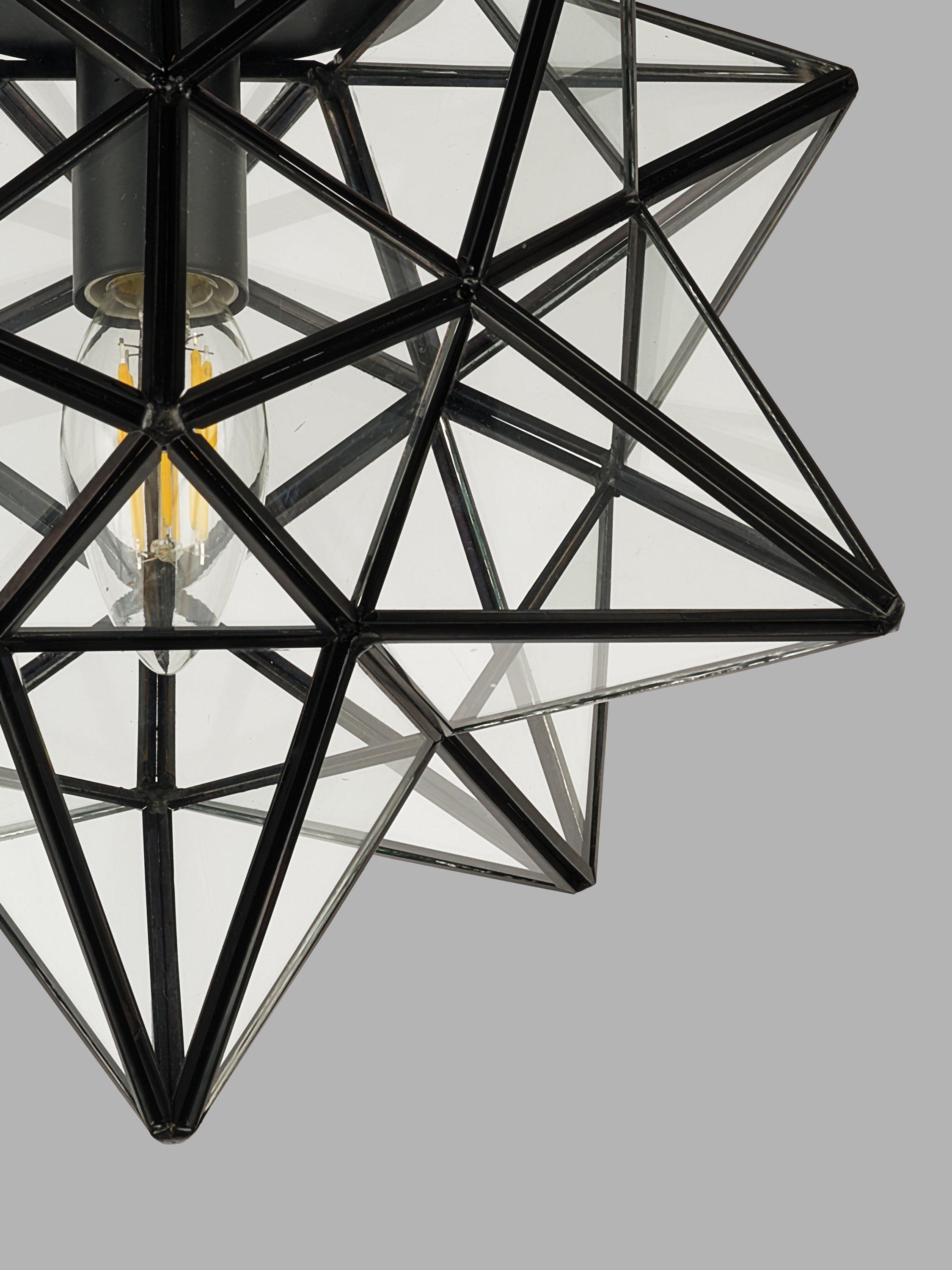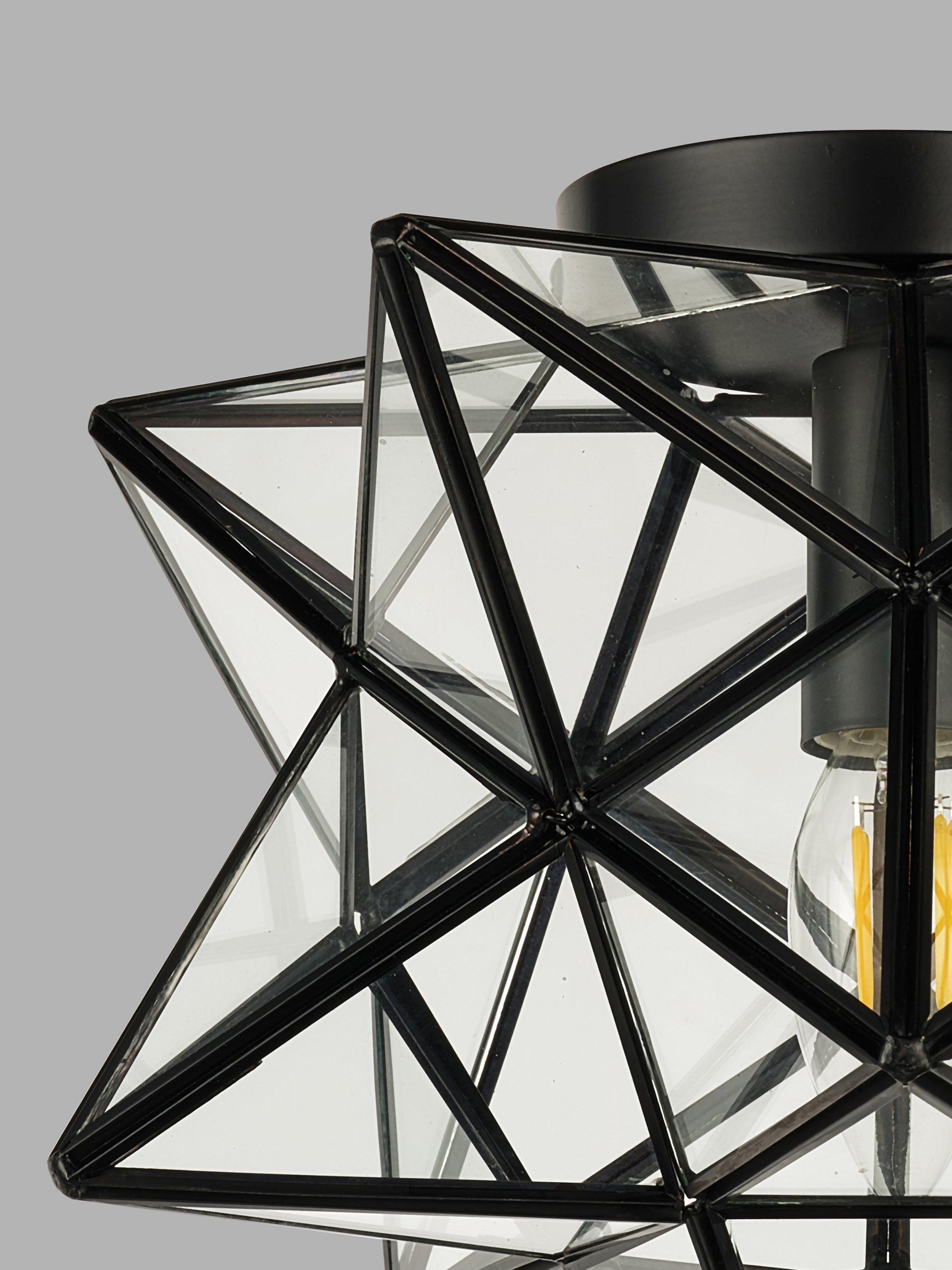 Add a touch of contemporary sophistication to your space with this semi-flush-mount ceiling light in a striking star shape. Featuring a handcrafted geometric metal frame with clear glass panels, this fixture blends vintage charm with modern elegance. Its unique star-shaped design makes it a statement piece for entryways, hallways, bedrooms or dining areas.