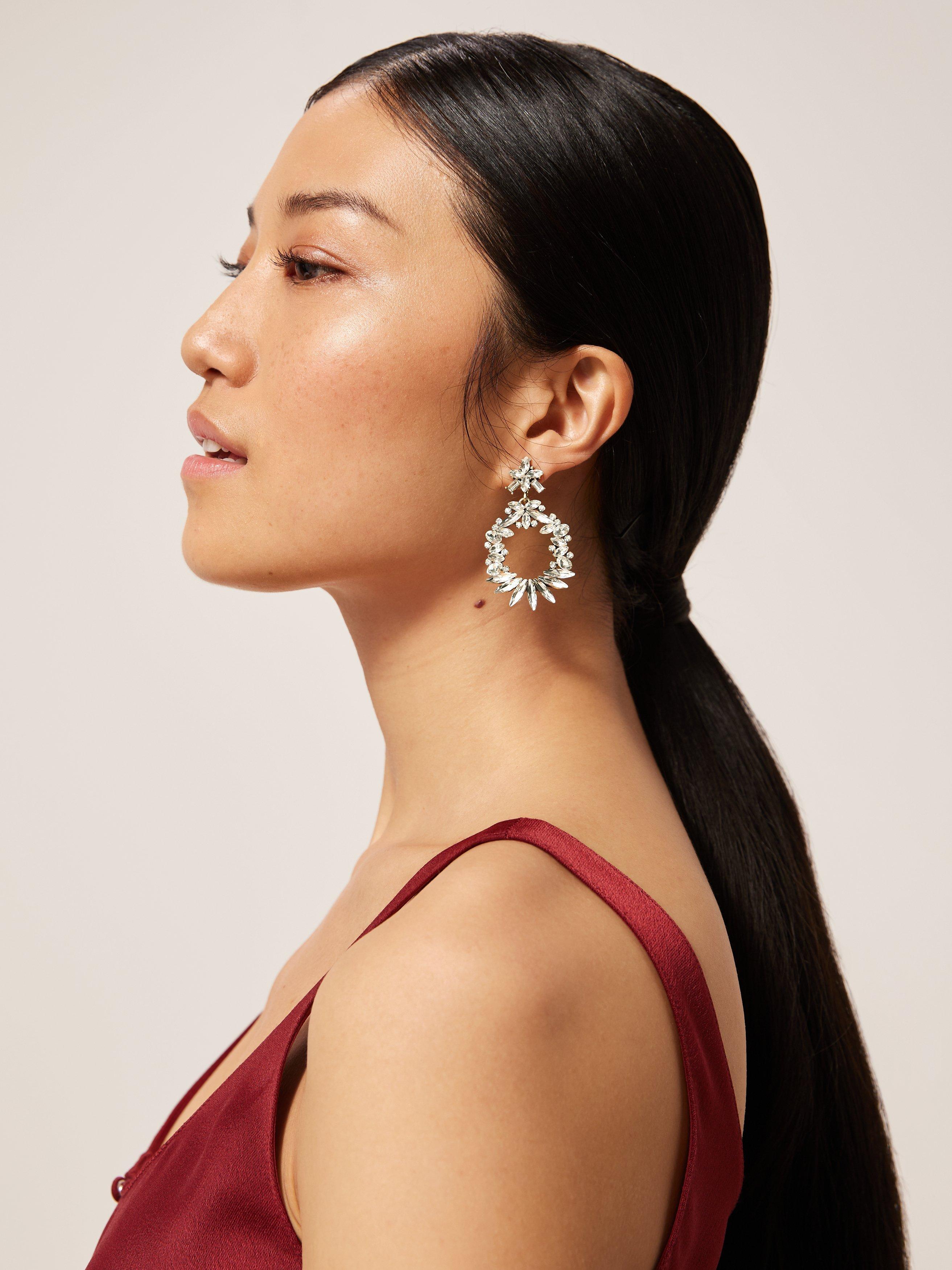 A statement piece that embodies sophistication and glamour, we designed this drop earrings in a circular style with sparkling jewel detailing.