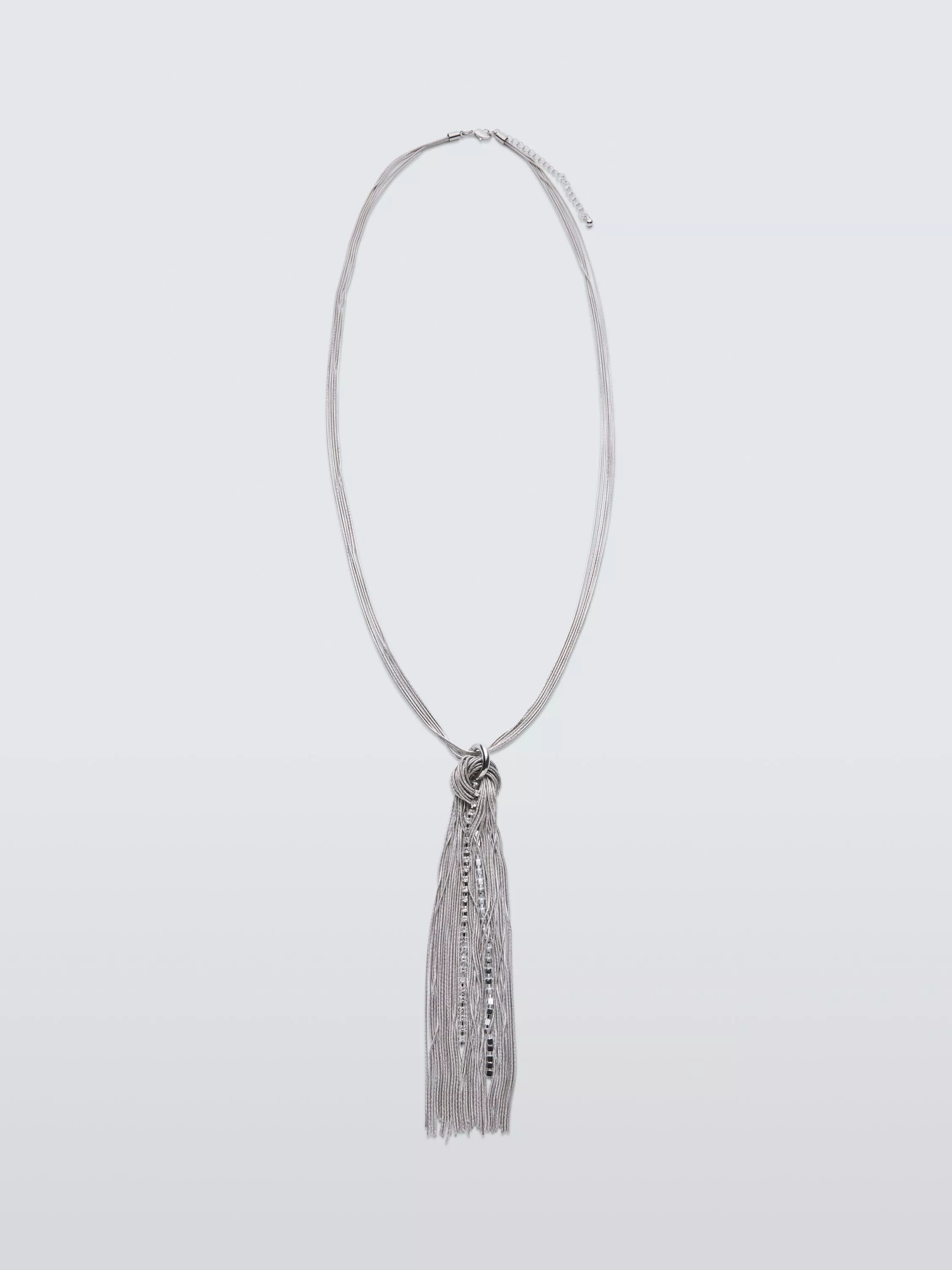 Blending glass gems with sleek iron and brass for a striking finish - a statement multi chain knotted tassel drop necklace. It benefits from a classic lobster claw clasp for a secure fit.